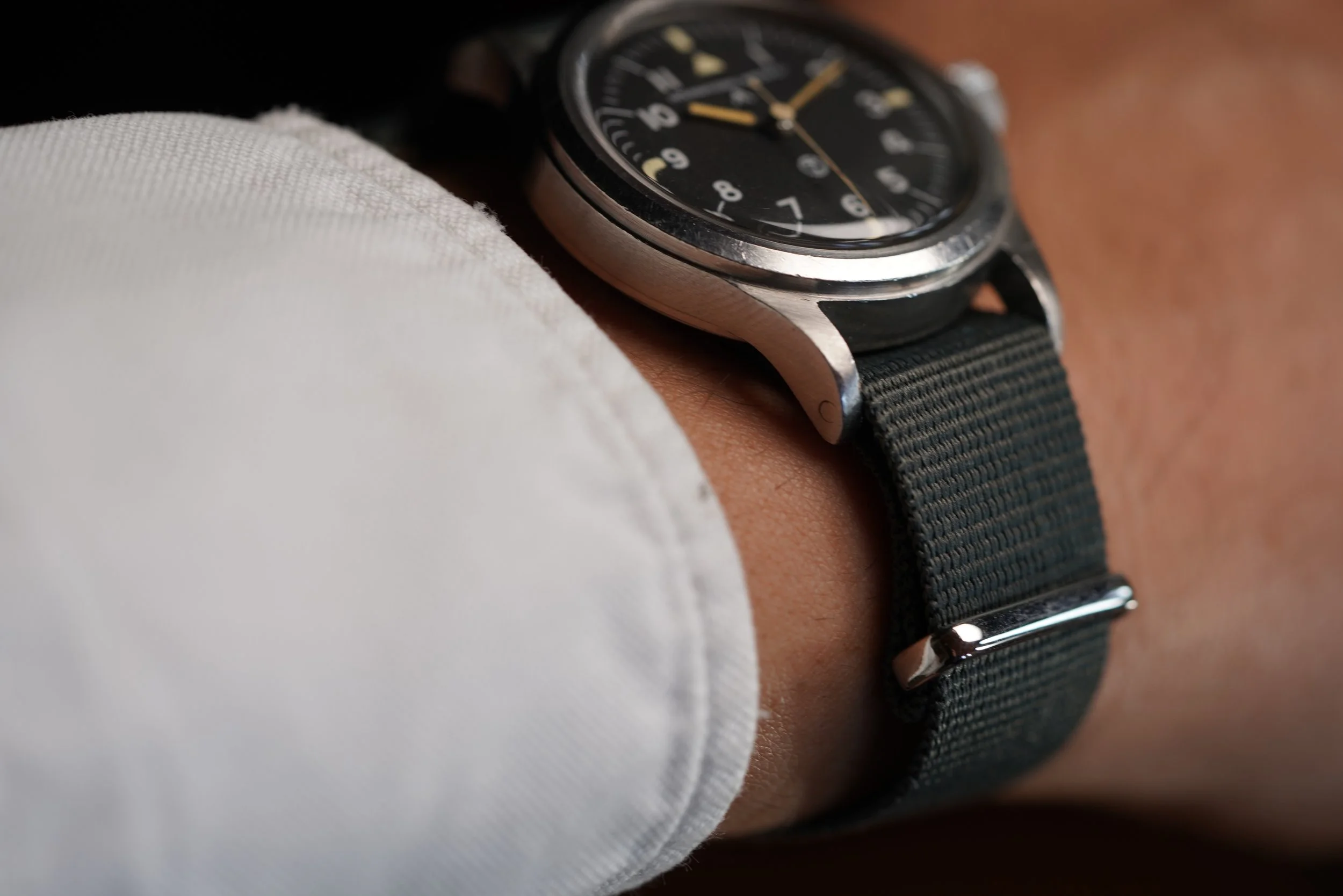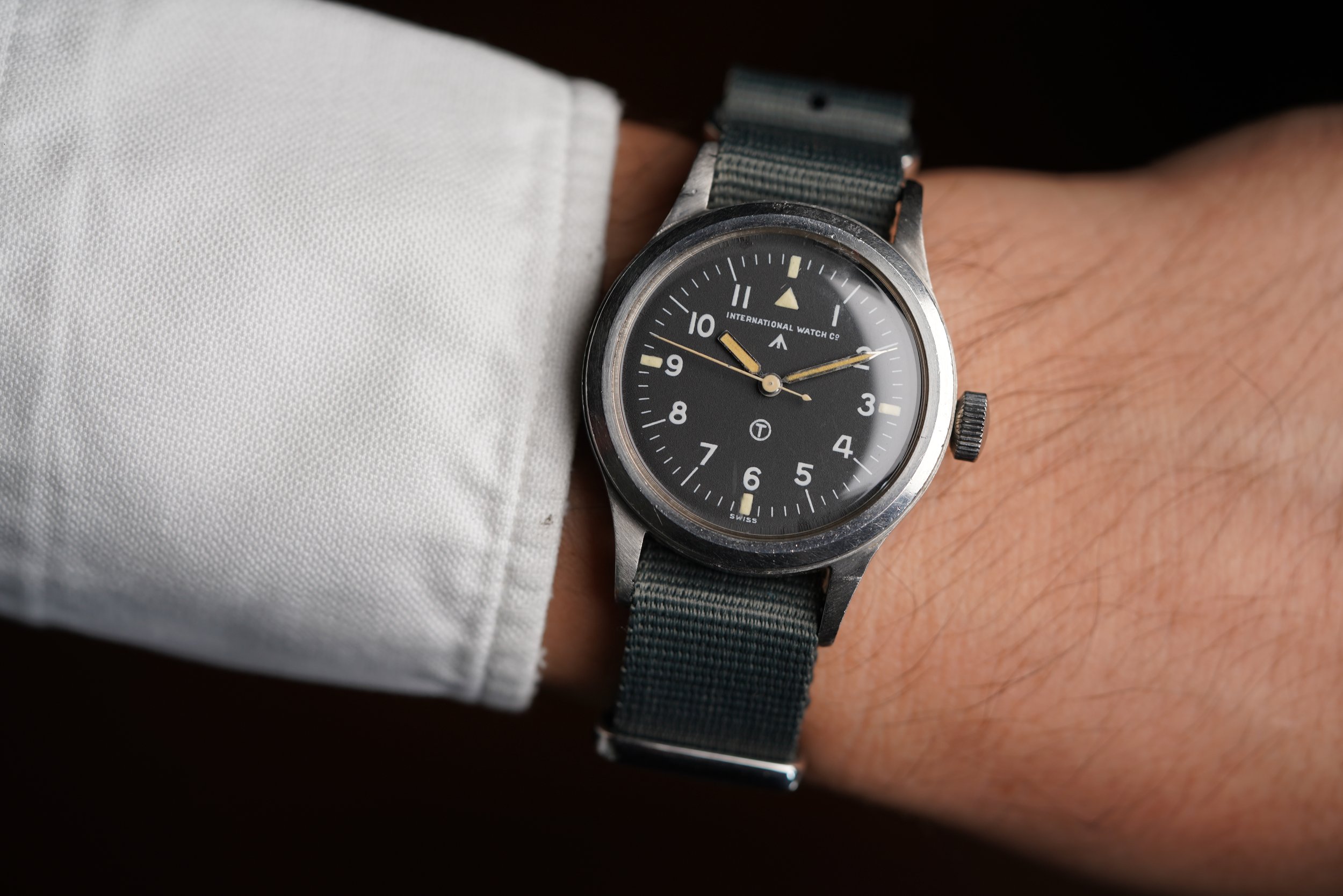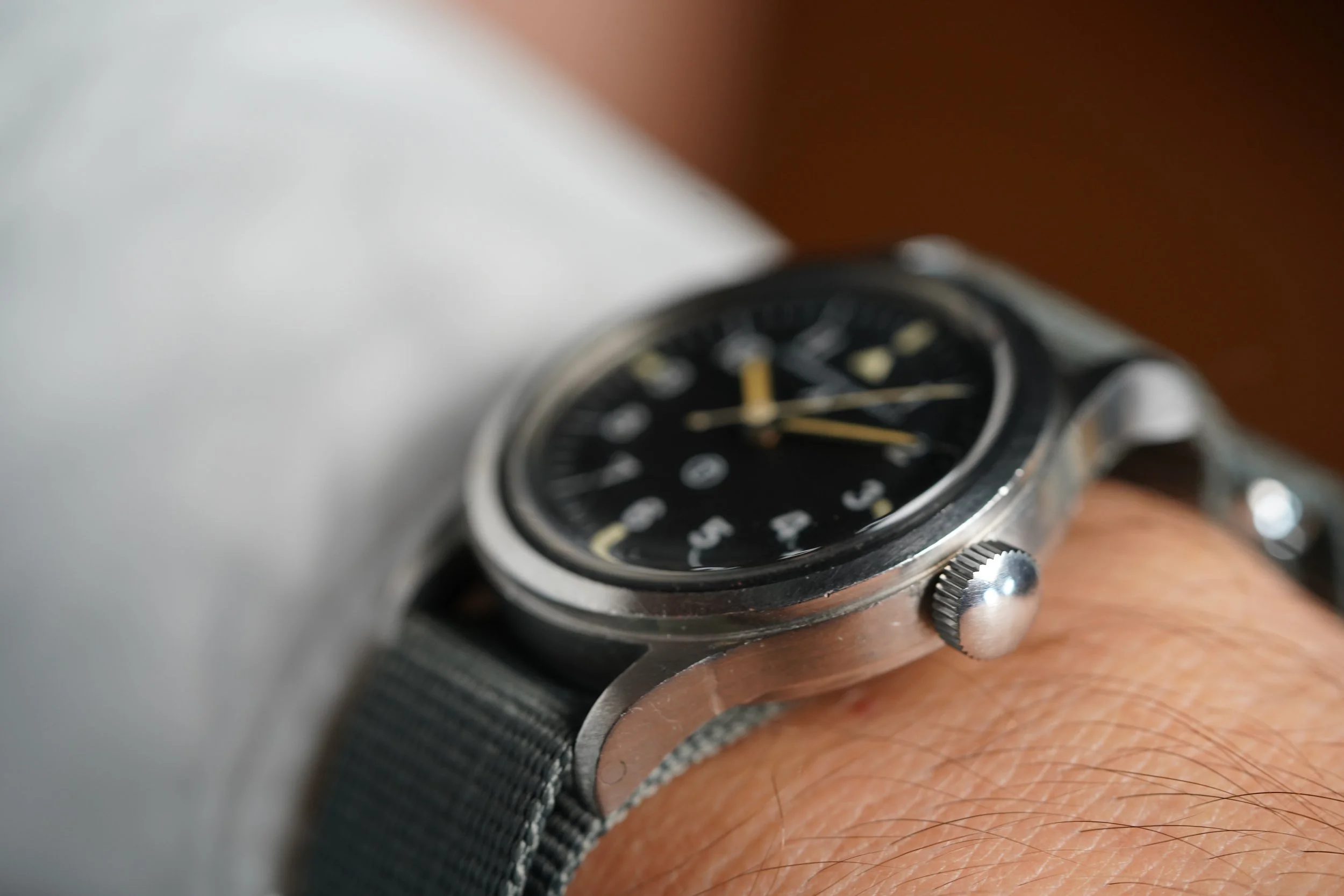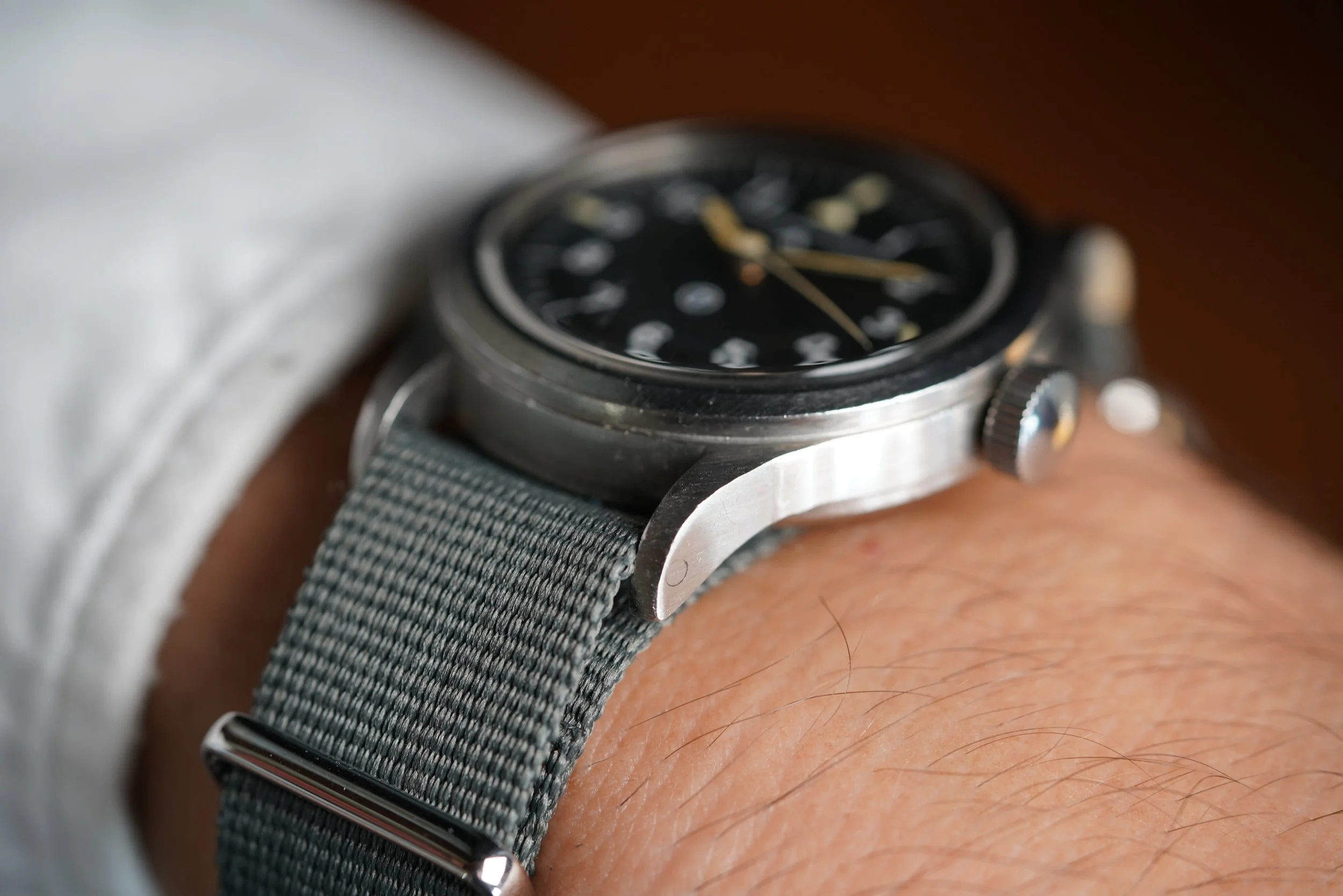 This IWC Mk 11 is a great pilot’s watch with an interesting history. The case is stainless steel and measures 36mm in diameter and approximately 46mm lug-to-lug. The dial also features the broad arrow, a denotation that refers to state property belonging to the Ministry of Defense. The hands have been relumed in the past.