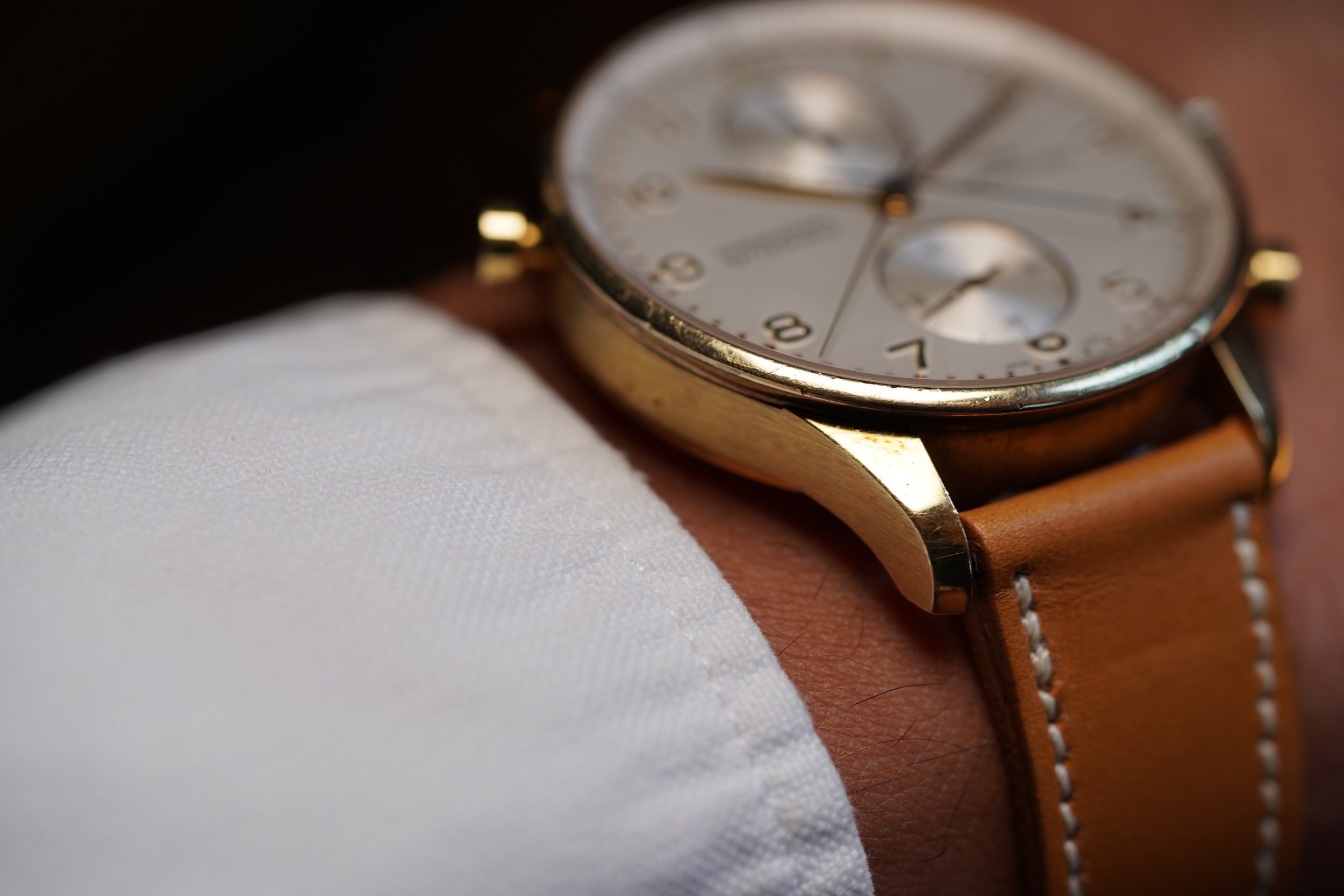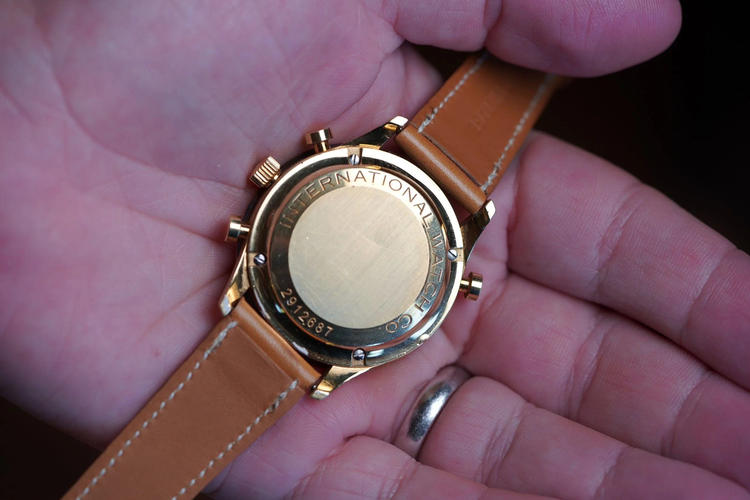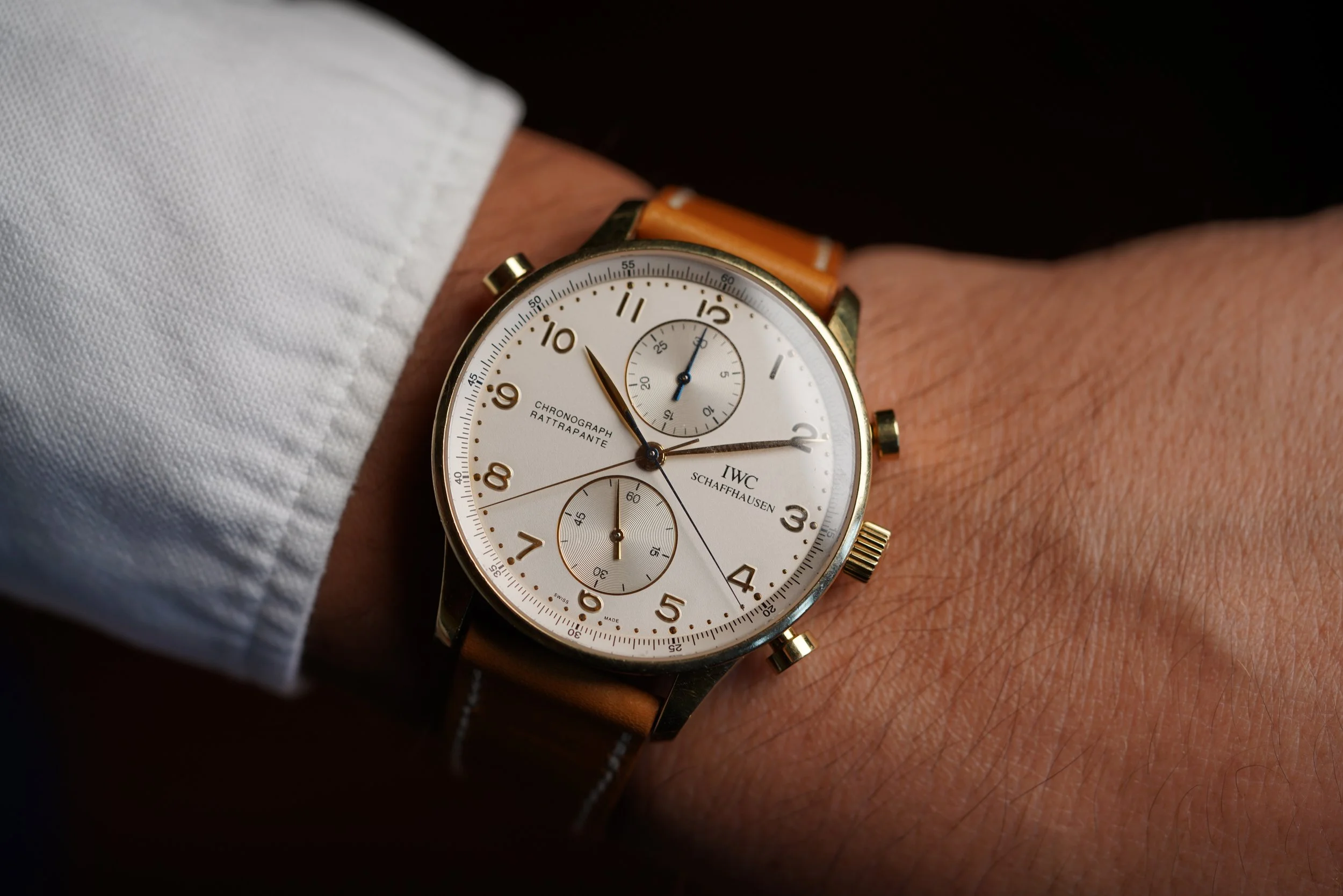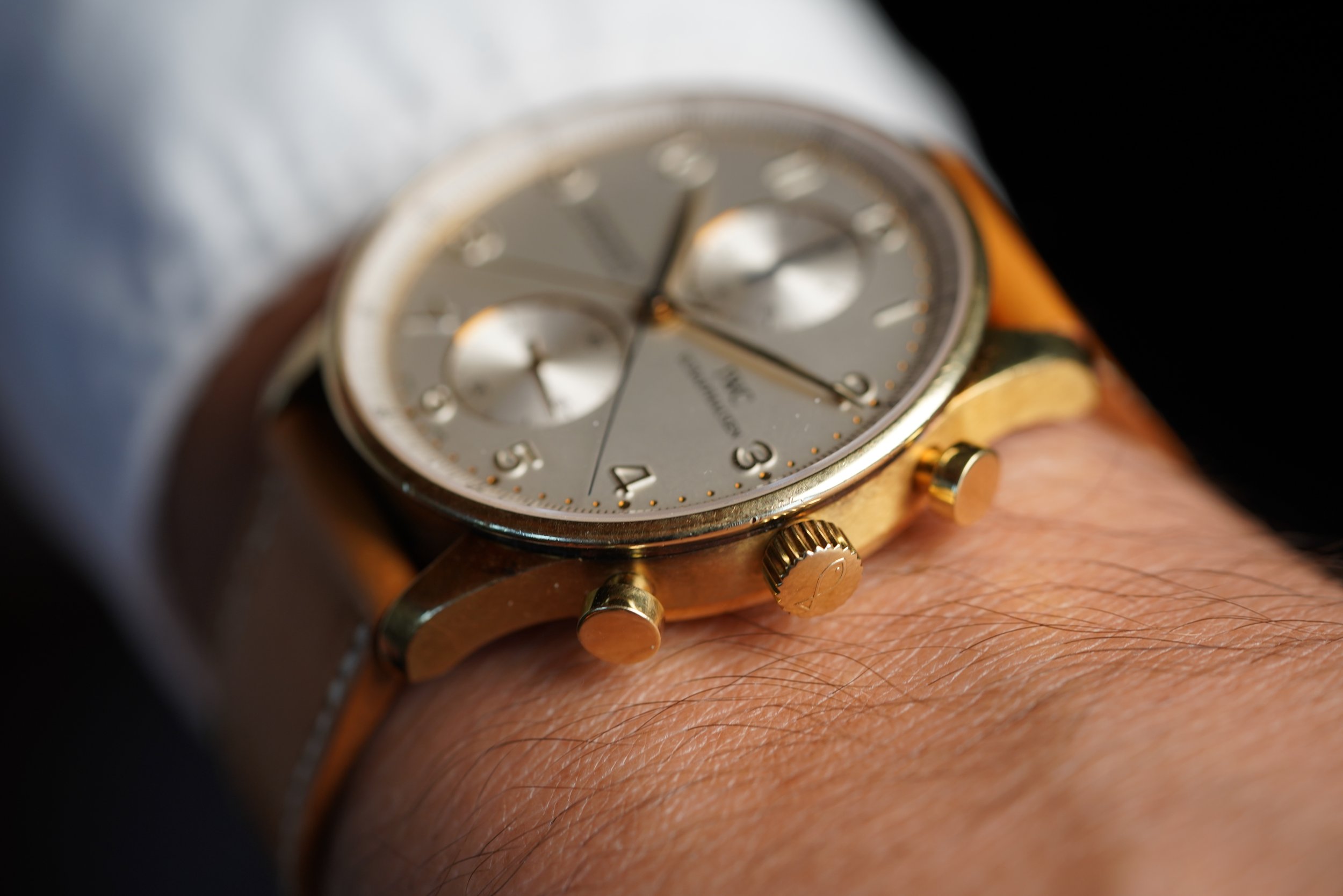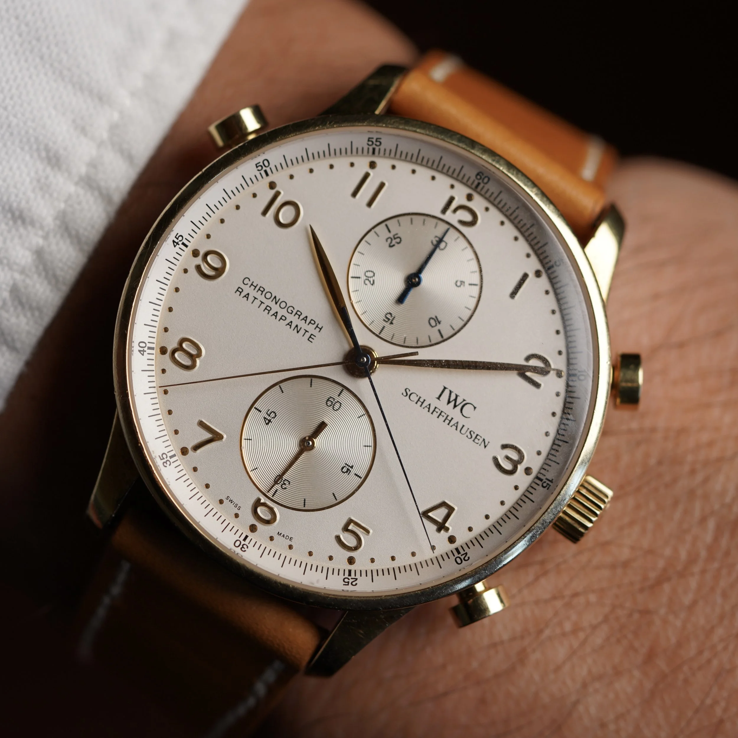 This IWC Rattrapante Chronograph IW3712 is very cool! It measures 41mm. It features the coolest split seconds chronograph! The case is 18k rose gold, but looks yellow to us! Supposedly it was only in rose!