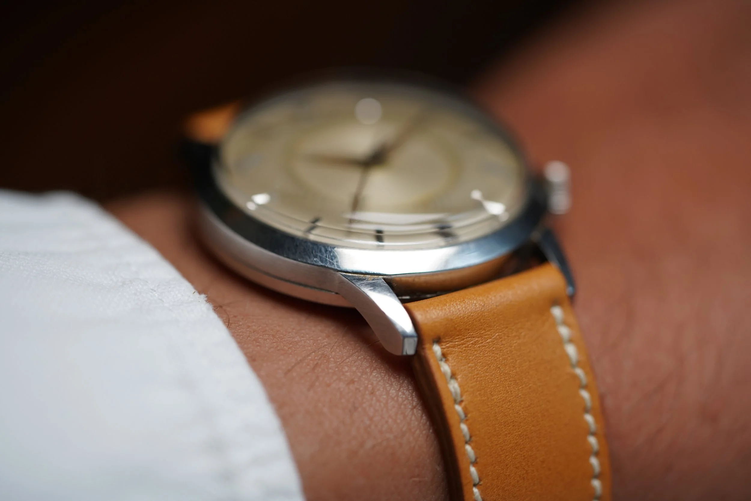 The Jaeger-LeCoultre Memovox reference E 853 is one of my favorite watches of all time. This example dates to the late 1950s. The case measures 37mm in diameter and wears excellent. We believe the case is unpolished. I have found the reference E 853 to be quite hard to model to locate nice examples. The E 855 is also tricky to find nice models, but the no-date variant is just a bit more tricky.