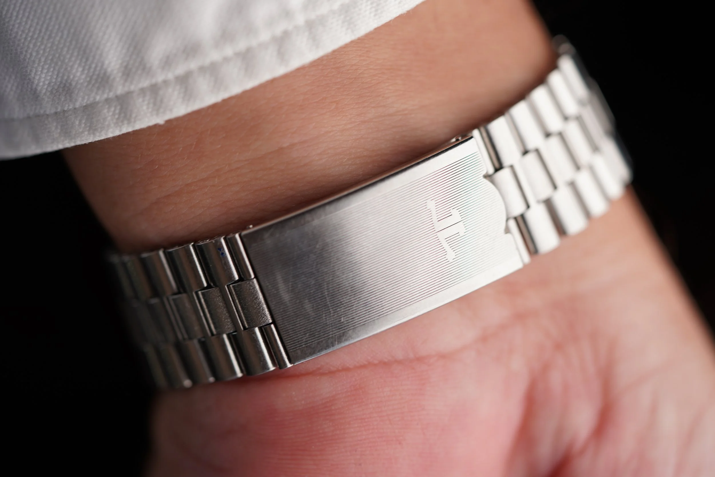 The case has been polished. It is paired on a JLC bracelet that is a similar style to the NSA models these were sold on.