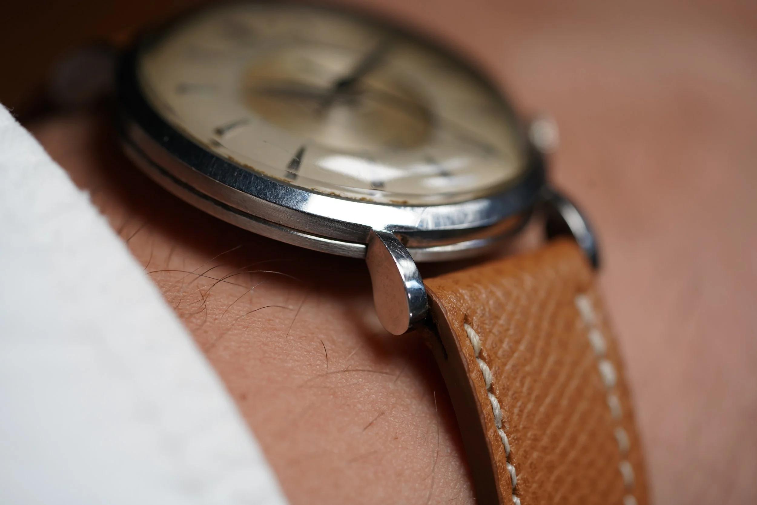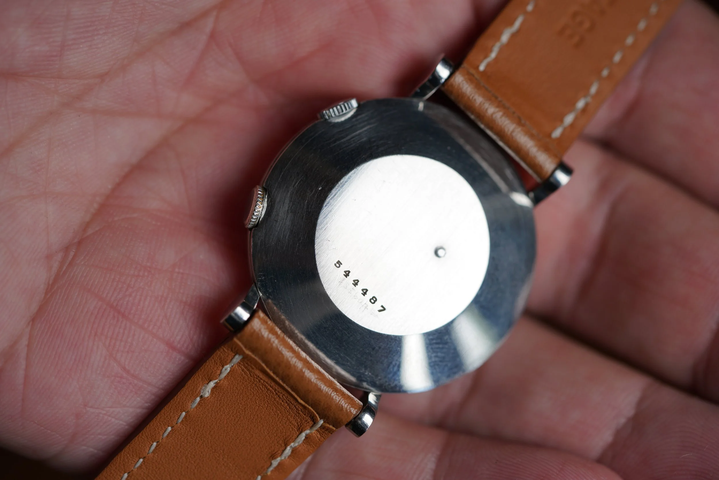 Both the reference 3150 and 3151 were the first Memovoxes to be introduced commercially. The dial is very nice on this example with blue accents. The case appears to be unpolished. It measures 35mm in diameter and is quire long with a length of 42mm lug-to-lug. The lugs flair out and have a lug width of approximately 17-18mm. It is a two-body case design, with the lugs attached to the bezel and the case back being a snap on. The crowns are unsigned on these models.