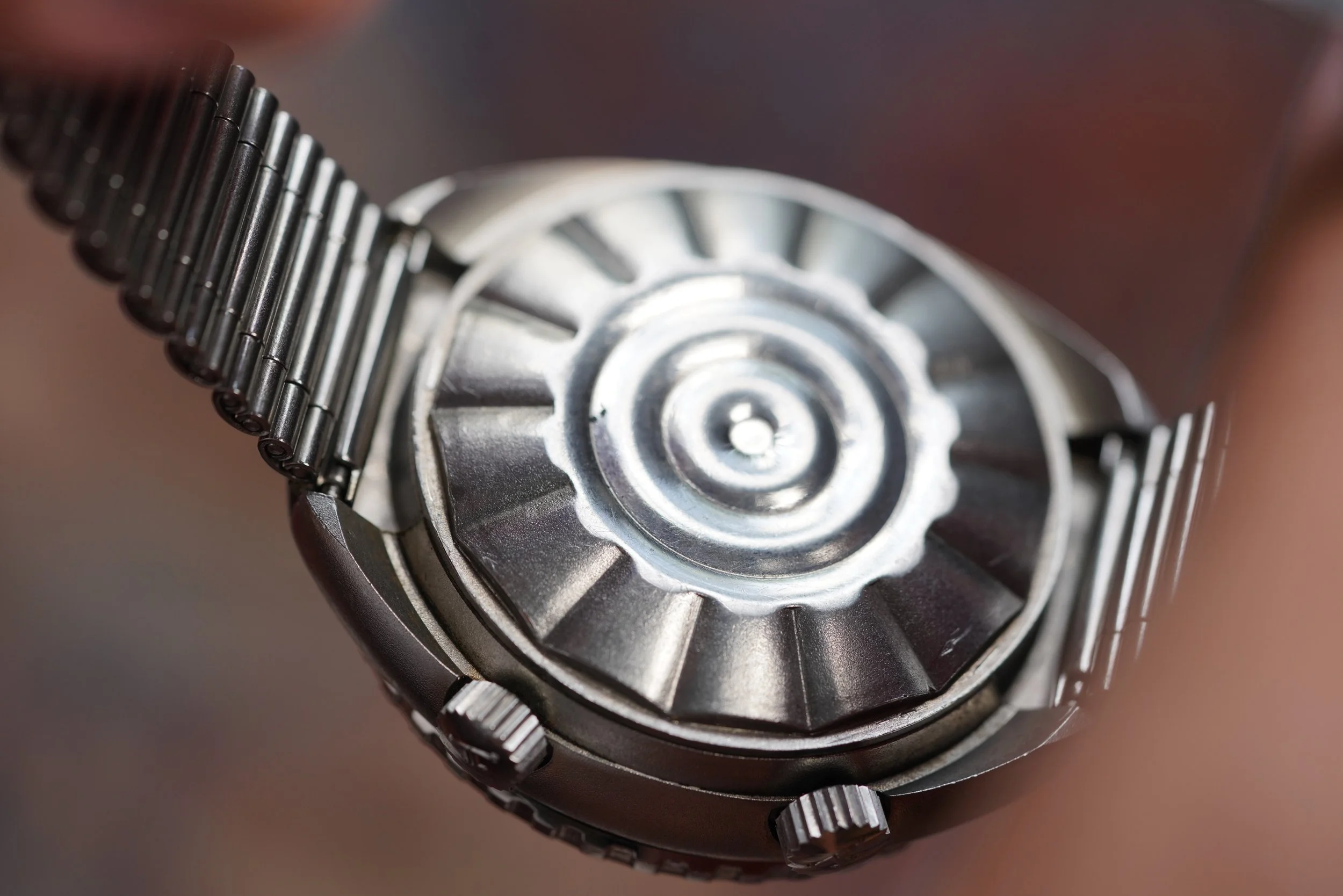 Along with the Atmos clock and Reversos, Jaeger-LeCoultre’s advancements in alarm timepieces throughout the 20th century are certainly one of the most iconic genres from the Le Sentier manufacturer. This Polaris II E 870 is a super funky and cool alarm-dive watch. It dates to the 1970s and you can tell this off first impression. The reference’s “E” stands for Etanche, which indicates the case is a water-resistant model. The pastel blue bezel insert and dial make the Polaris II one of the most unique looking watches. It is such a futuristic design and fun watch to admire on the wrist. It is paired on an NSA bracelet from the period. This is a similar style bracelet it would have been sold on, but instead signed JLC. They were also sold on Tropic straps.