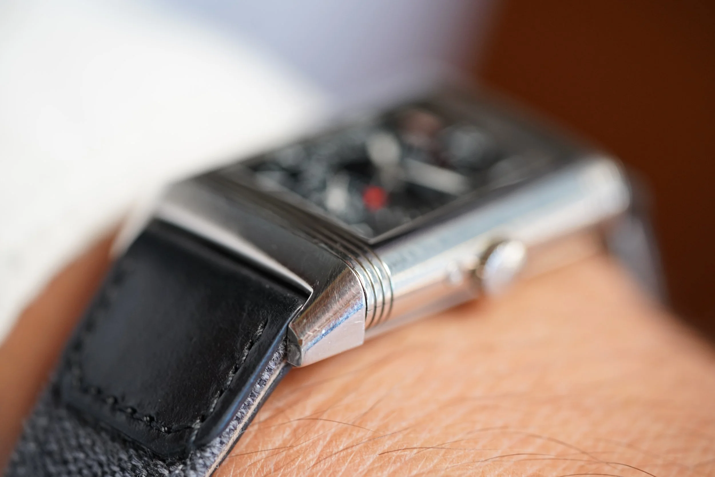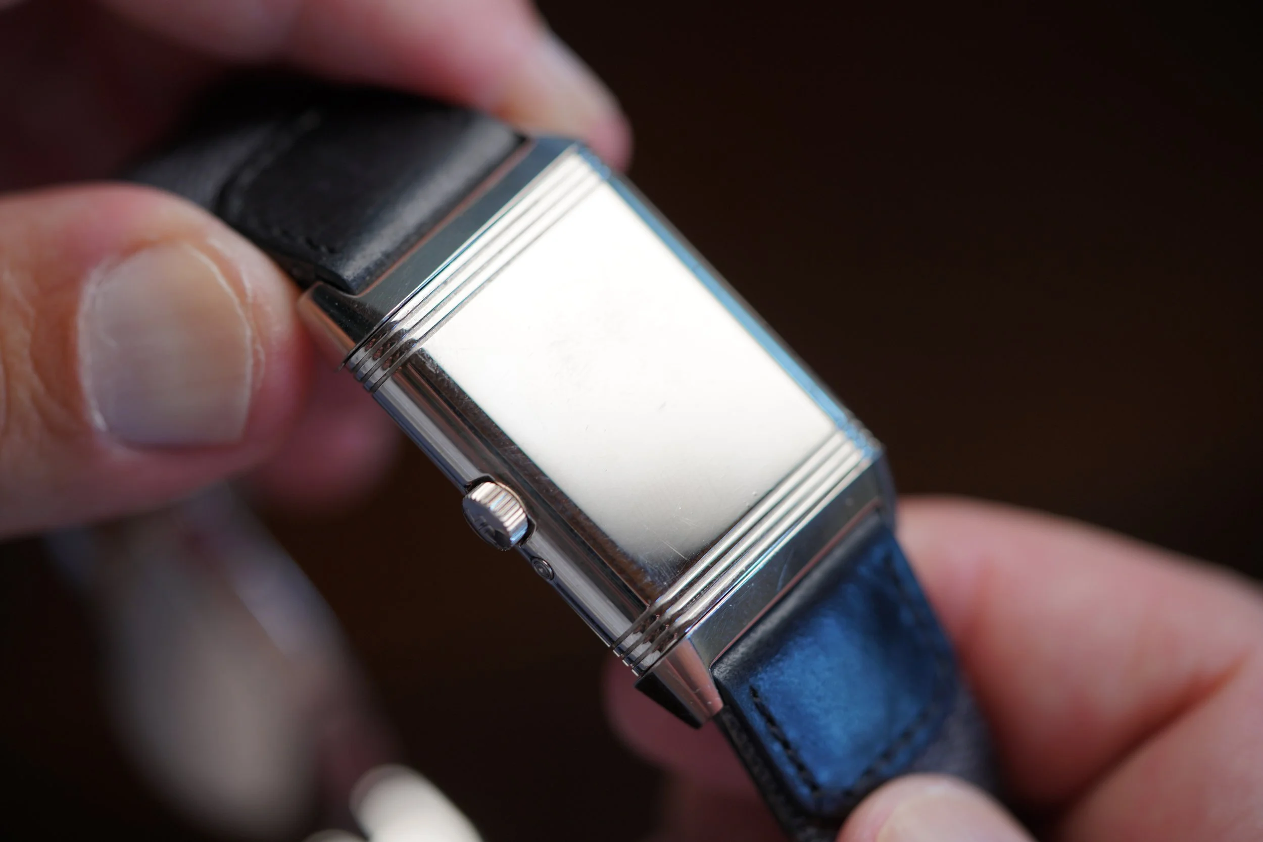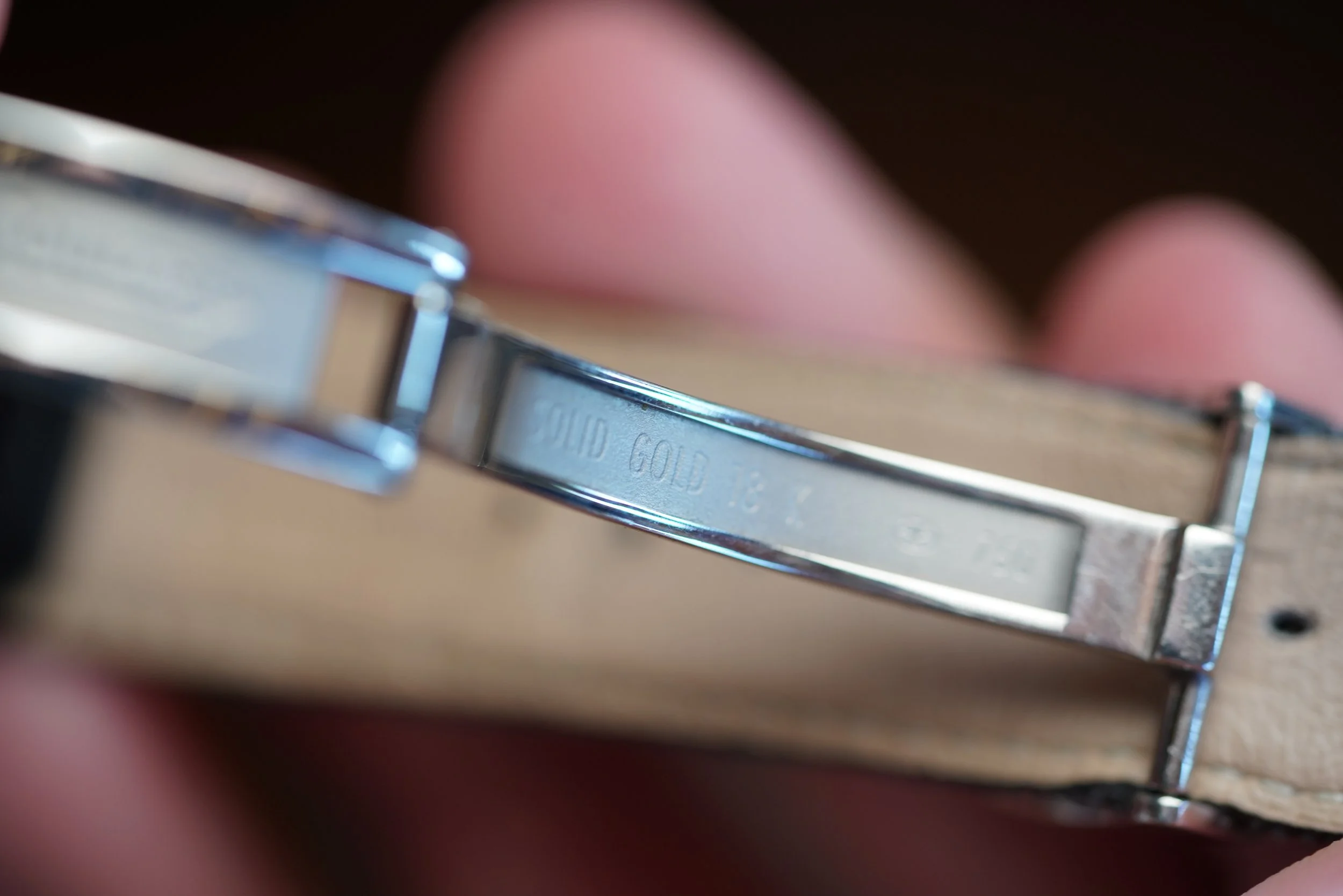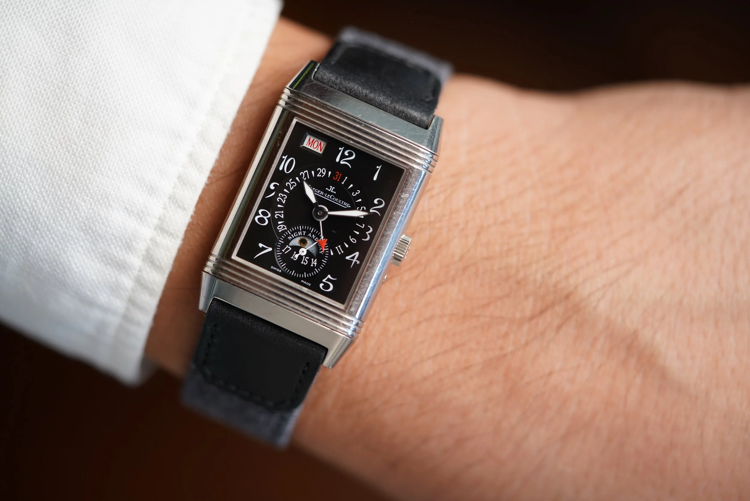 This Jaeger-LeCoultre Reverso is a super attractive complicated model. The watch dates to circa 2003. The case appears to be unpolished and made of 18K gold. It measures approximately 26mm x 42mm.