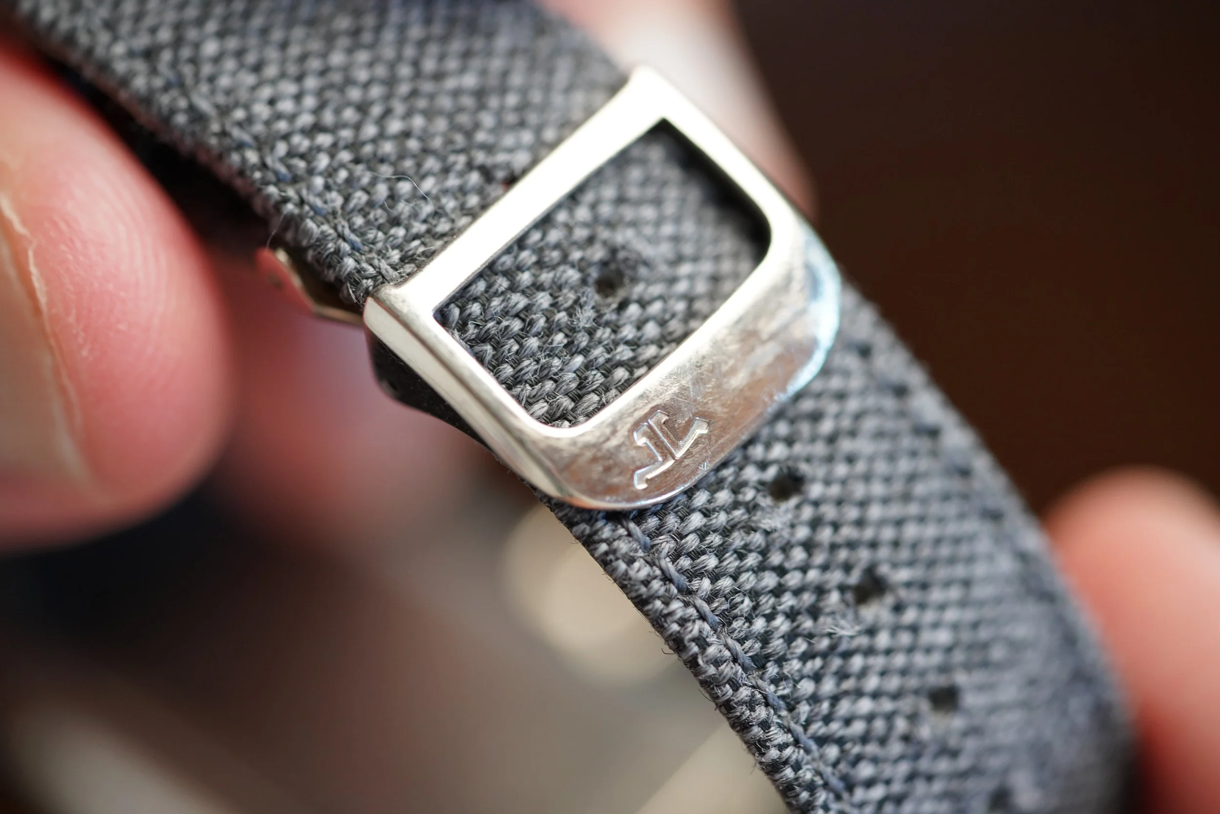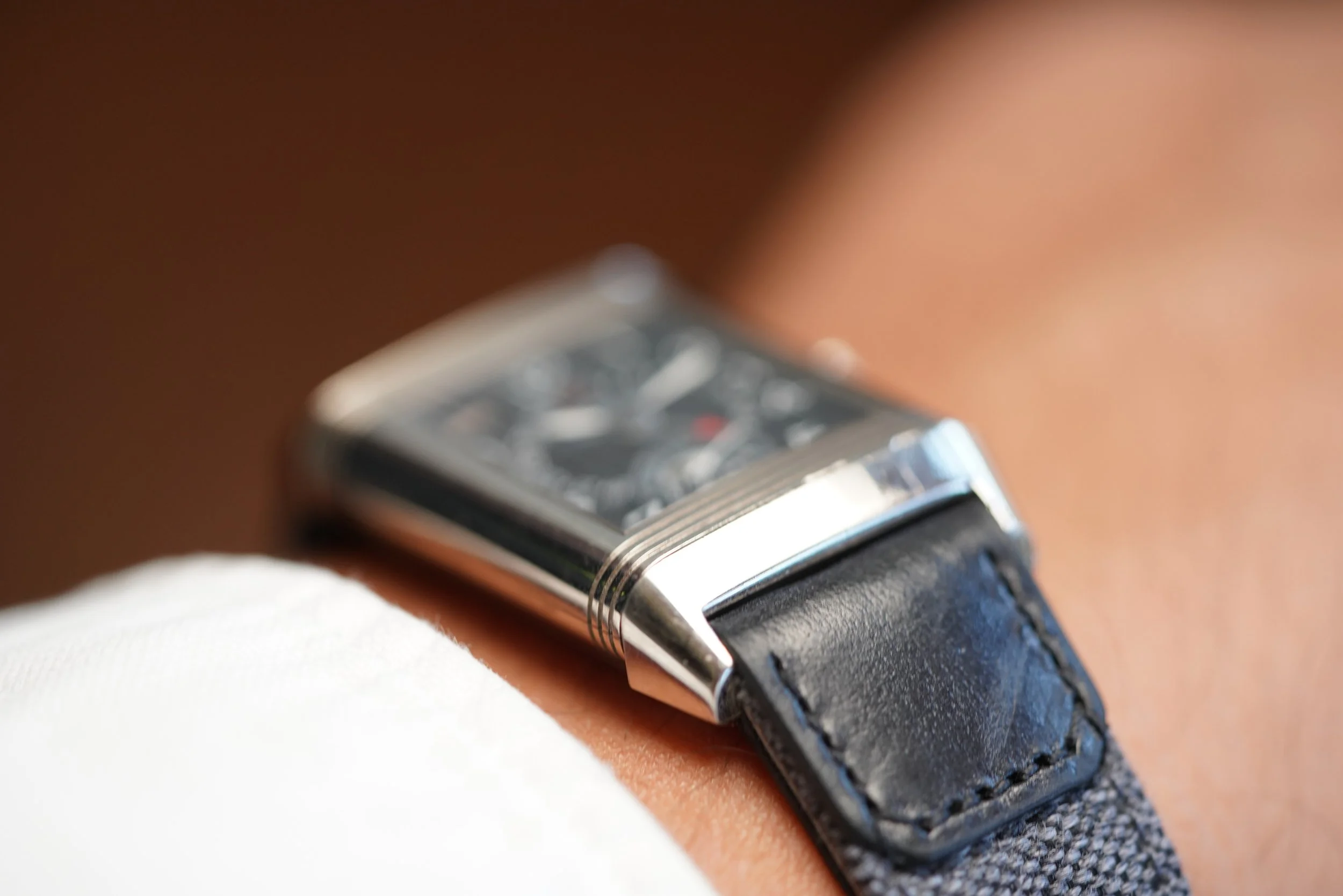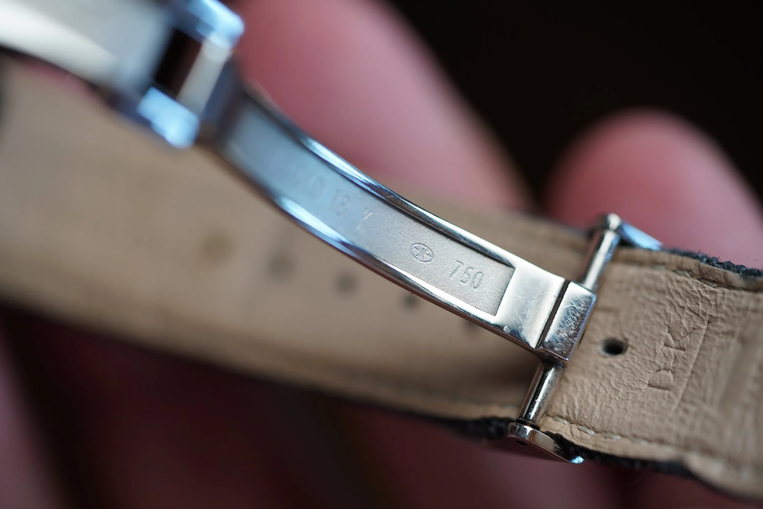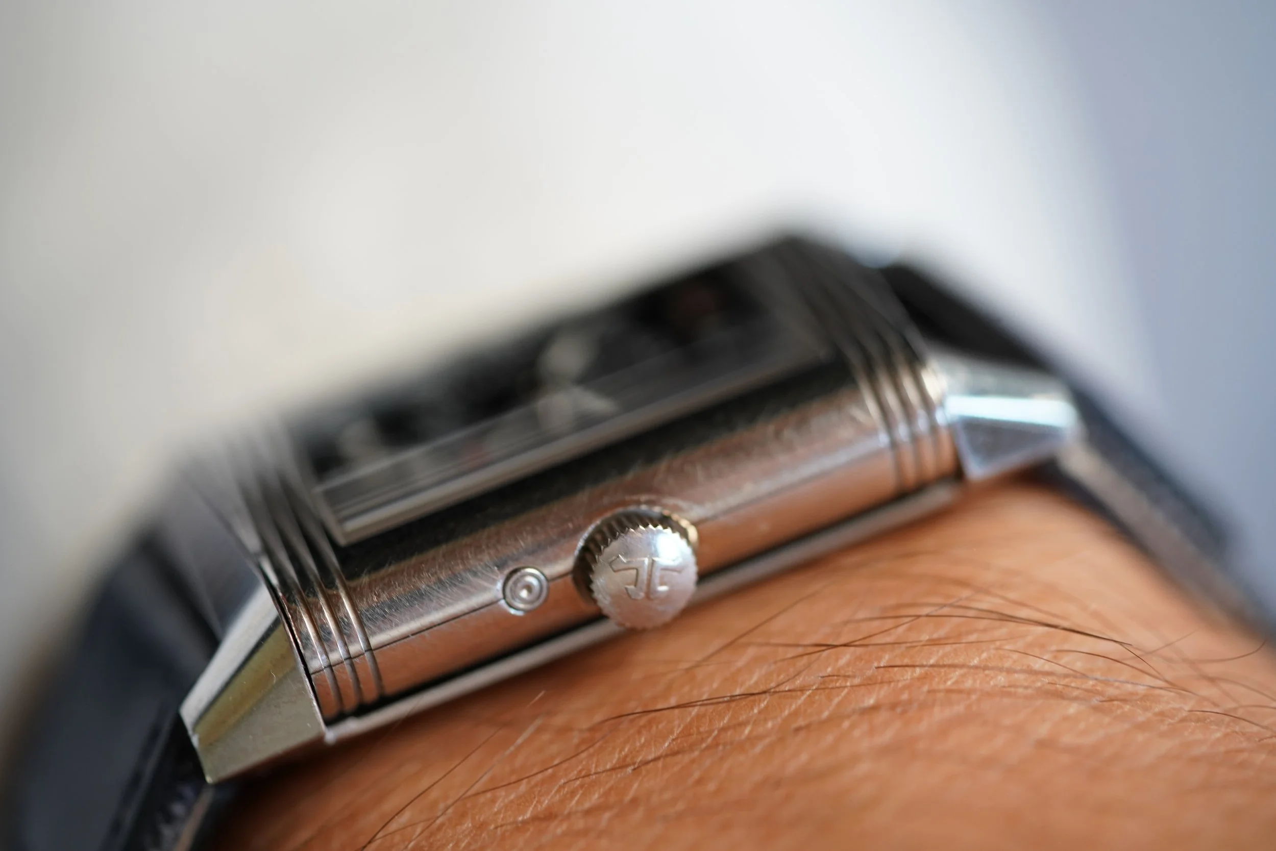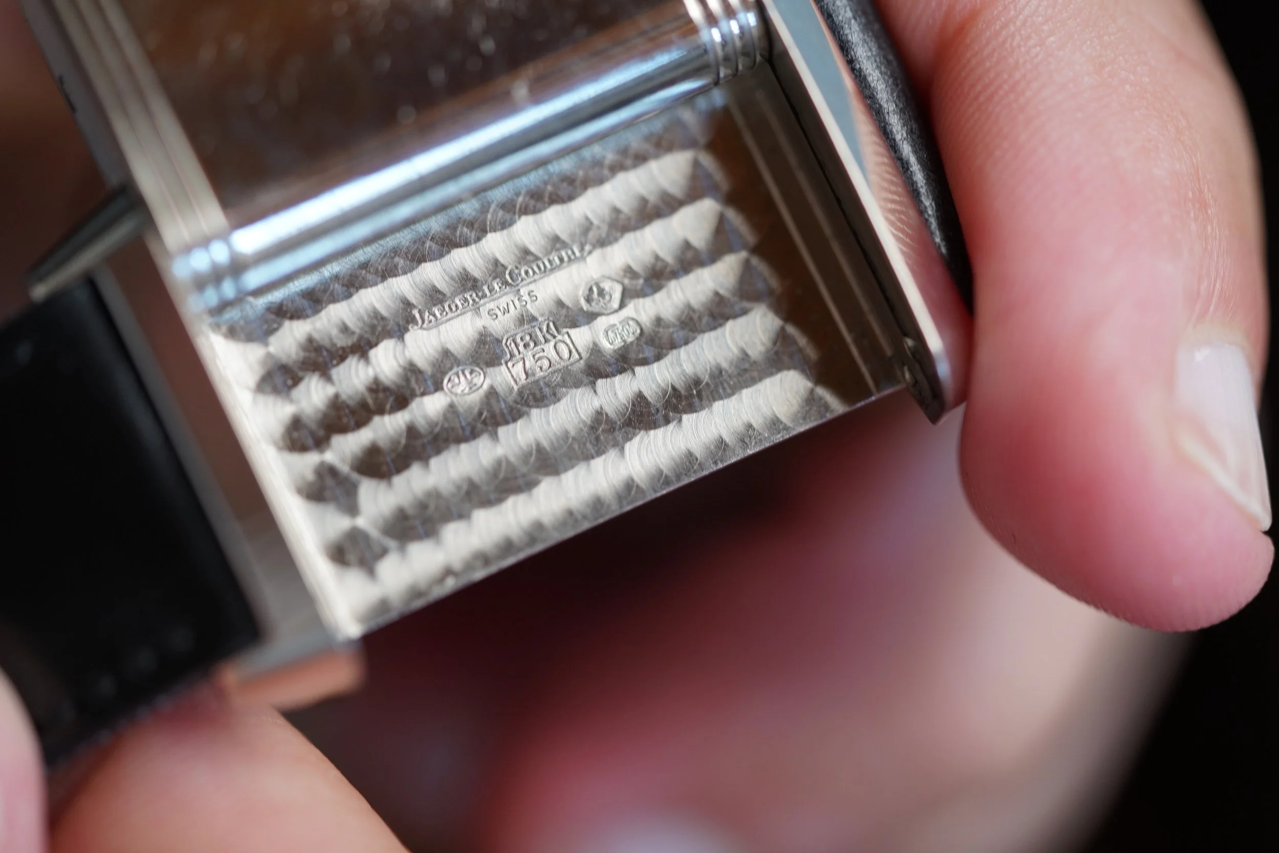 This Jaeger-LeCoultre Reverso is a super attractive complicated model. The watch dates to circa 2003. The case appears to be unpolished and made of 18K gold. It measures approximately 26mm x 42mm.