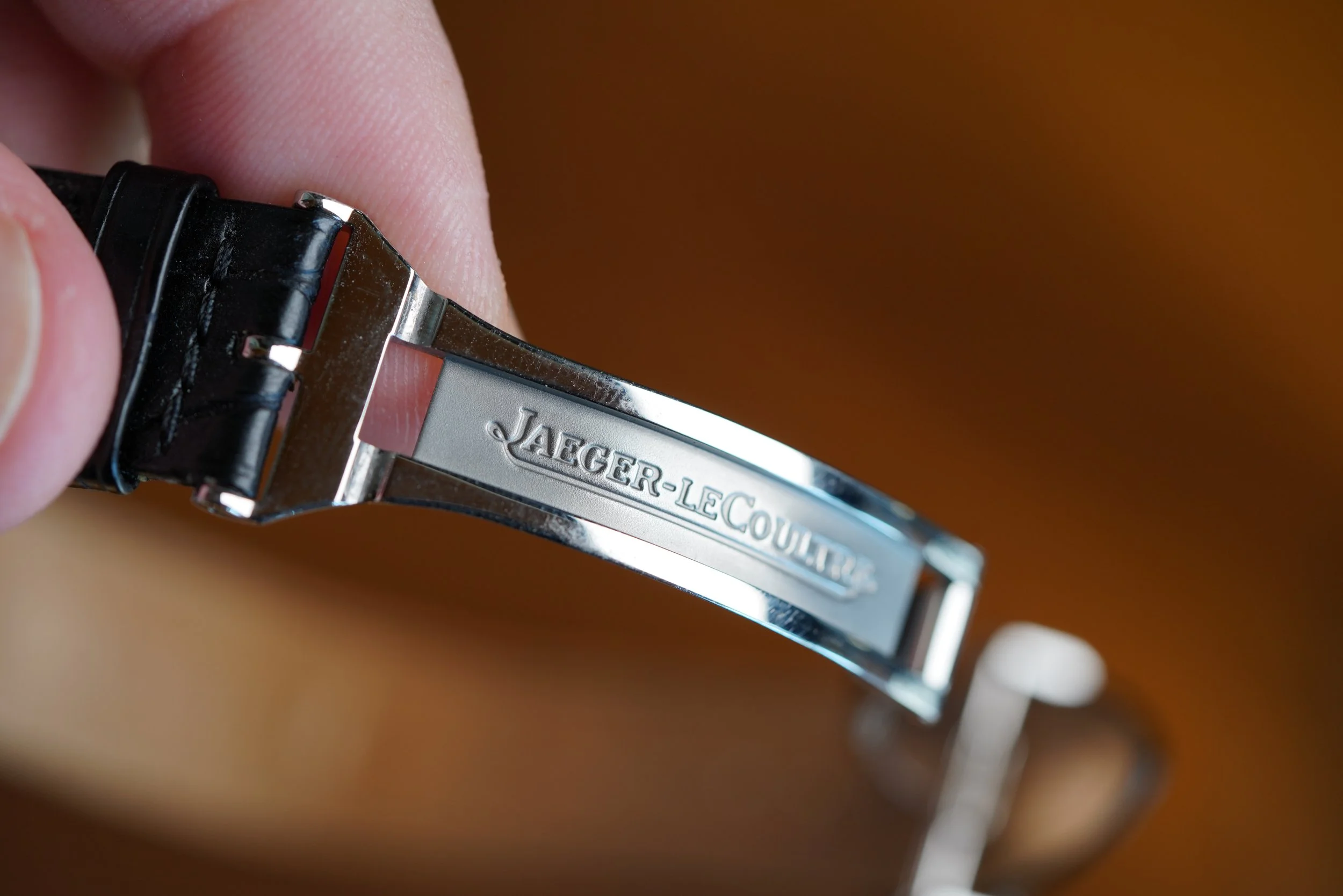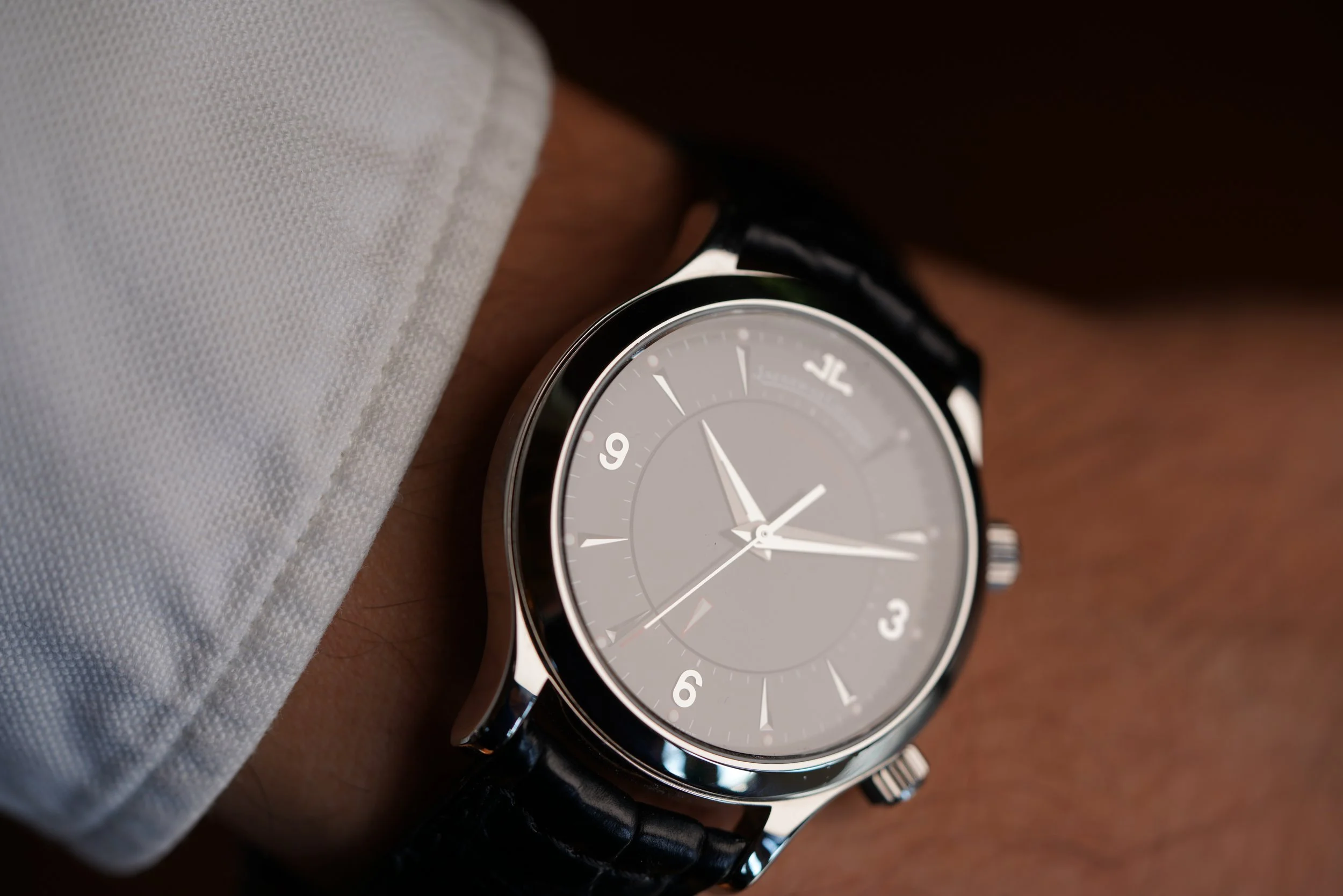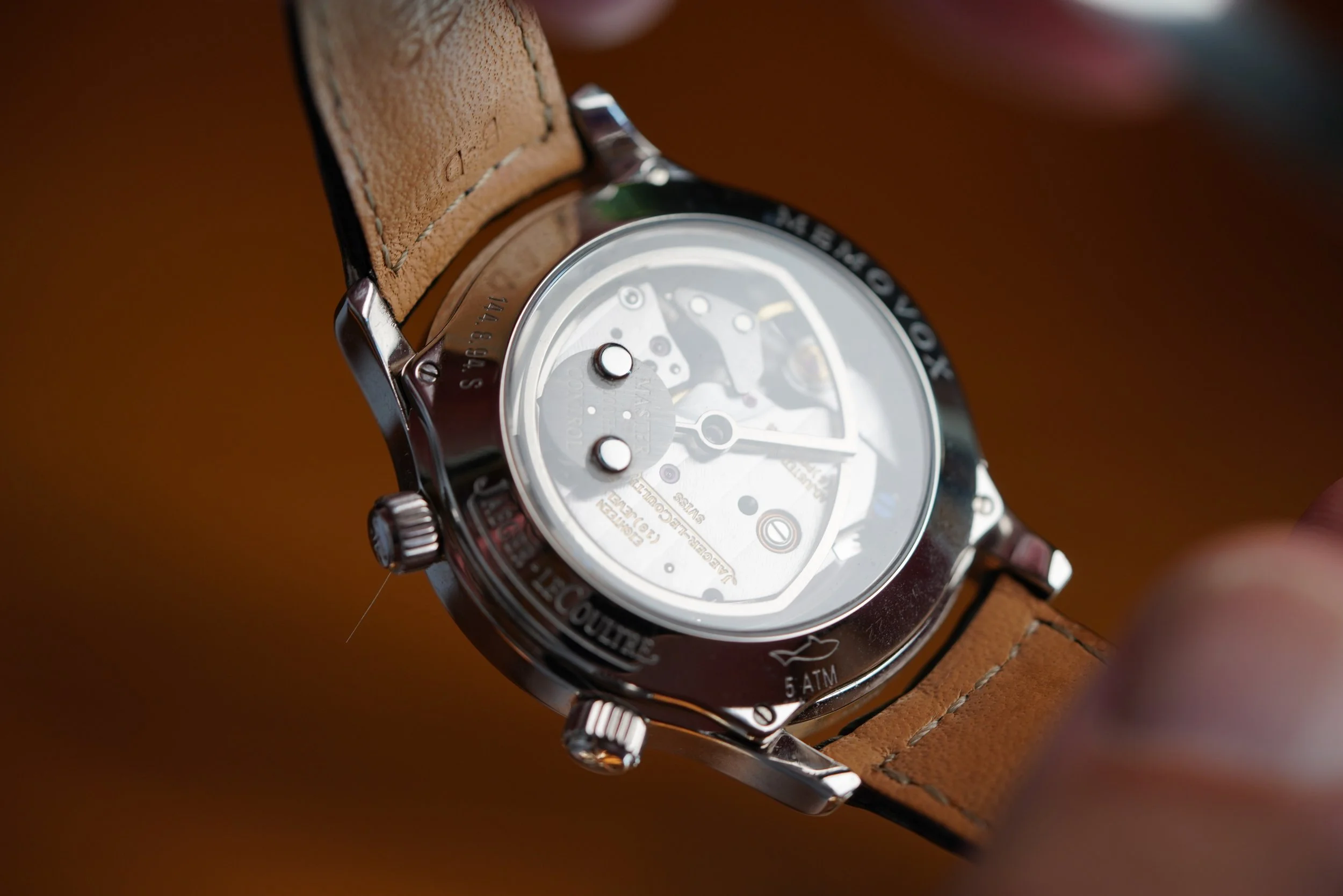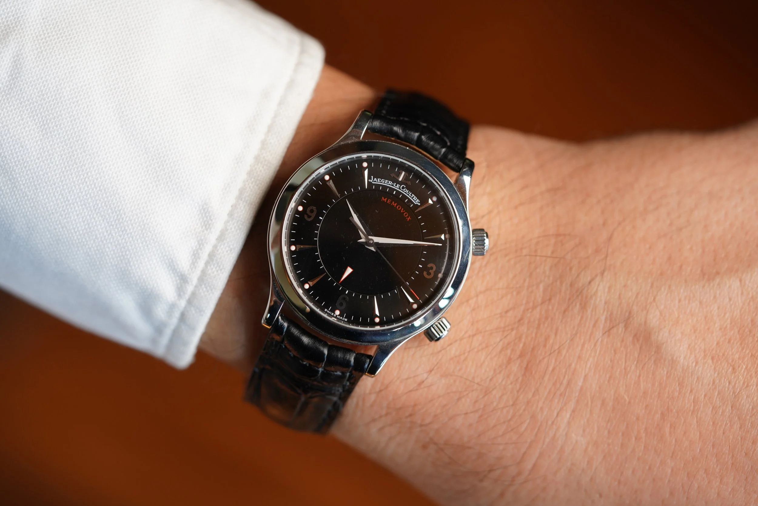 This Jaeger-LeCoultre Master Control Memovox Revival reference 144.8.94.S is a great stainless steel alarm watch in a 36mm case. The watch measures approximately 42.5mm lug to lug and features an exhibition caseback. The watch has a black dial and is paired with a black leather strap and stainless steel clasp, both from JLC. The case appears to be unpolished.