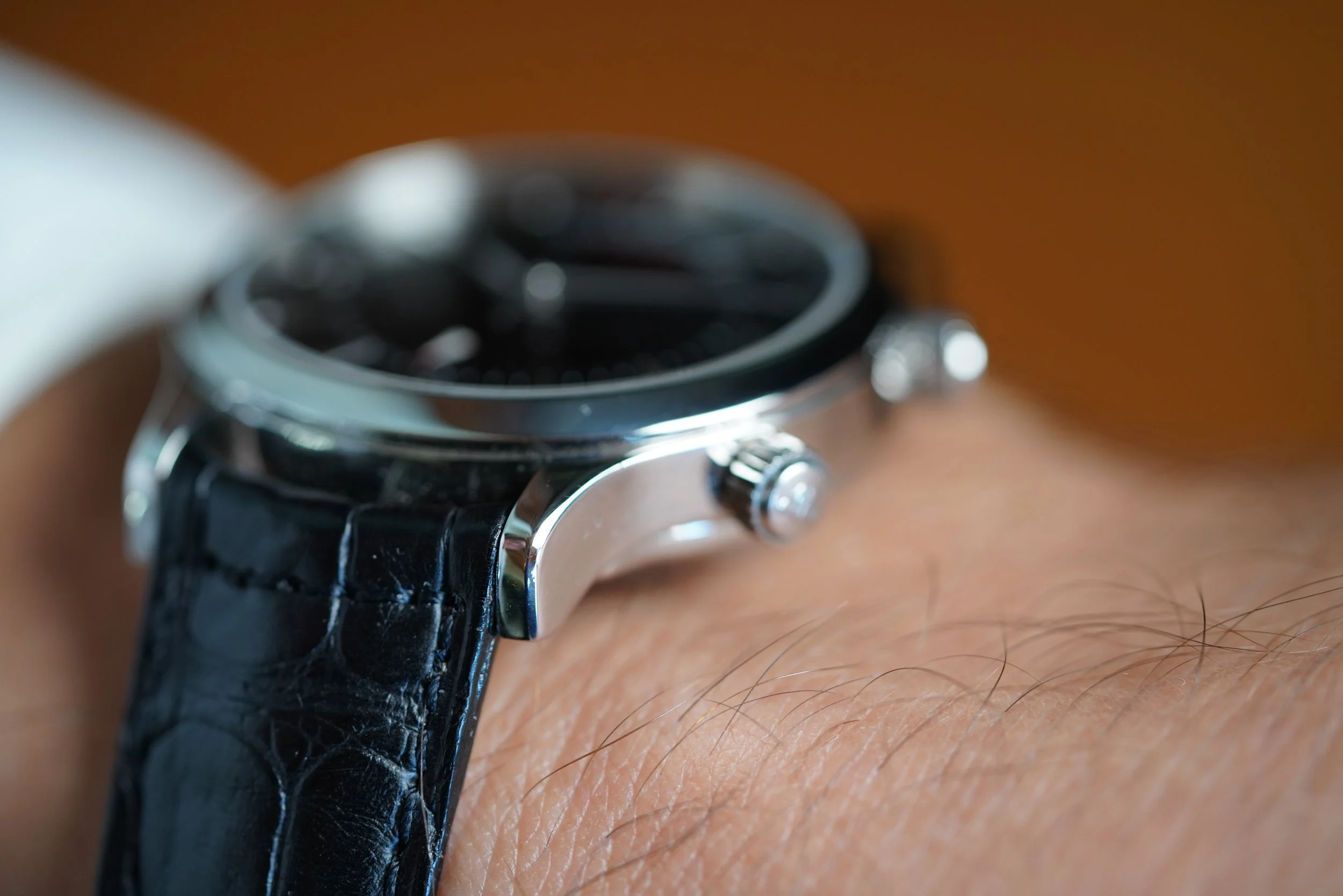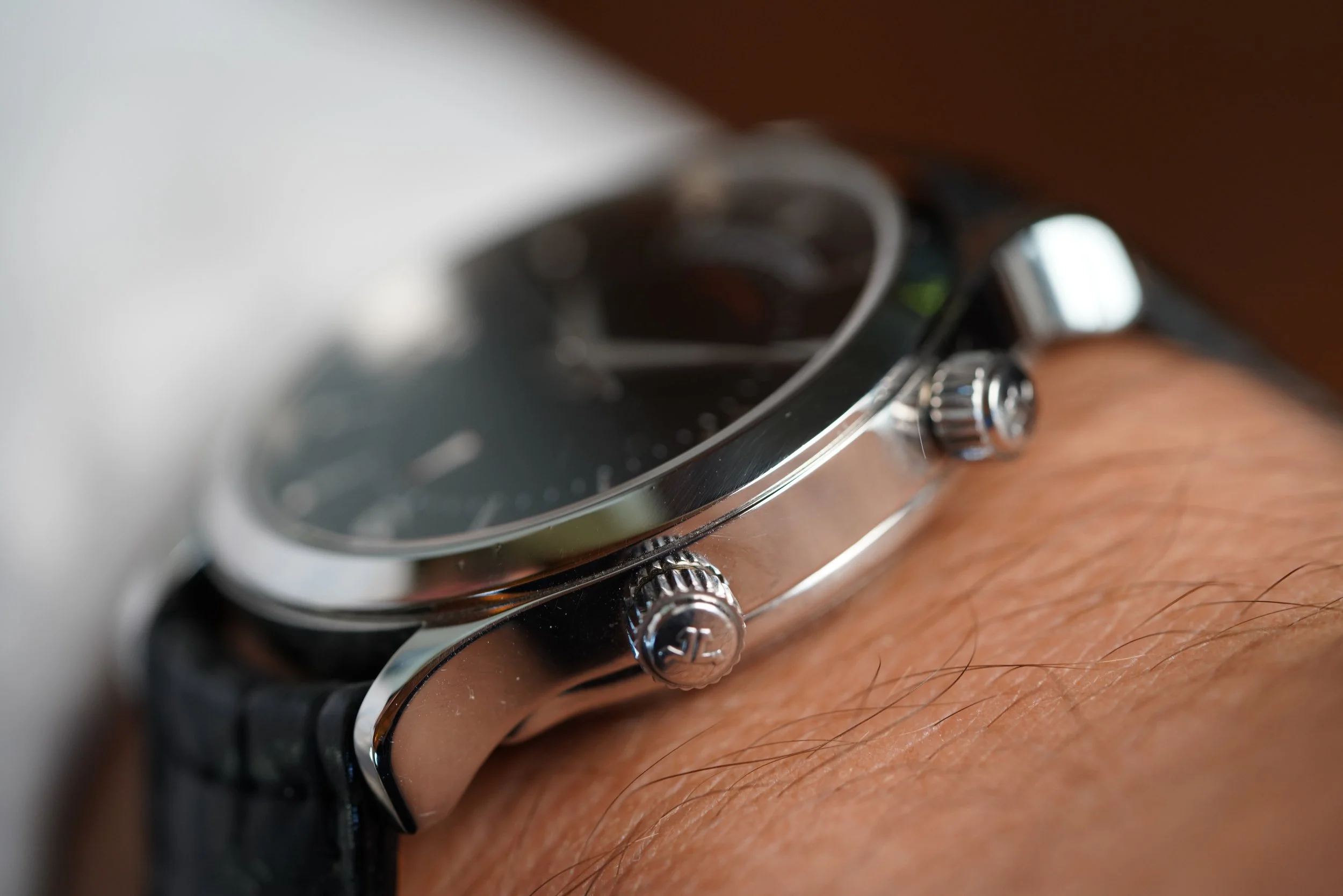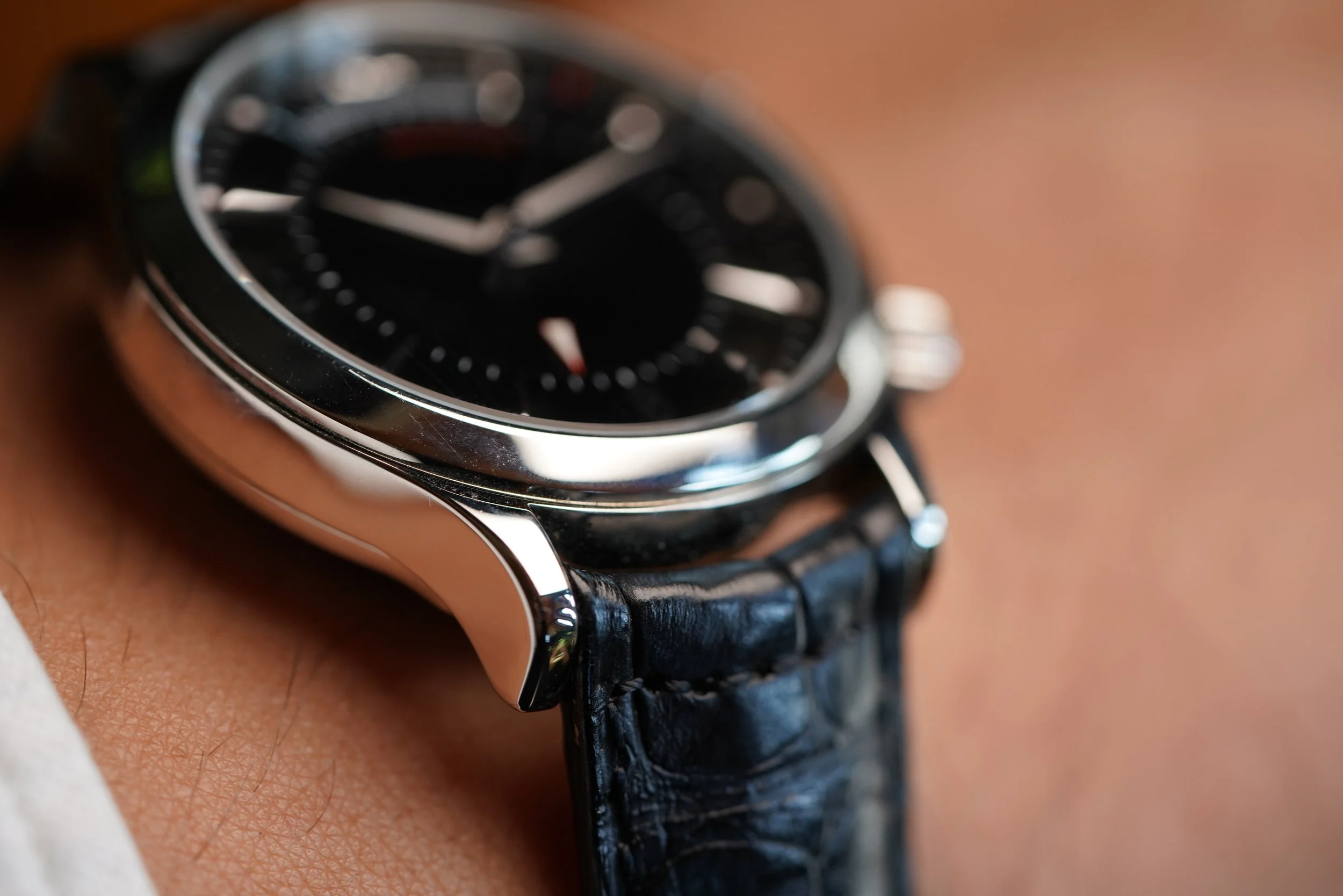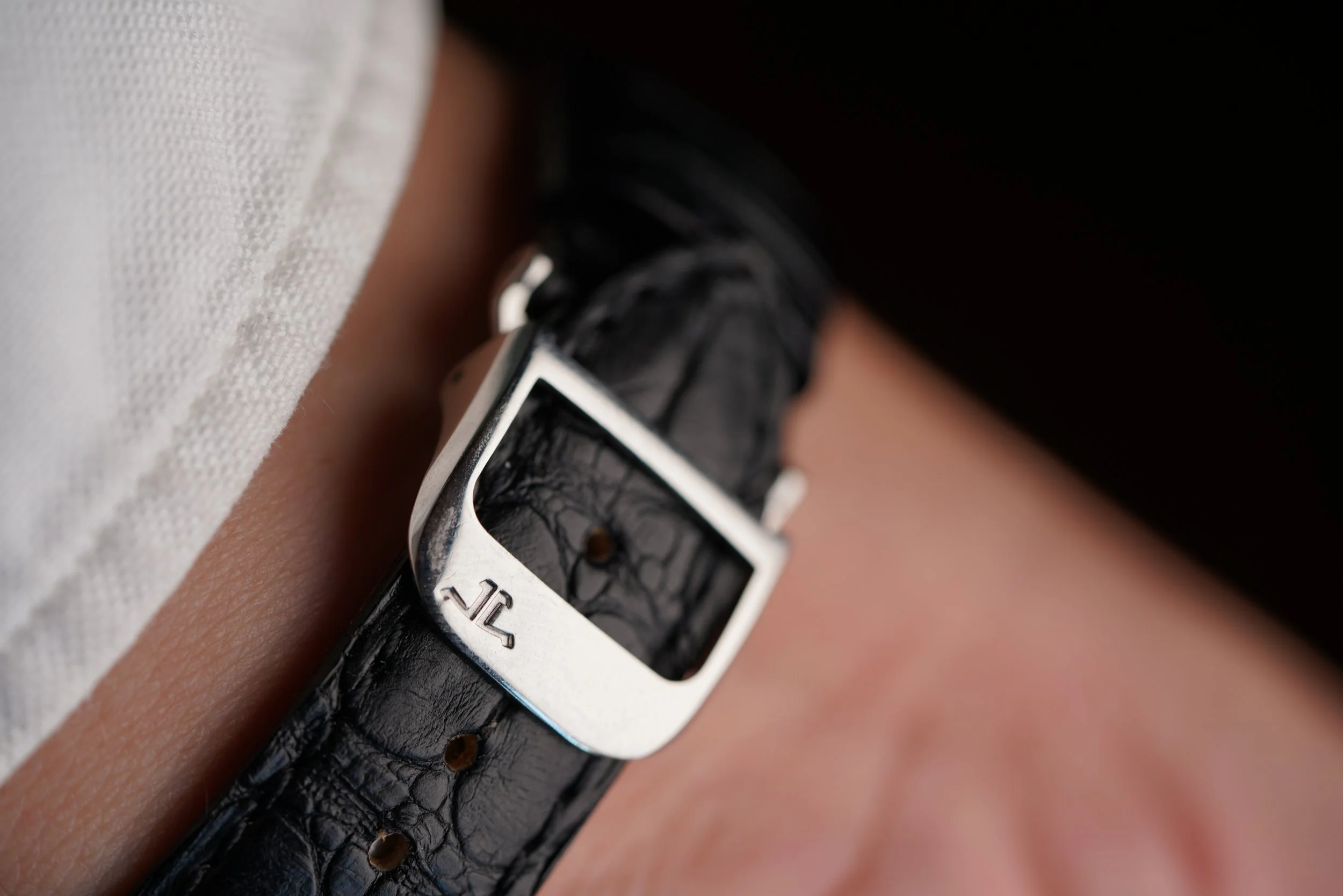 This Jaeger-LeCoultre Master Control Memovox Revival reference 144.8.94.S is a great stainless steel alarm watch in a 36mm case. The watch measures approximately 42.5mm lug to lug and features an exhibition caseback. The watch has a black dial and is paired with a black leather strap and stainless steel clasp, both from JLC. The case appears to be unpolished.
