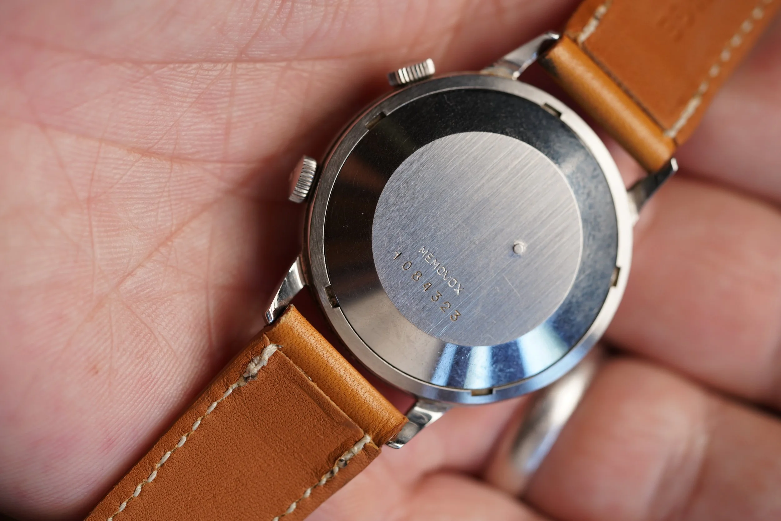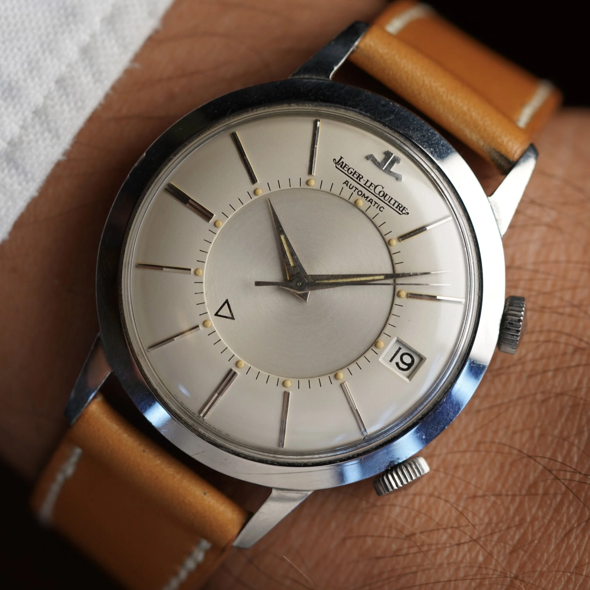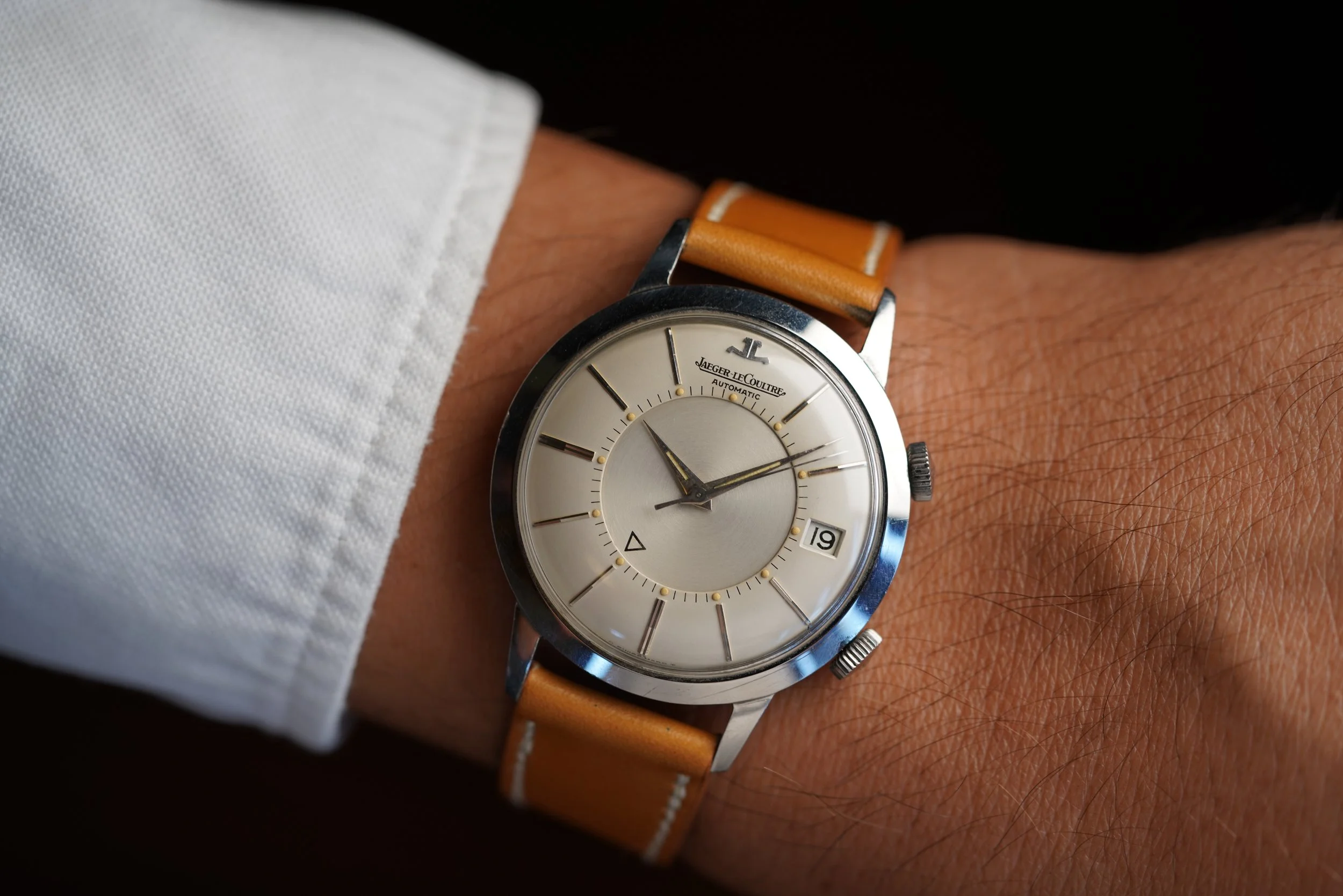 The Jaeger-LeCoultre Memovox reference E 855 is one of my favorite watches of all time. This example dates to circa mid 1960s. The case measures 37mm in diameter and wears excellent. The case appears to be unpolished. The luminous material on the dial and hands are super attractive and it has a nice bold font.