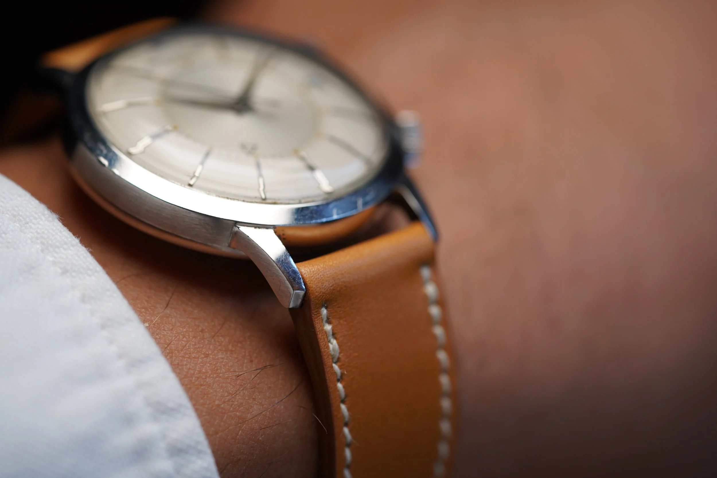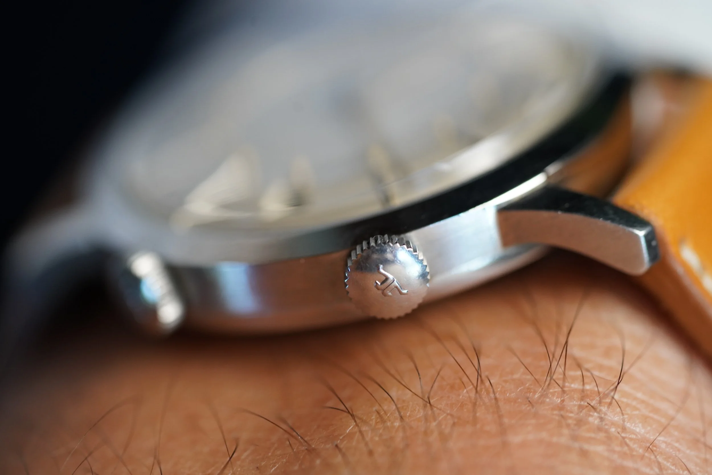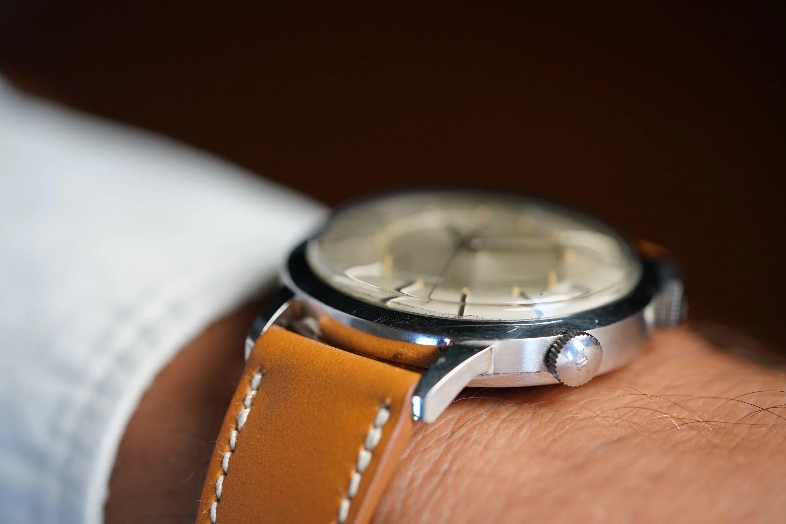 The Jaeger-LeCoultre Memovox reference E 855 is one of my favorite watches of all time. This example dates to circa mid 1960s. The case measures 37mm in diameter and wears excellent. The case appears to be unpolished. The luminous material on the dial and hands are super attractive and it has a nice bold font.