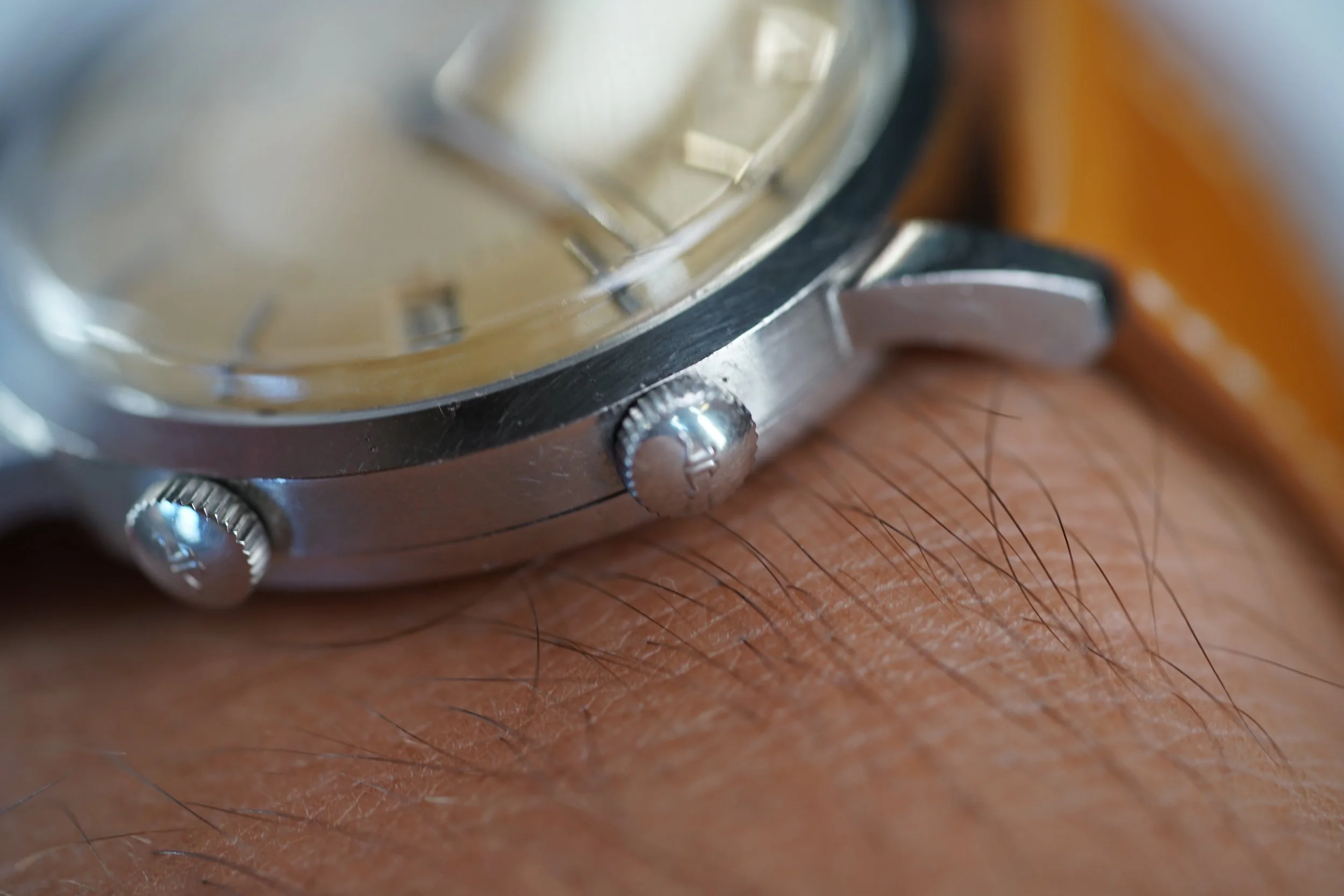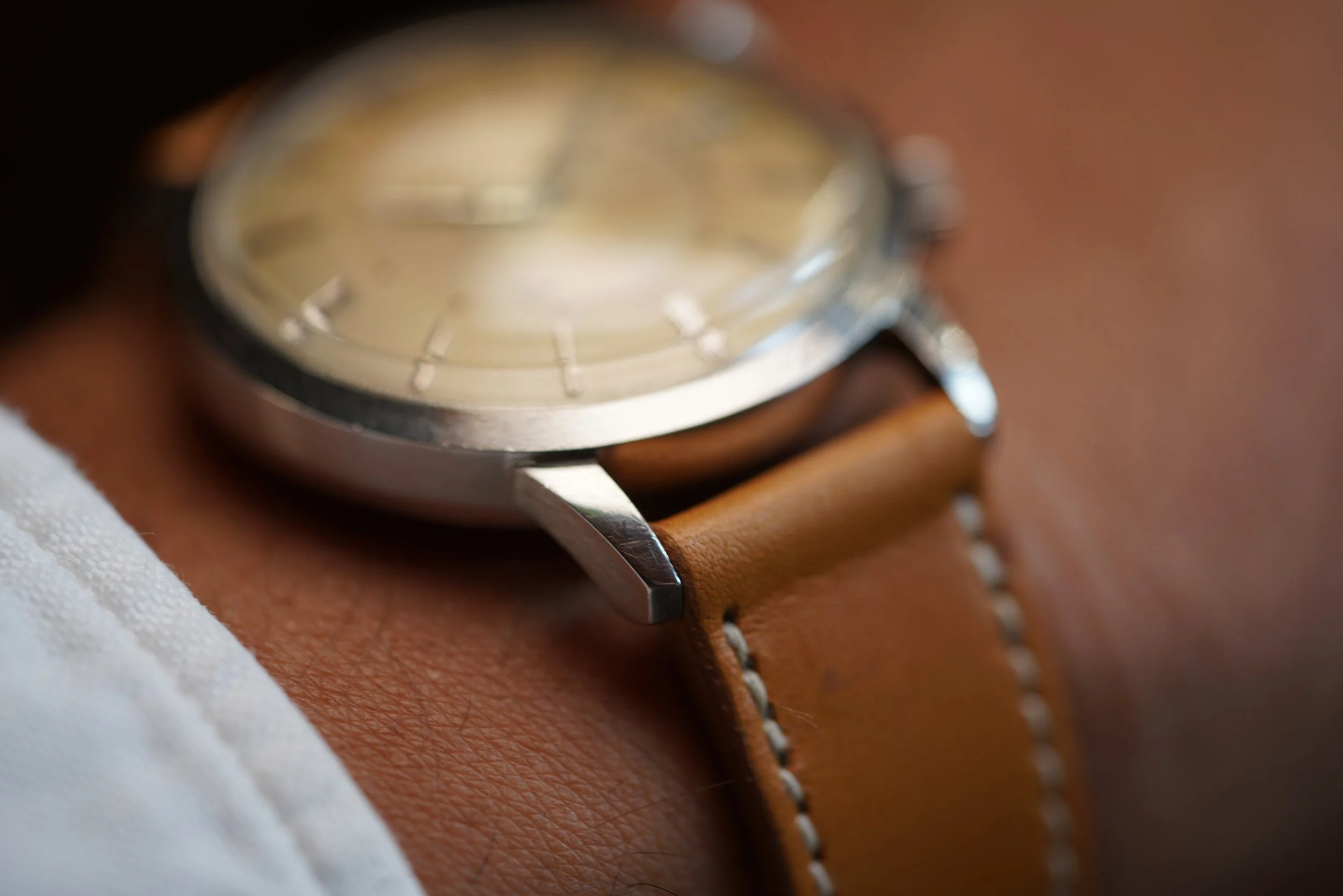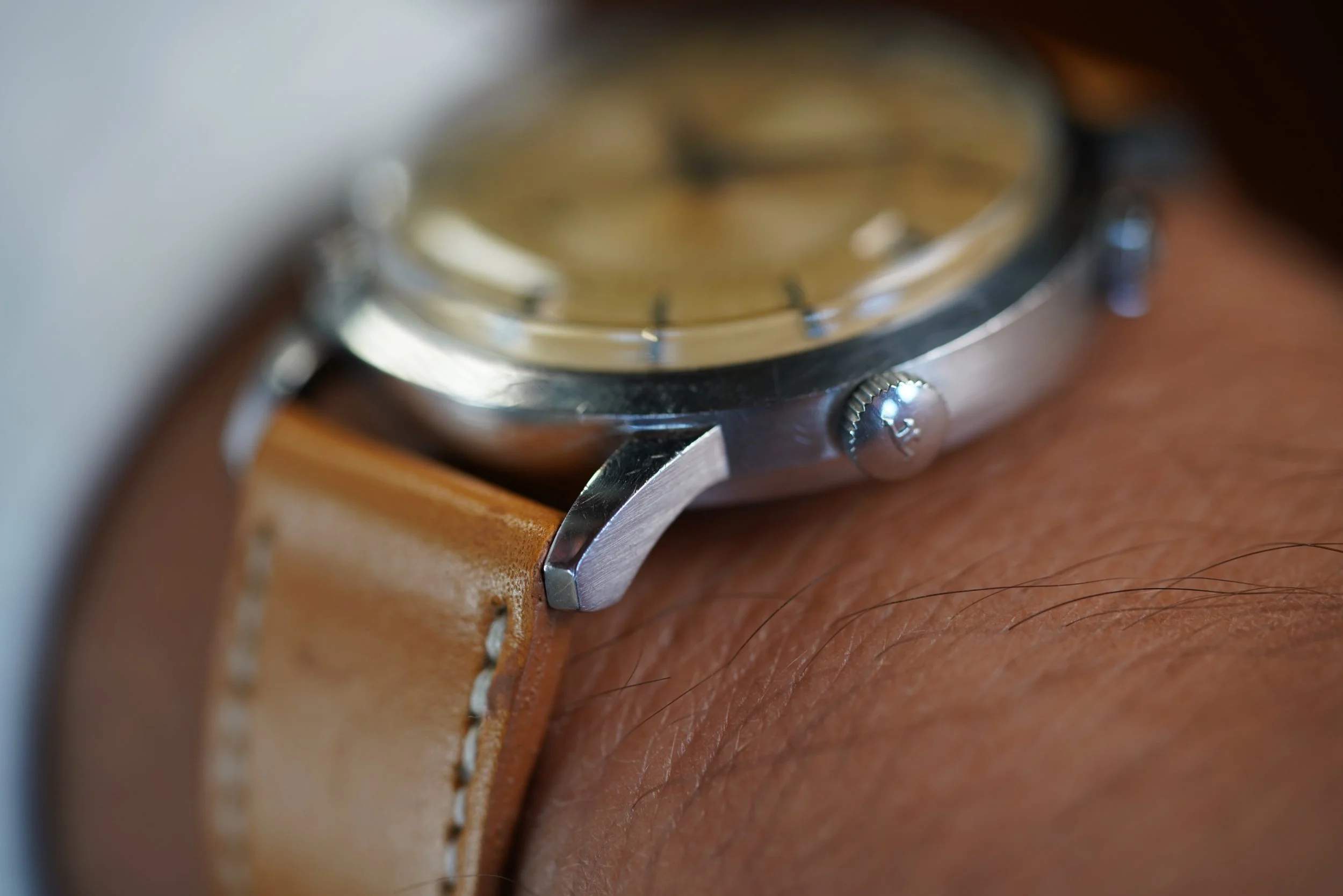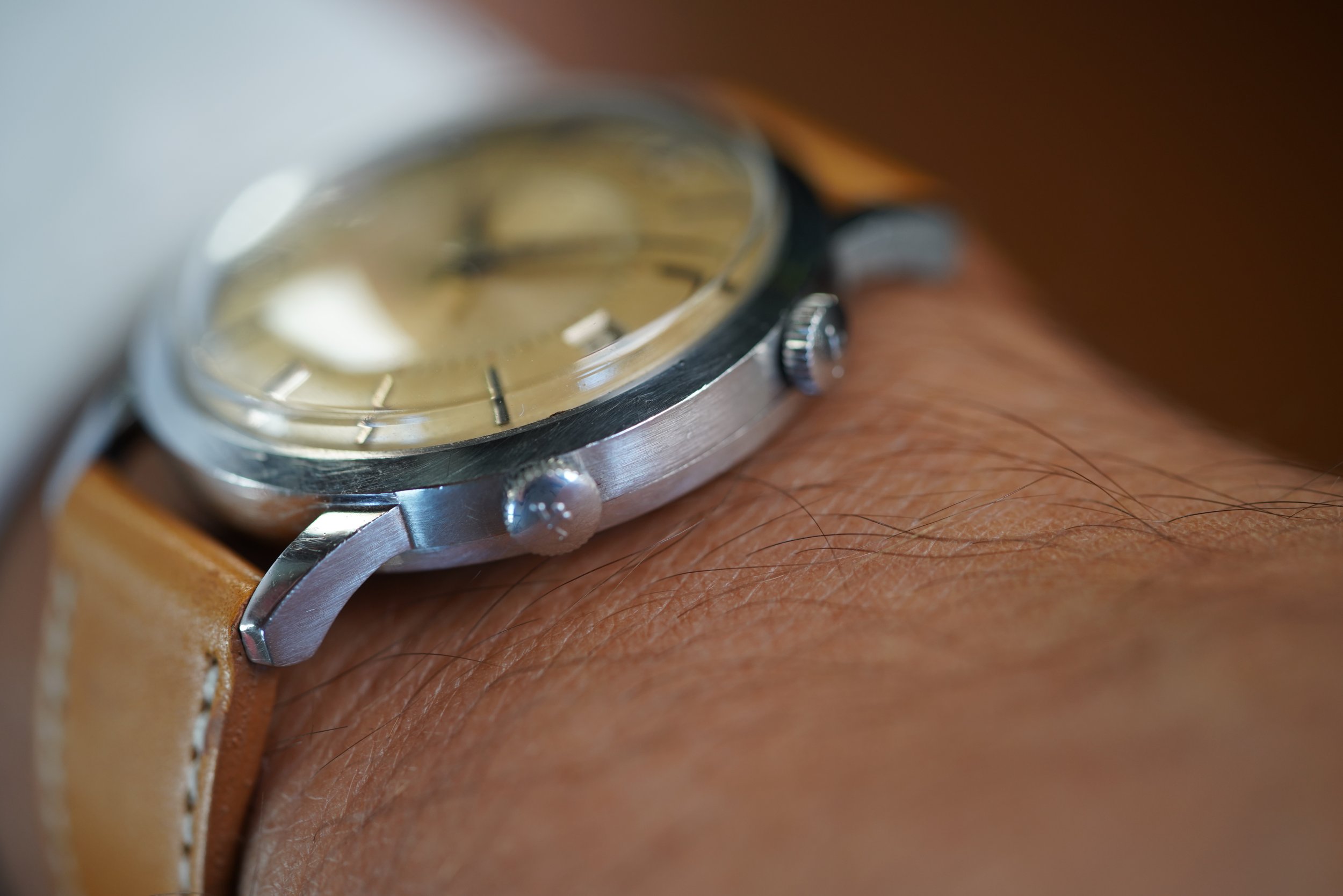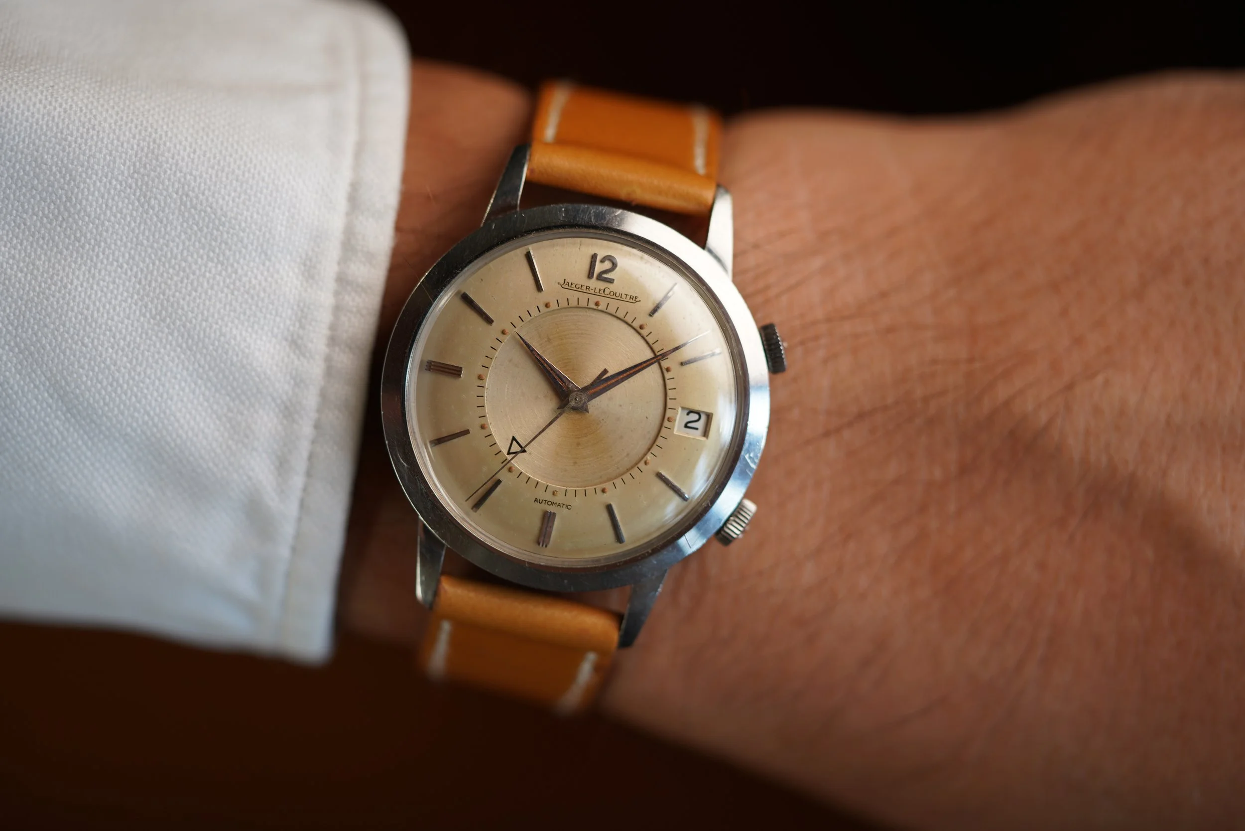 The Jaeger-LeCoultre Memovox reference E 855 is one of my favorite watches of all time. This example dates to circa 1959-1960. The case measures 37mm in diameter and wears excellent. The case appears to be unpolished. It is a MK I Memovox with the applied Arabic 12. These are quite uncommon and very cool variants. The dial has taken on a warm patina.