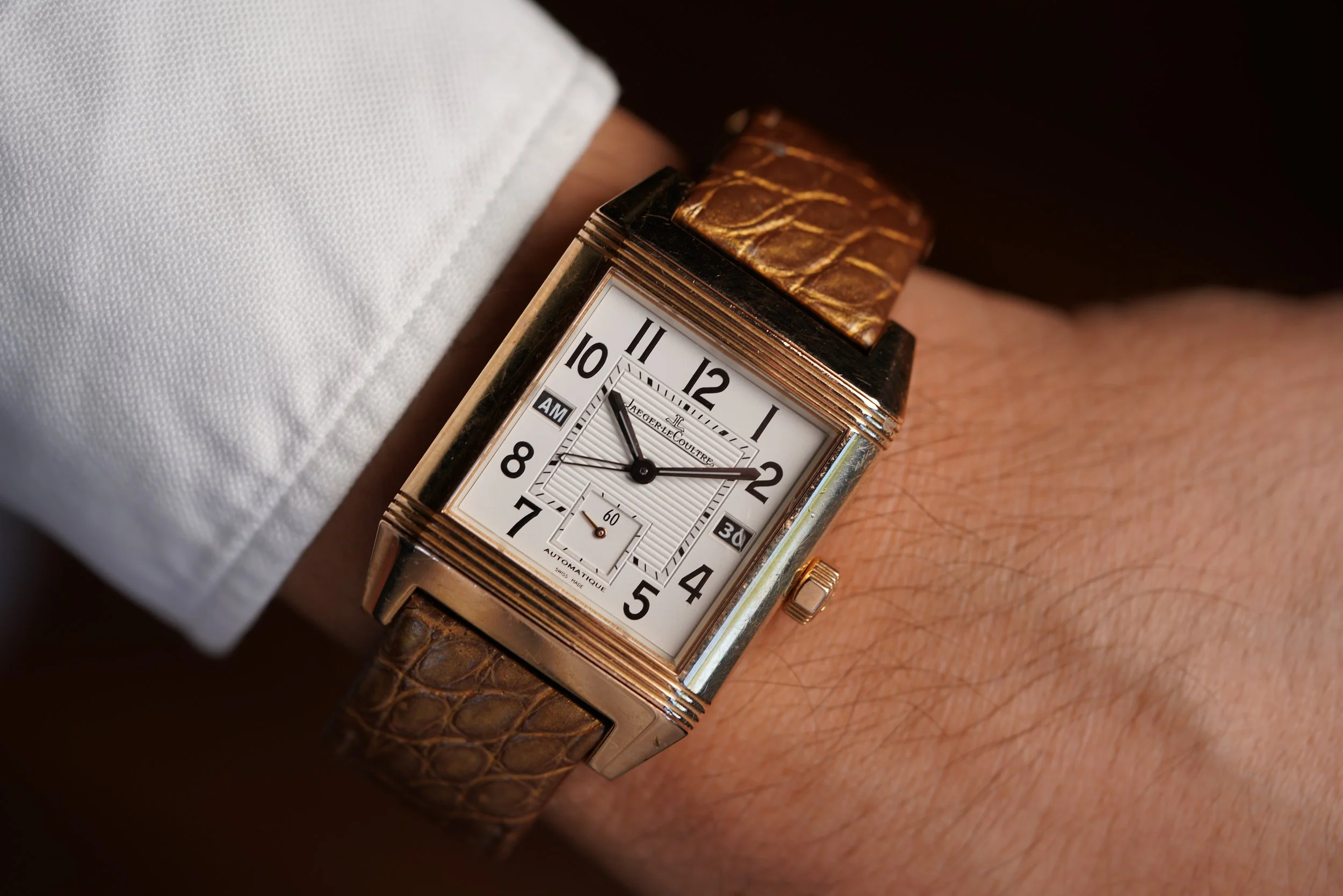 This Jaeger-LeCoultre Reverso Squadra Hometime 230.2.77 is a very cool and interesting Reverso! The case appears to be unpolished and made of 18K rose gold. It measures 35mm in diameter by 50mm in length. It is paired on a custom Jean Rousseau alligator strap with JLC deployant.