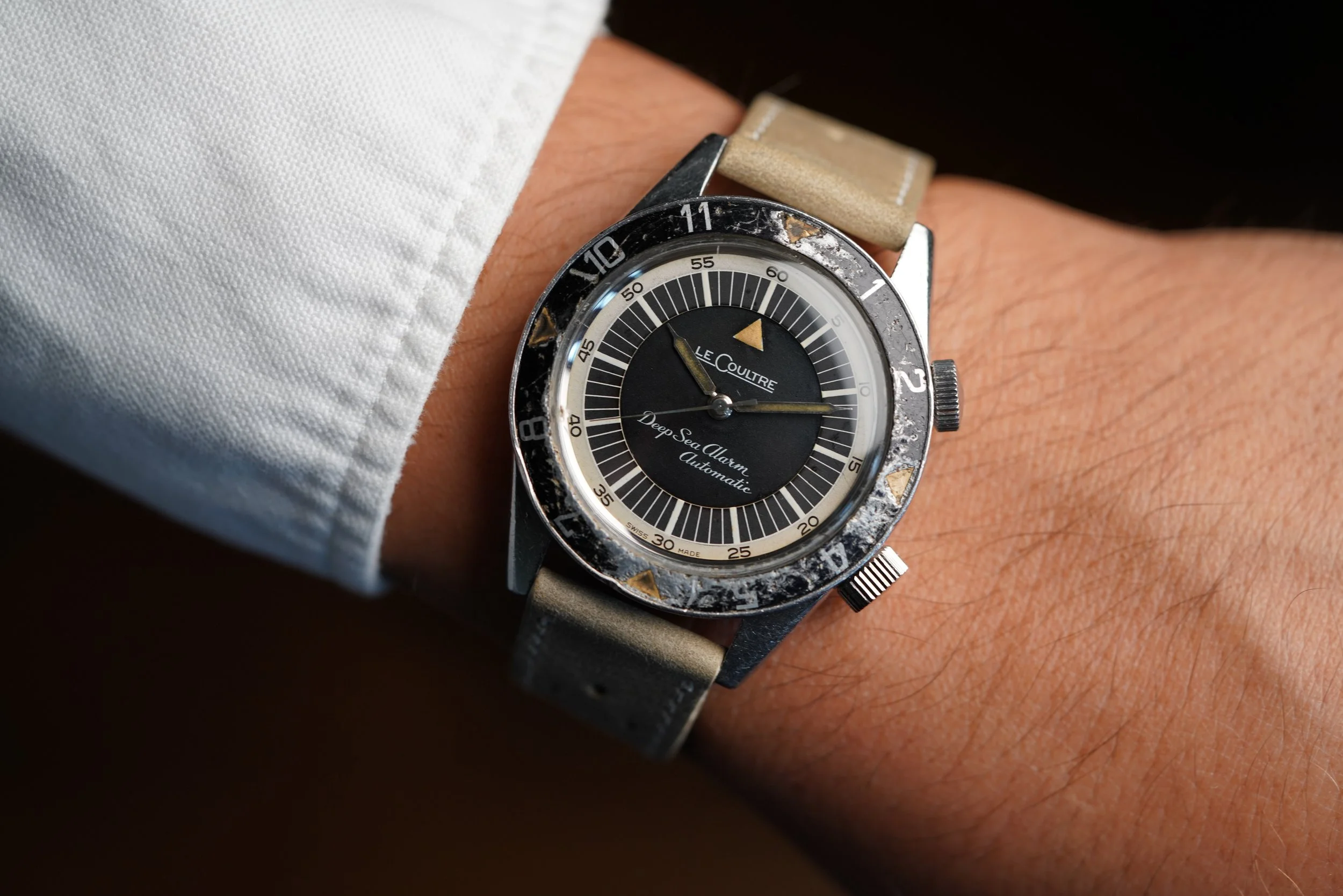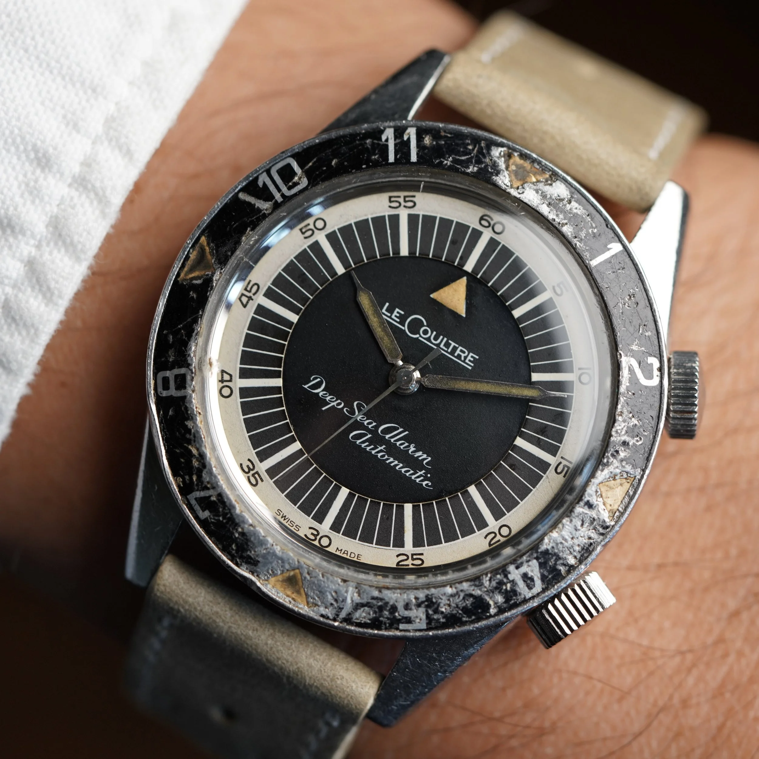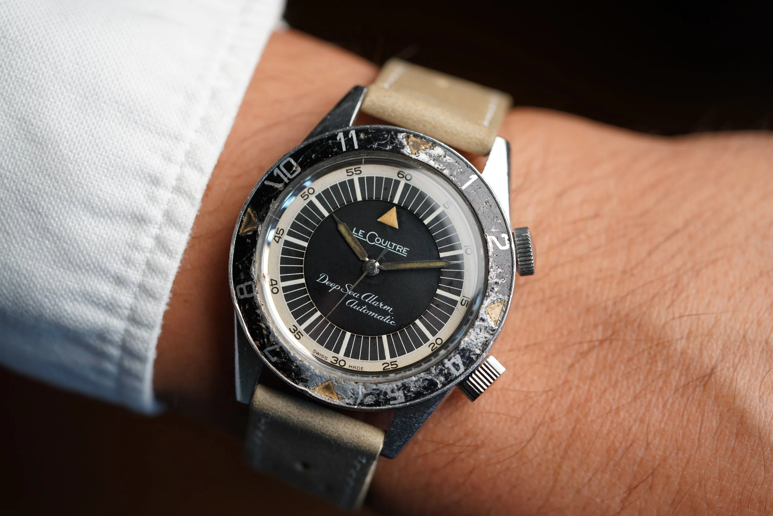 The LeCoultre Deep Sea Alarm Automatic reference E 857 is one of the most exciting vintage dive watches. These cases were made by Huguenin Frères and powered by the automatic alarm Jaeger-LeCoultre calibre 815.