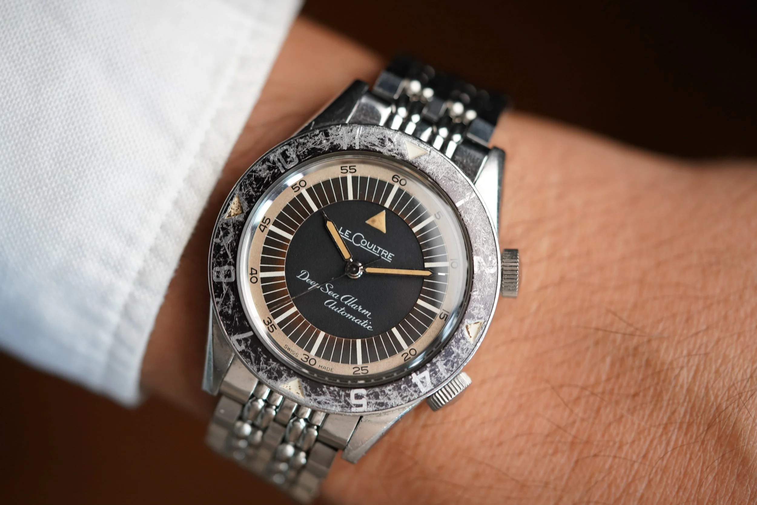 The LeCoultre Deep Sea Alarm Automatic reference E 857 is one of the most exciting vintage dive watches. These cases were made by Huguenin Frères and powered by the automatic alarm Jaeger-LeCoultre calibre 815. This example has a super attractive dial which has some brown tones. The case appears to be unpolished. The bezel insert features heavy wear but it is original. The hands are color matched service hands.