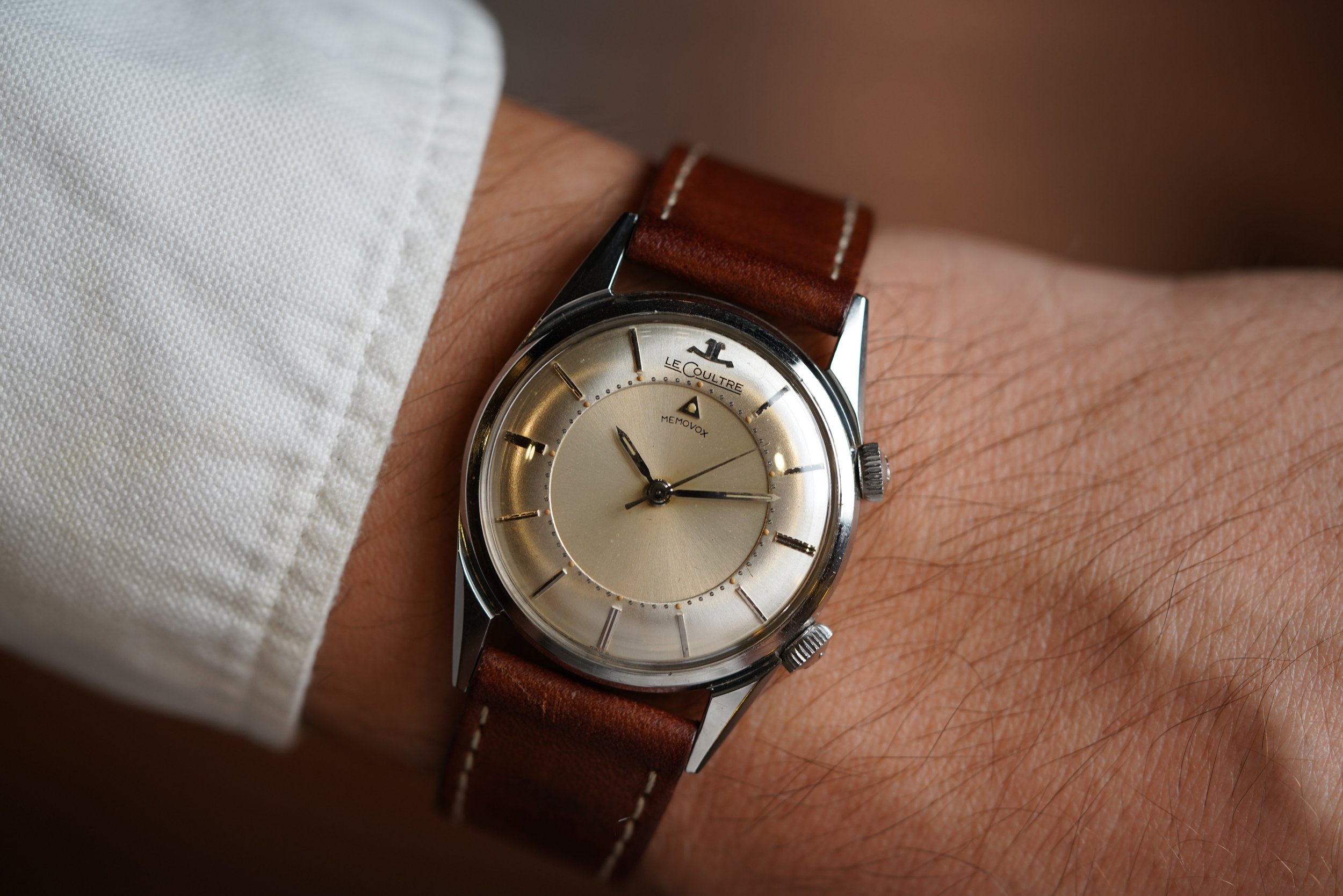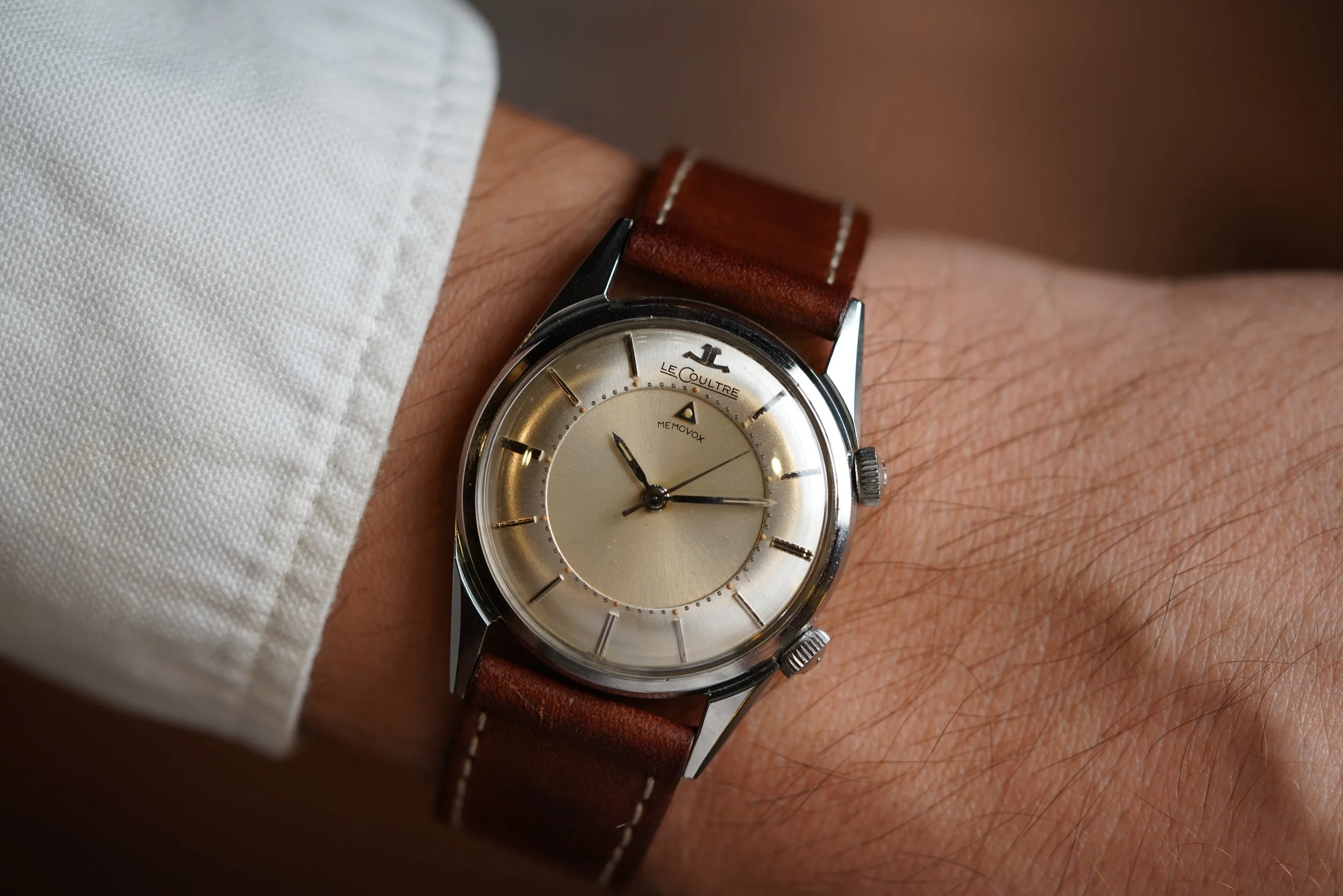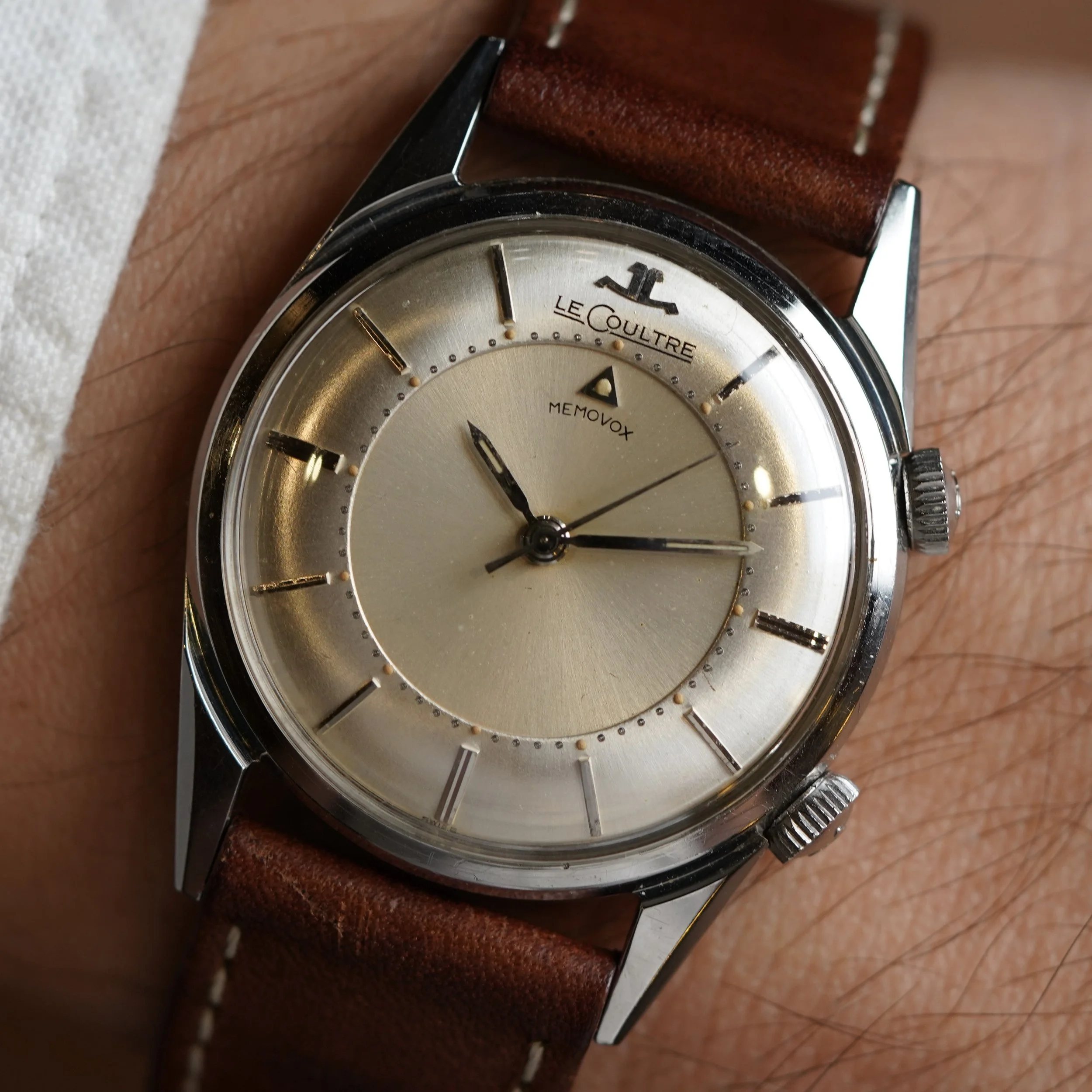 This LeCoultre Memovox reference 2404 is a fantastic example of Jaeger-LeCoultre models sold in the American market. This specific example features a case made by Star Watch Case Company, a casemaker based out of Ludington, Michigan. The watch is powered by the Calibre K814. The lug width is 19mm. The case is unpolished and measures 33.5mm in diameter (or 42mm lug-to-lug).