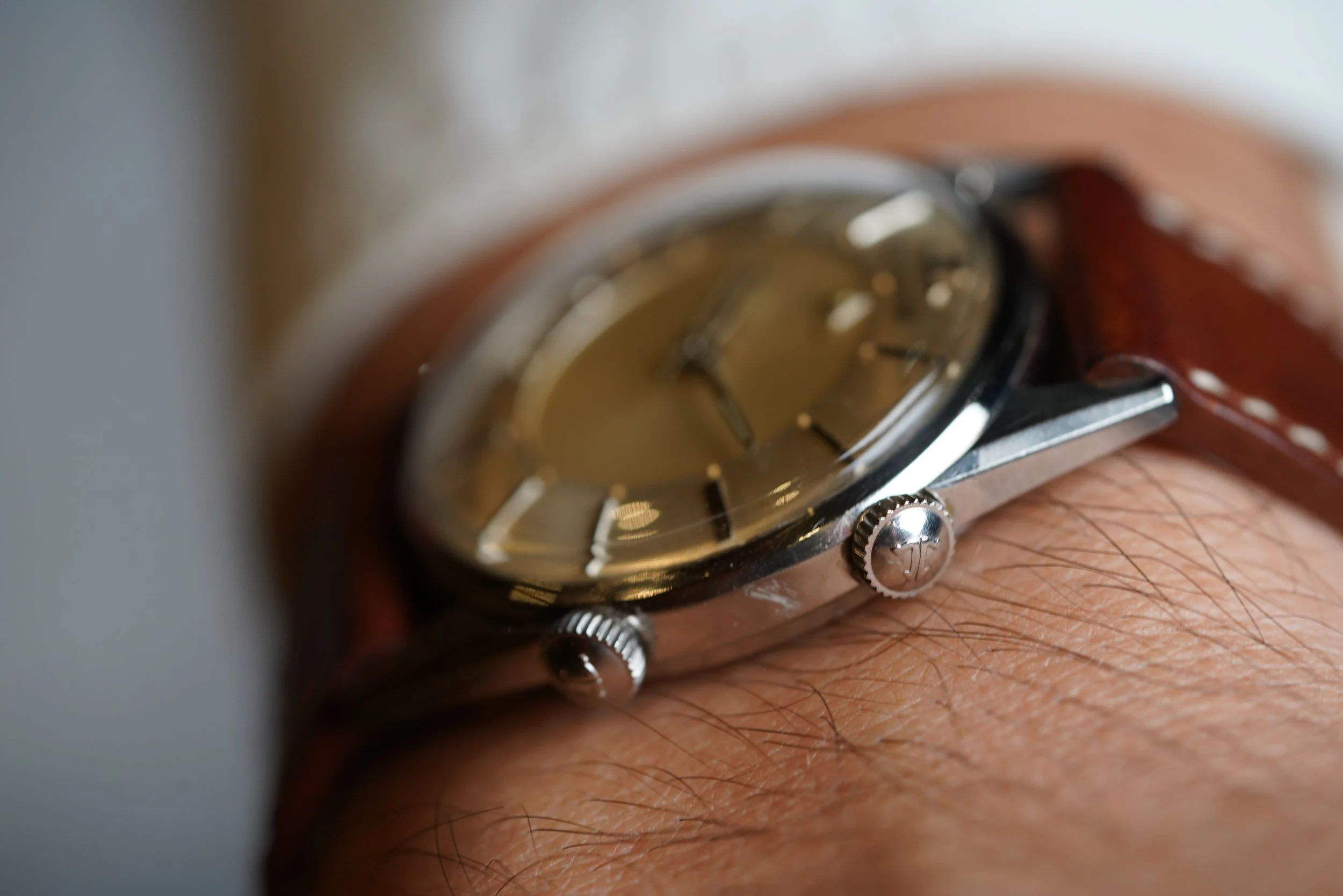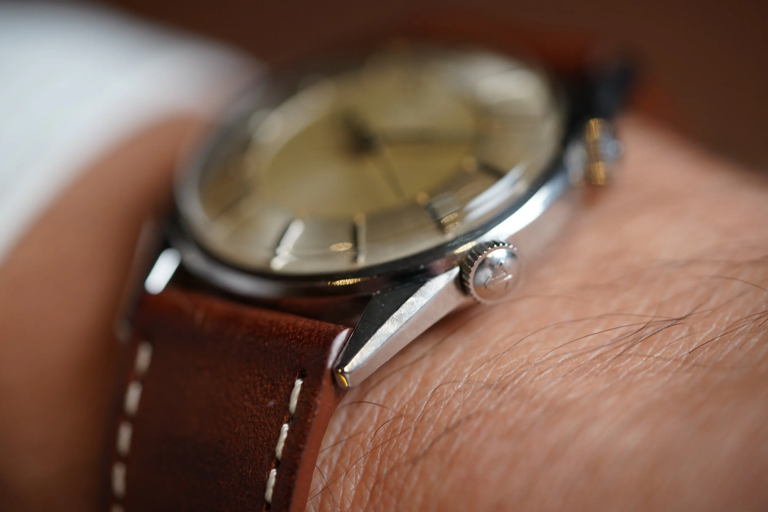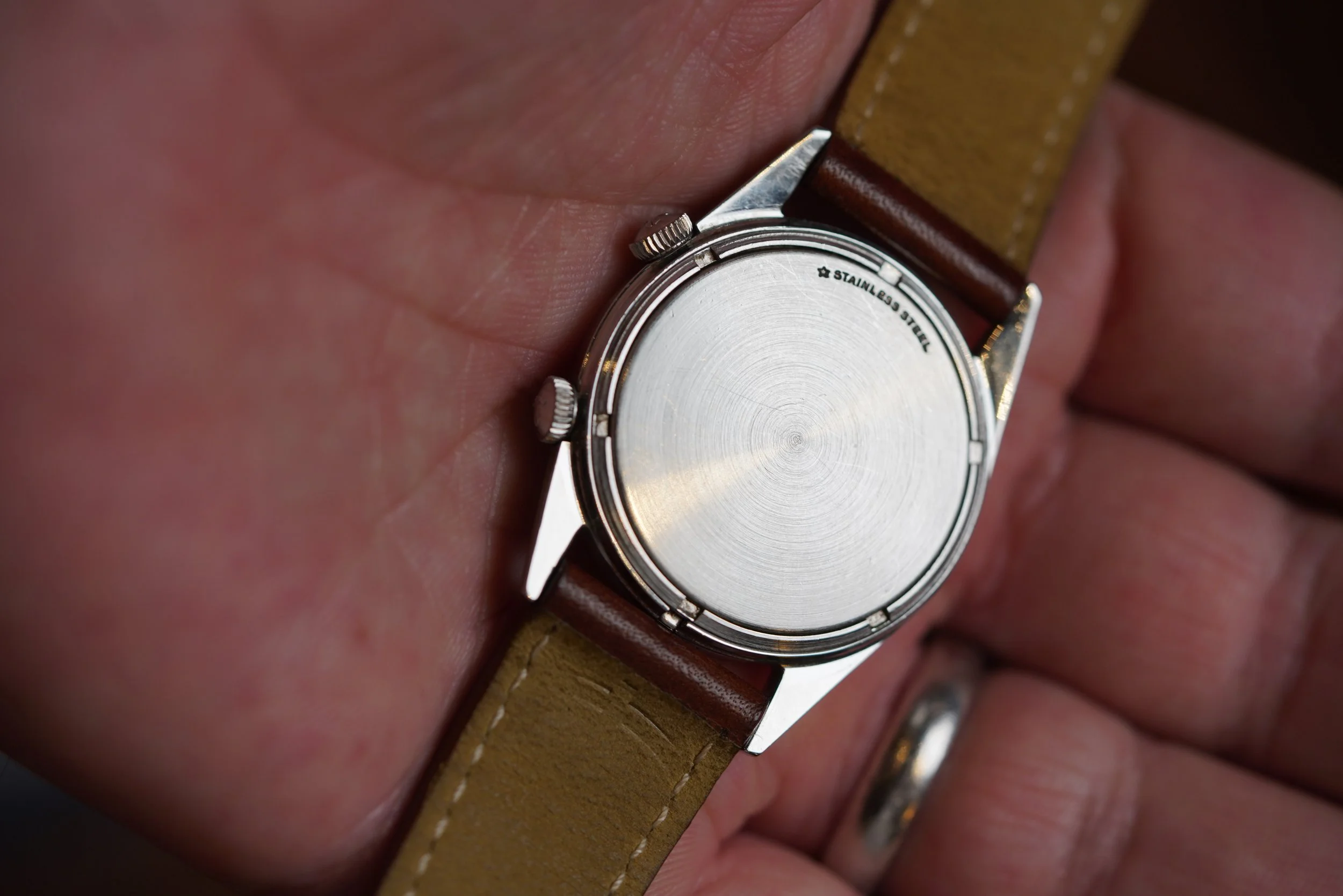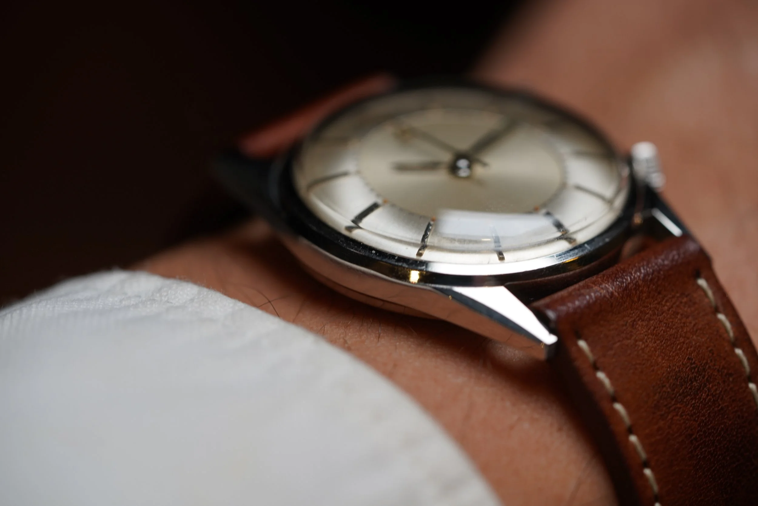 This LeCoultre Memovox reference 2404 is a fantastic example of Jaeger-LeCoultre models sold in the American market. This specific example features a case made by Star Watch Case Company, a casemaker based out of Ludington, Michigan. The watch is powered by the Calibre K814. The lug width is 19mm. The case is unpolished and measures 33.5mm in diameter (or 42mm lug-to-lug).