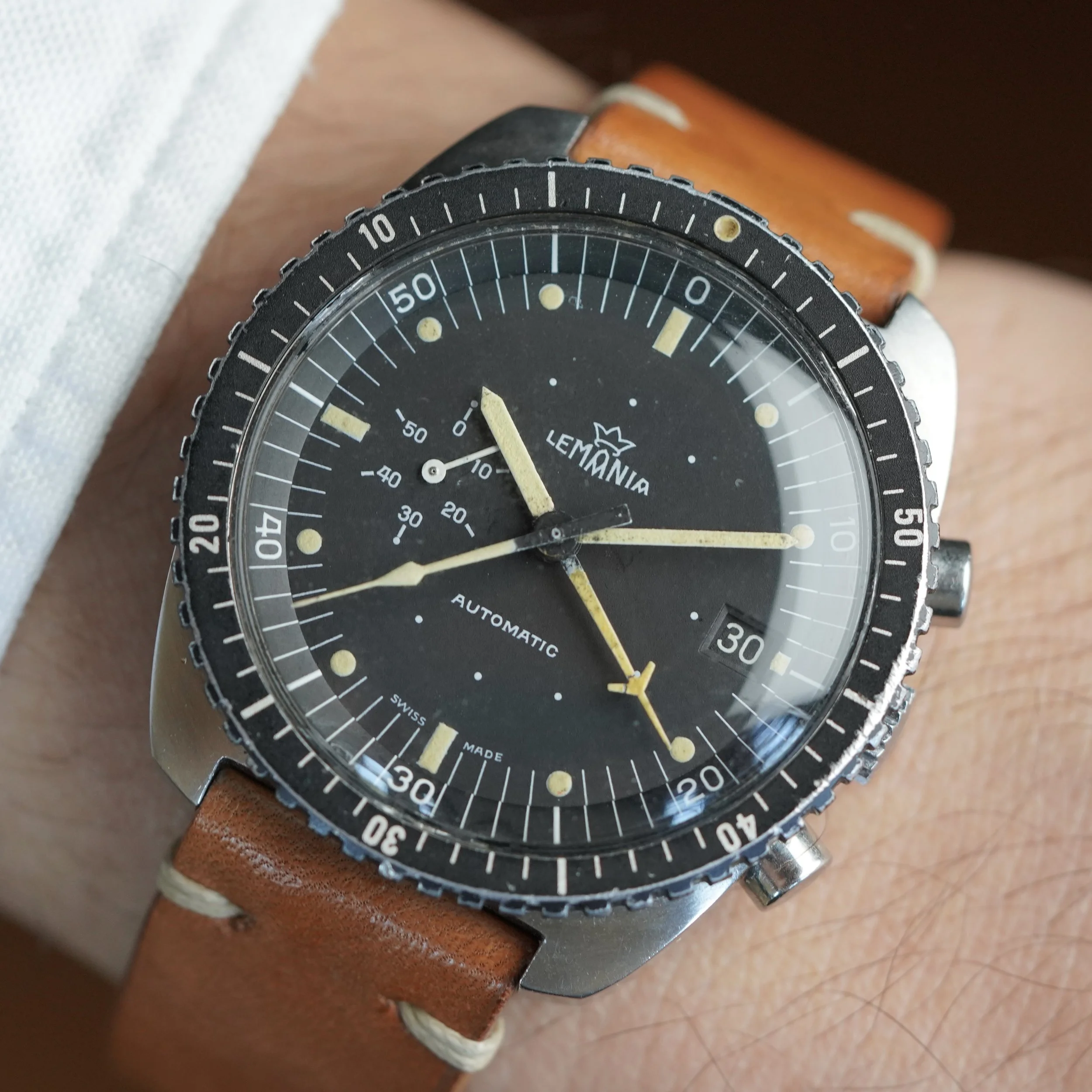 The Lemania 5012 SAAF (South African Air Force) is a very cool and rare model. These watches were issued in the 1980s and it is estimated that 800 examples were sent to the SAAF. The watch is powered by the Lemania calibre 5012 automatic chronograph. The case measures 41mm in diameter. The case appears to be lightly polished.