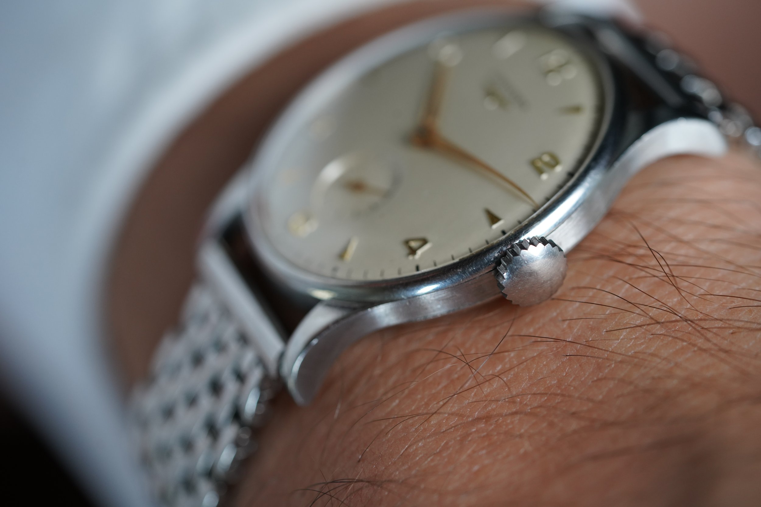 This Longines reference 5356 is an incredibly special timepiece not only because of the outstanding condition of the watch, but also the story behind it. The watch is one of 2 reference 5356s that were awarded in The 1952 Winter Army Championship in Andermatt. The case is engraved with “Internationaler Militar-Skipatrouillenlauf 1952 Andermatt (Schweiz) 1. Rang” - “International Military Ski Patrol Run. 1st Place.” The watch was left unworn for many years - and the sibling model was the original owner/reciepients watch he wore frequently. The dial on the 2nd example shows signs of humidity and wear to the case and was likely worn while skiing over the years.