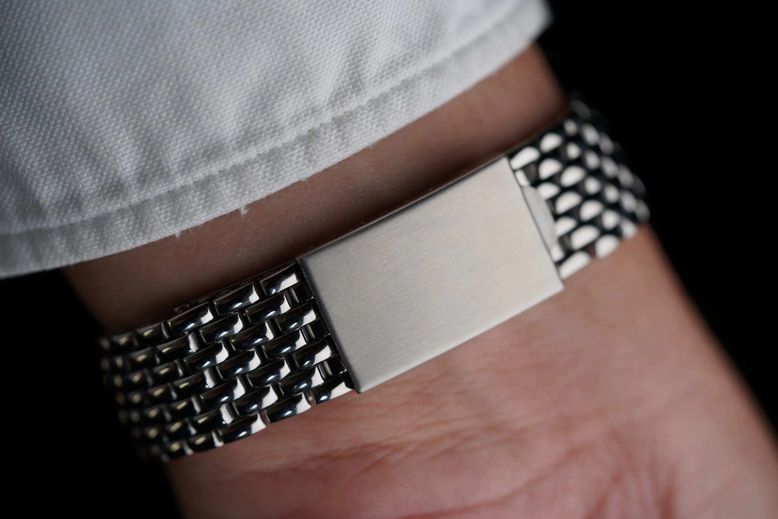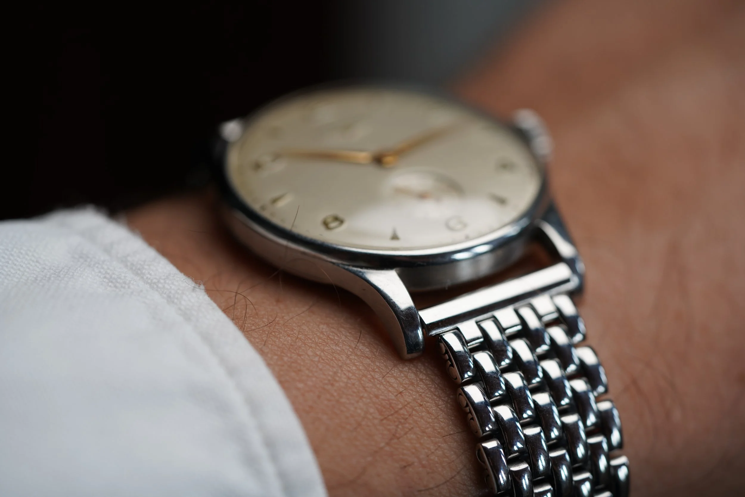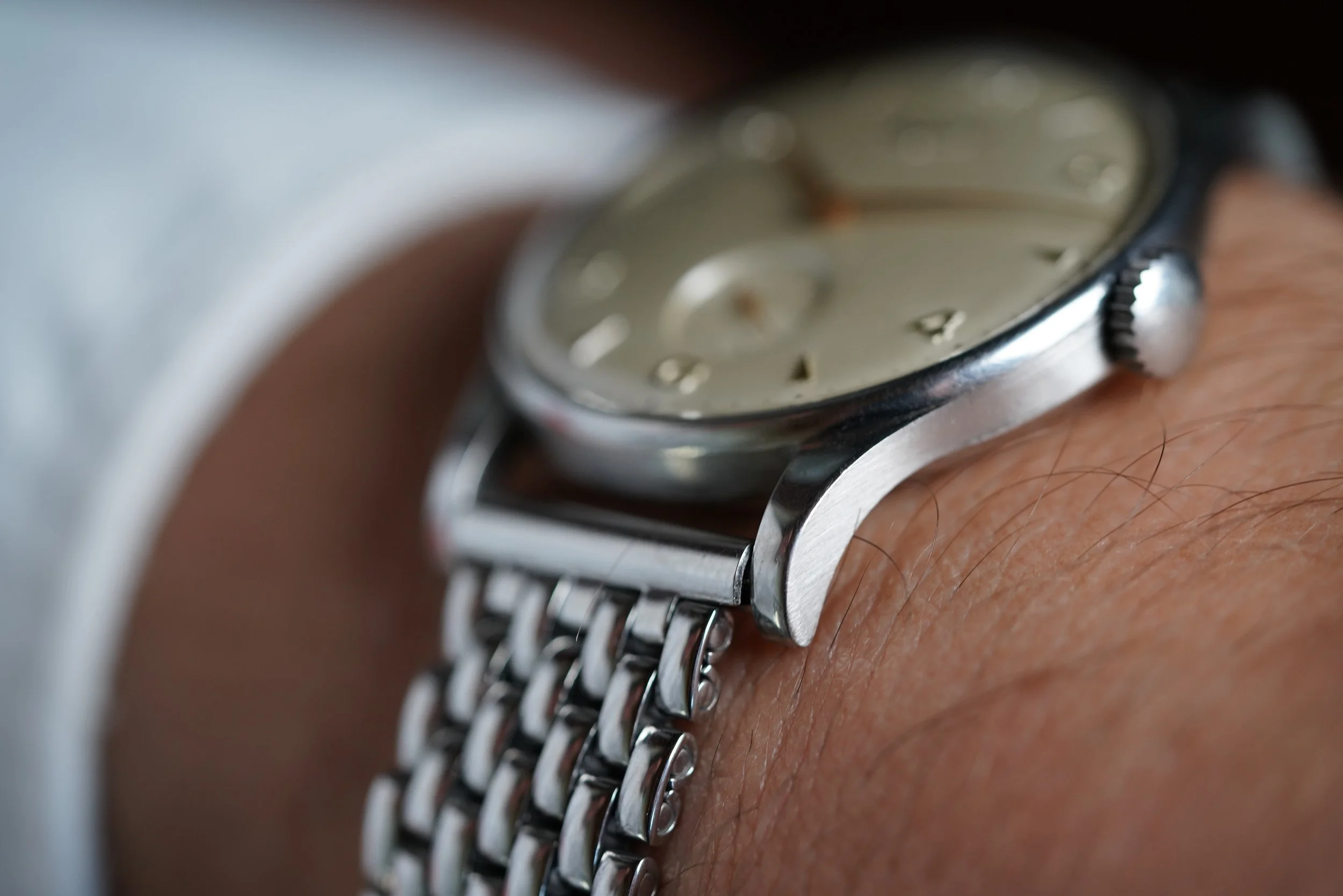 The case measures 35mm in diameter. It is unpolished and in phenomenal condition. The dial is pristine. The reference 5356 is powered by the calibre 12.68Z, a manual wind movement with sub-seconds. The 12 ligne movement operates at 18,000 VPH and is comprised of 17 jewels. The watch is paired on a contemporary beads or rice bracelet made by Private Eyes.