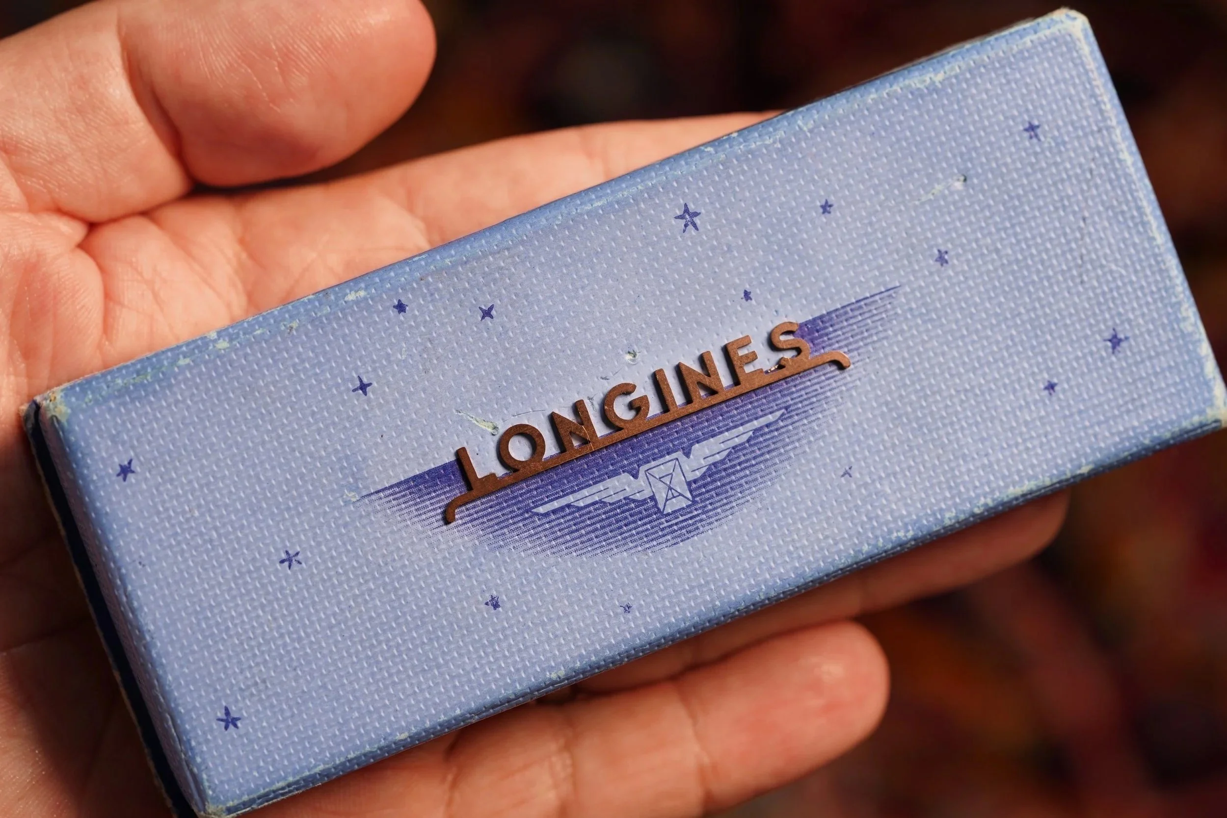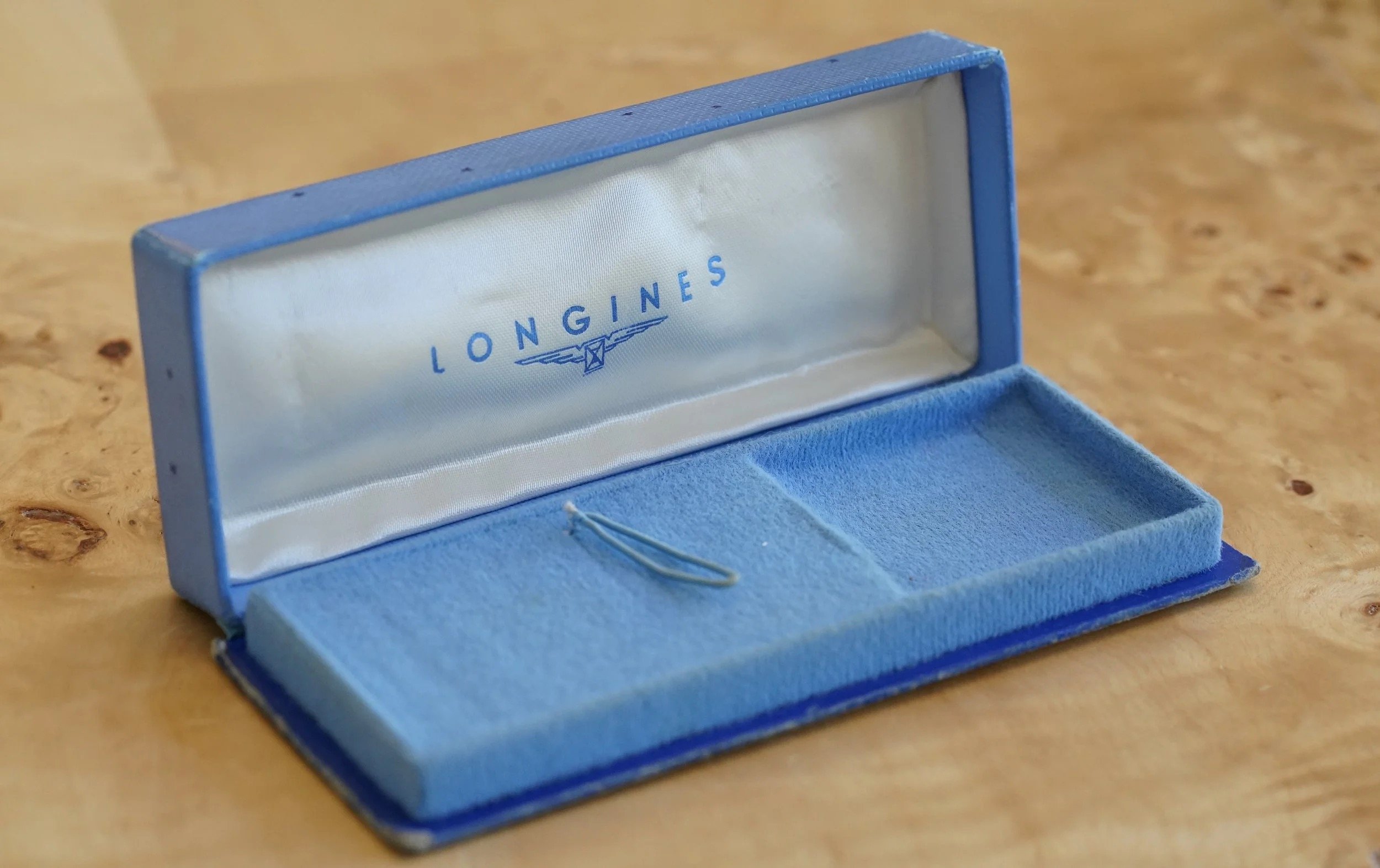 We do not know the service history, but the watch is running well. It does not come with papers. It does come with an incredibly rare blue Longines presentation box featuring a midnight flight into a cloud-shaped winged-hourglass. These boxes are insanely rare and some of the coolest boxes of the era!