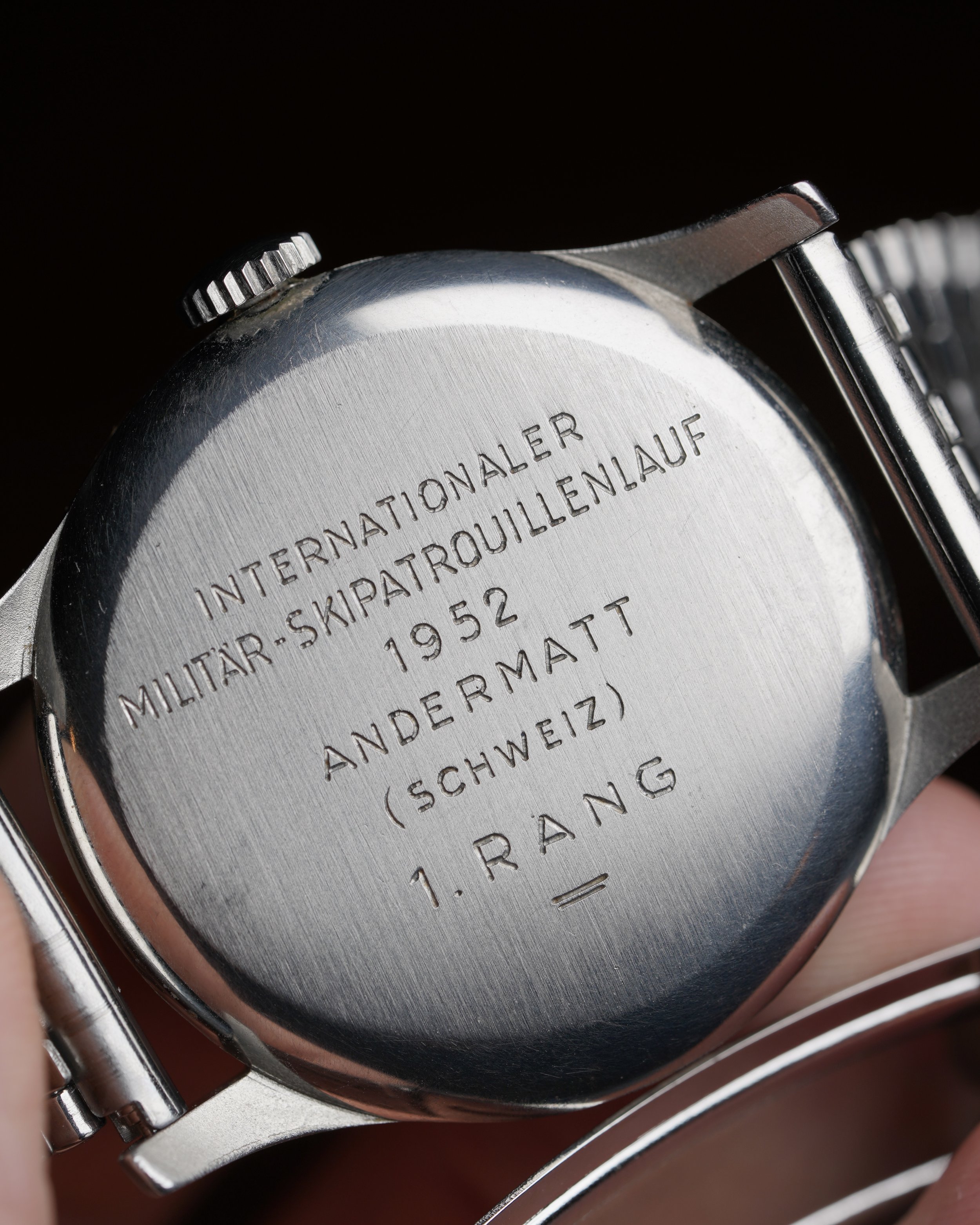 Researching the provenance engraved onto the timepieces found the story of Melker Risberg (also spelled Melcher). Born February 16, 1930, Risberg was a celebrated Swedish cross country skier who competed throughout Europe. He was recognized in several articles for his 2nd place in the International Singles Ski Race during the 1952 Die grossartigen Winter-Armeemeisterschaften in Andermatt (The great winter army championships in Andermatt). He would cover the 18-kilometer distance in a ranked time of 1:19:19 just behind his Swedish teammate Adolf Wiklund by merely 32 seconds. For the 1st place timepiece - research highlights it was earned alongside his Swedish teammates in the 28km patrol run. Among Sweeden Team I’s participants were Sundberg, Adolf Wiklund, [Melker] Risberg, and Sdt. Jonsson.