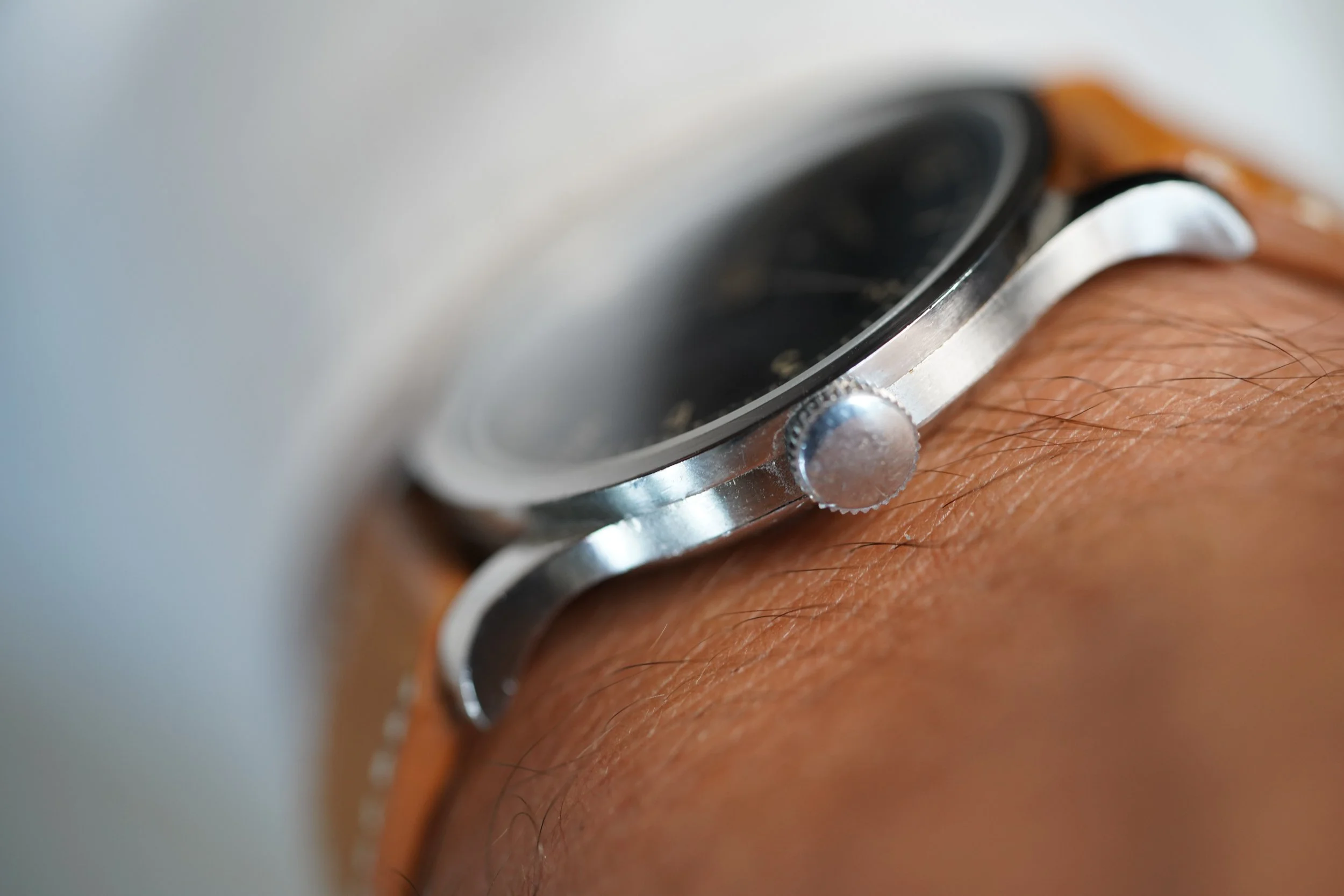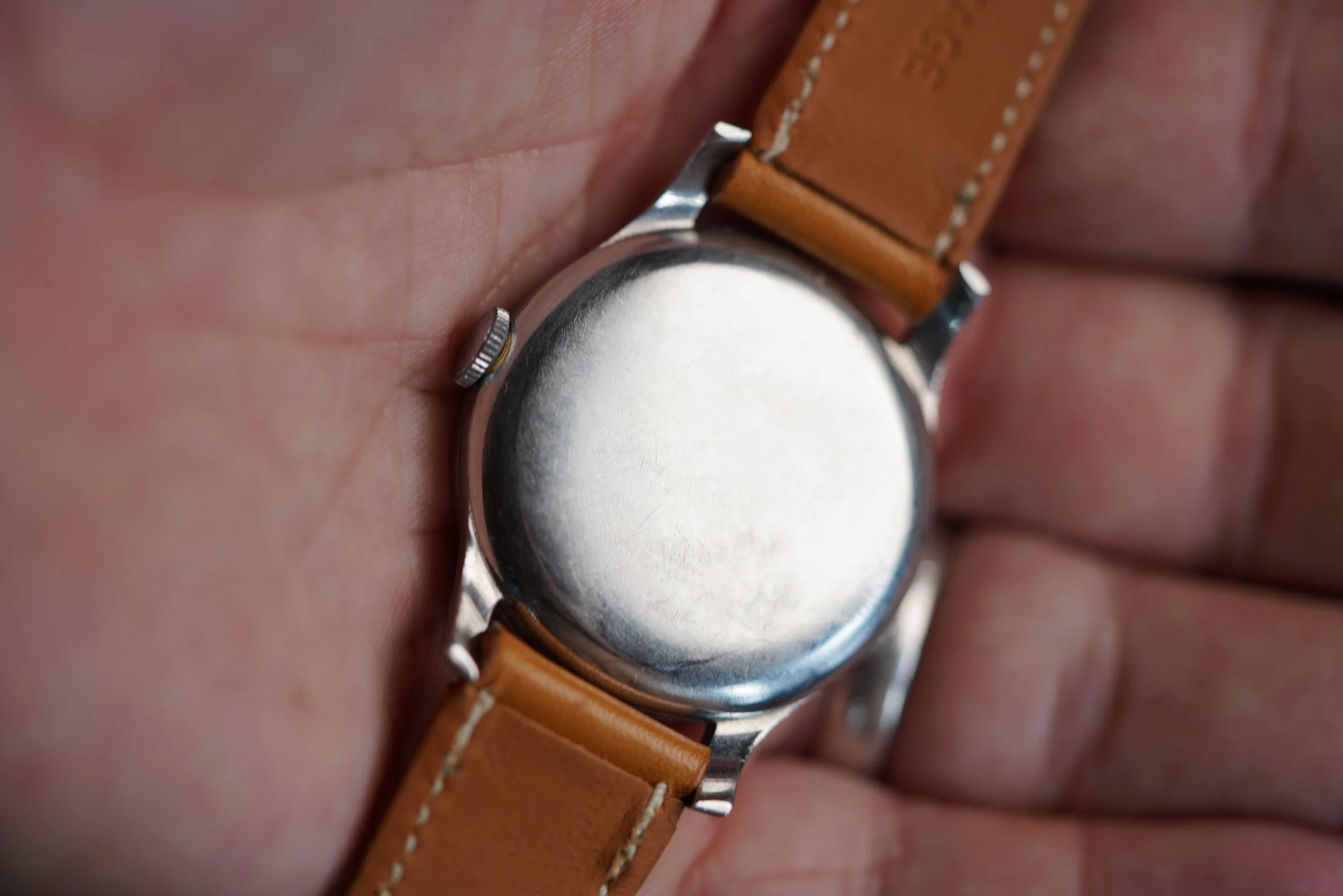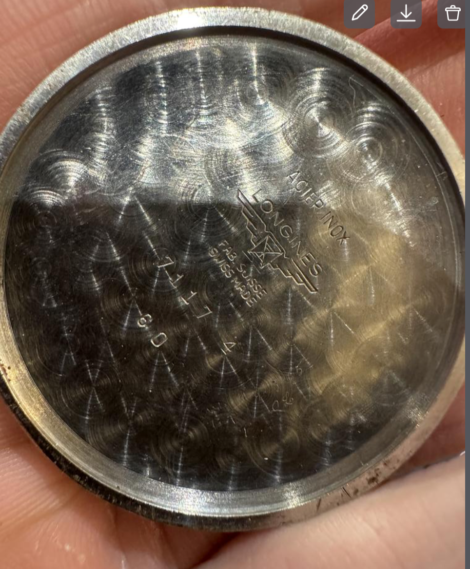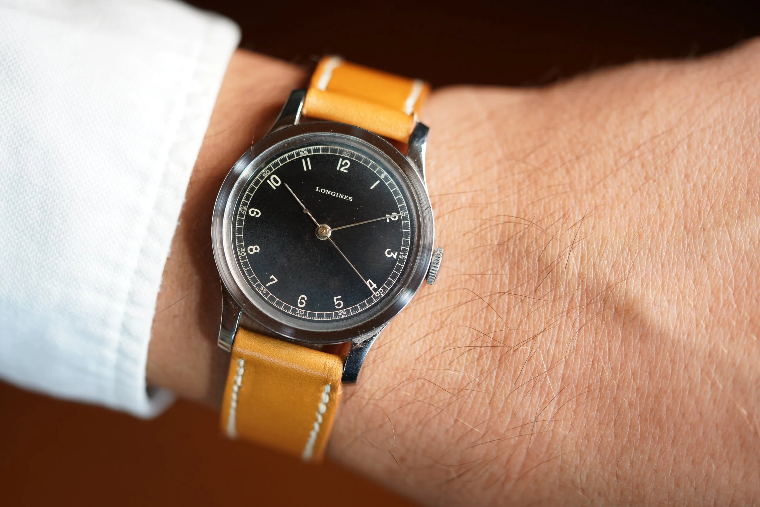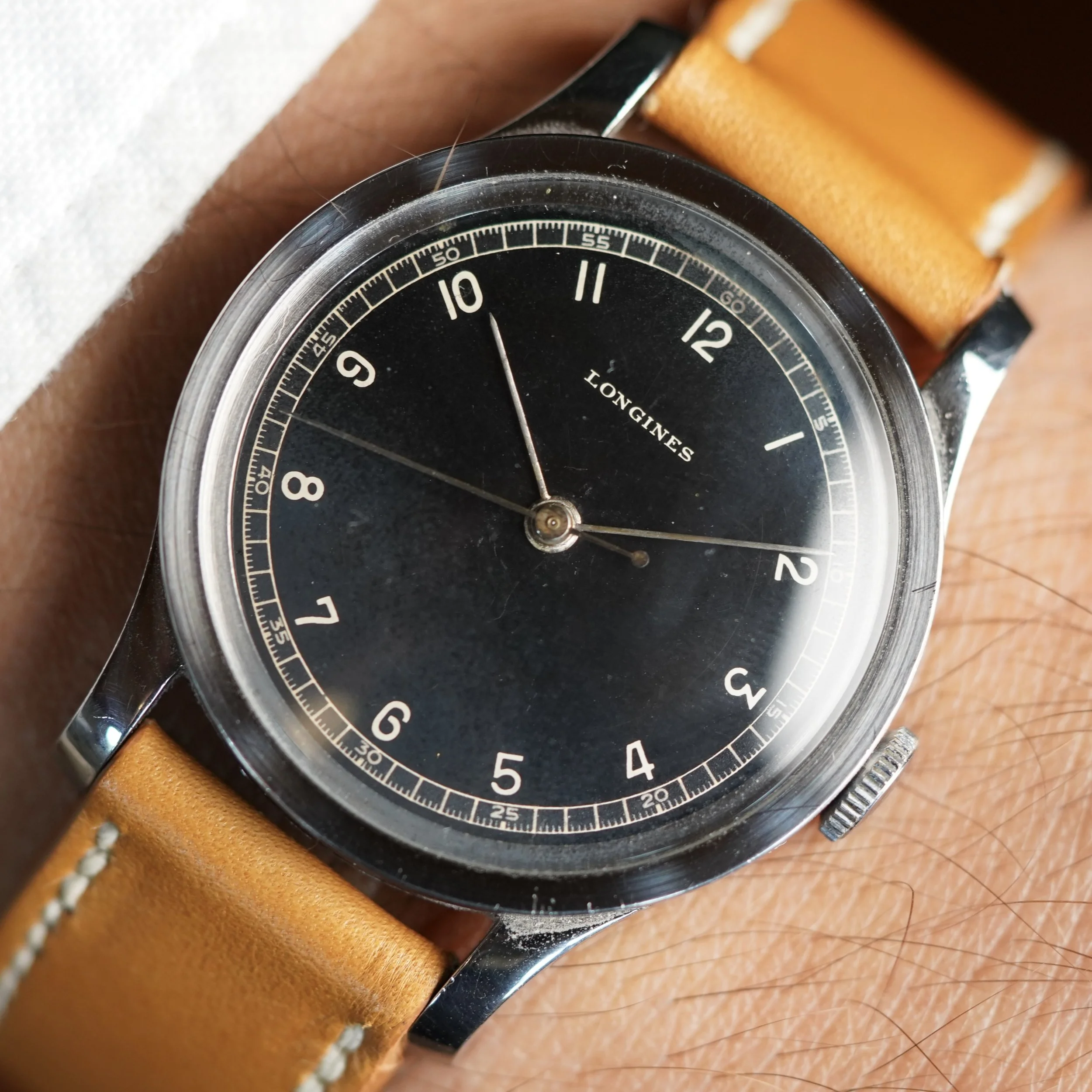 This is a cool time-only Longines with non-luminous gilt dial. I features Arabic numerals. The case is in stainless steel and measures 35mm in diameter and approximately 43mm lug-to-lug. It is powered by a manual wind movement. The case appears to be unpolished. It appears to have the original mineral crystal. It appears to be a reference 7117 - 4.