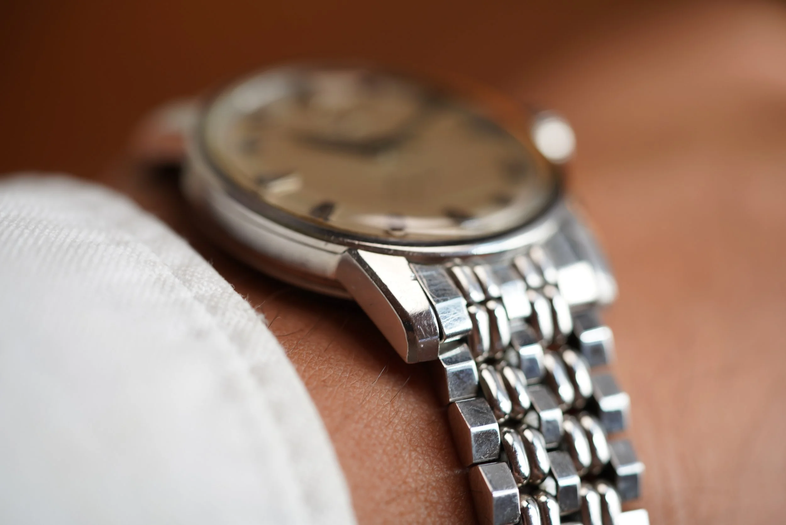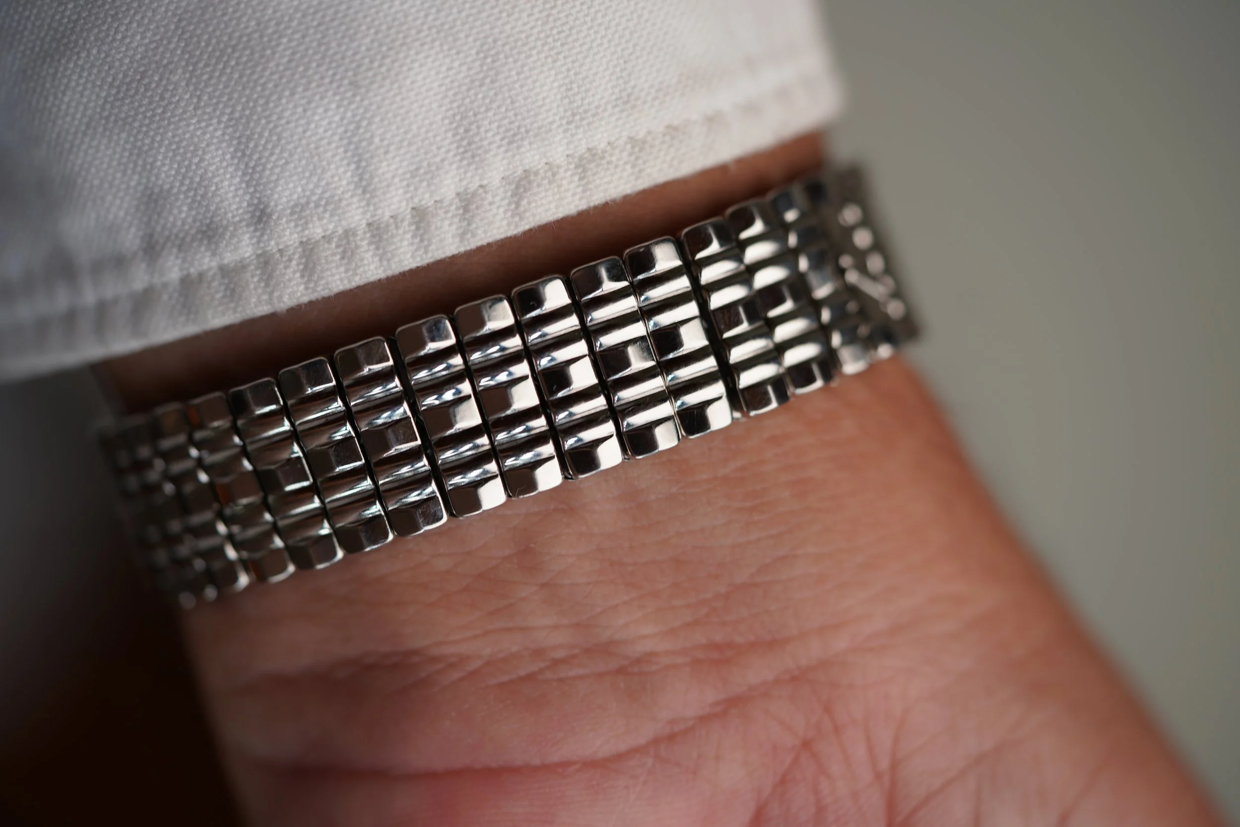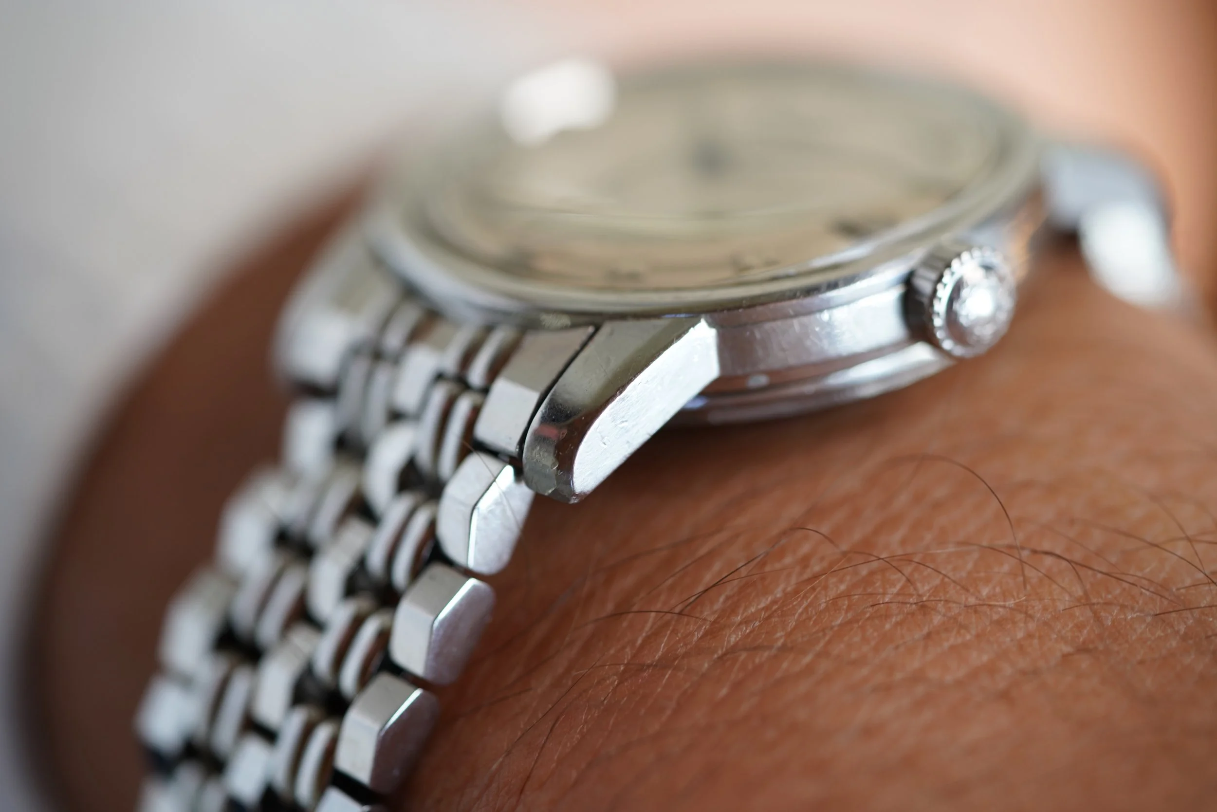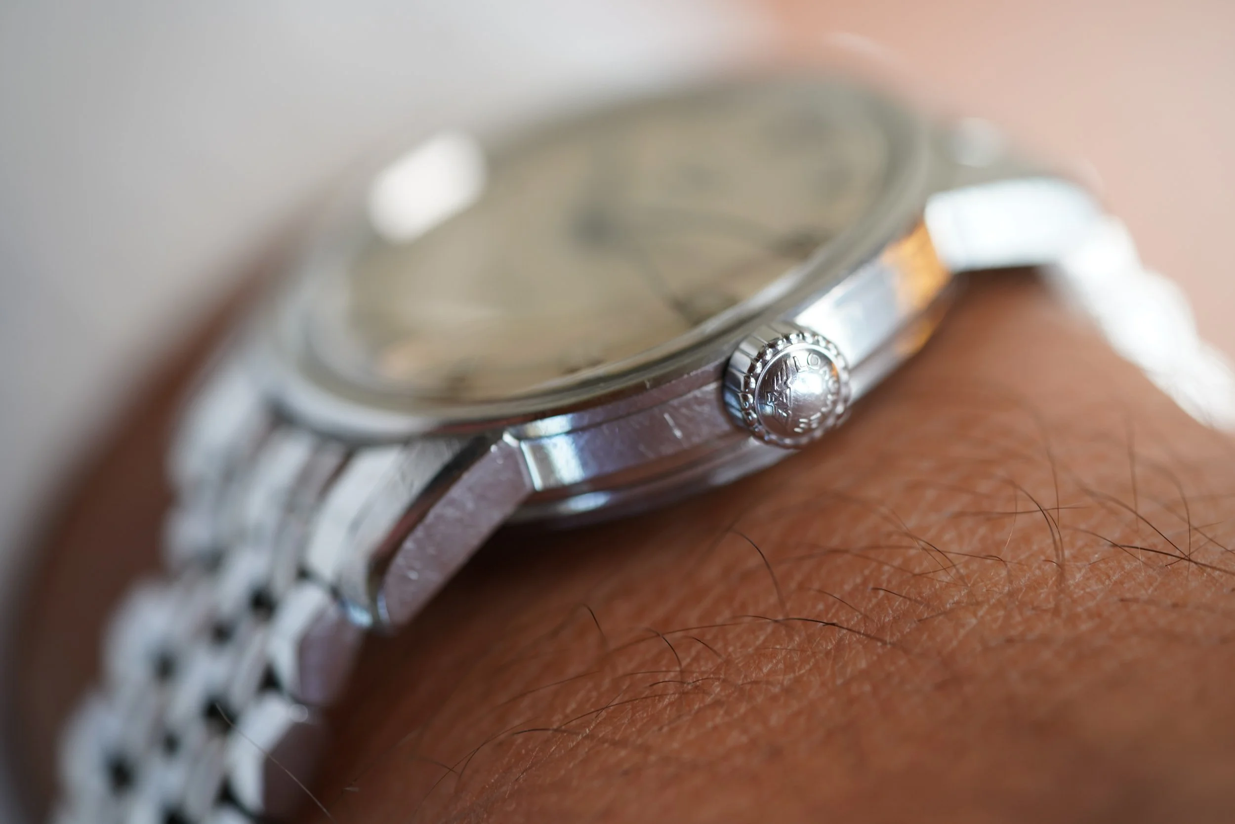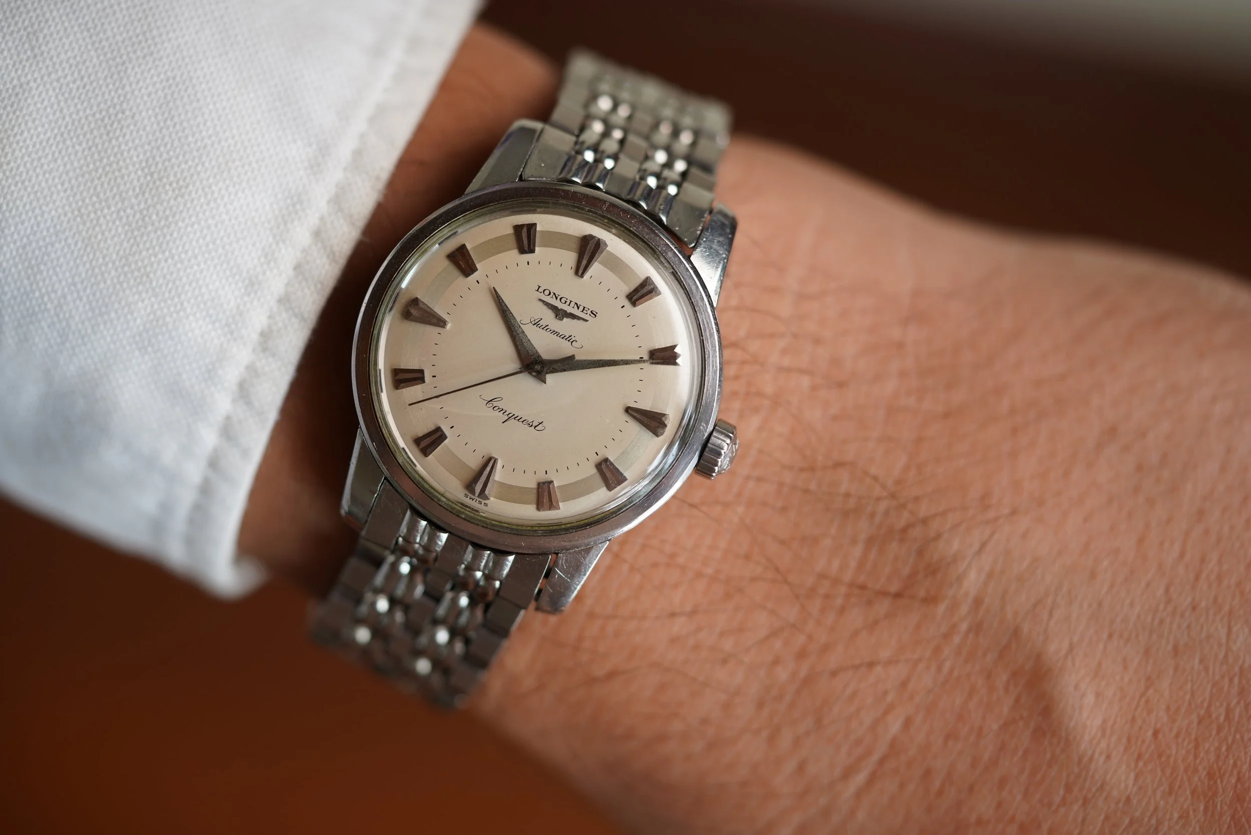This is an extremely attractive example of the iconic Longines Conquest line. The dial features a two-tone silvered dial which is out of this world. The case is unpolished. The watch dates to the late 1950s. It measures 35mm in diameter and 43mm lug-to-lug. It is paired on a very rare Wittnaur Nautilus bracelet made by JB Champion that is the same style these were sold on.