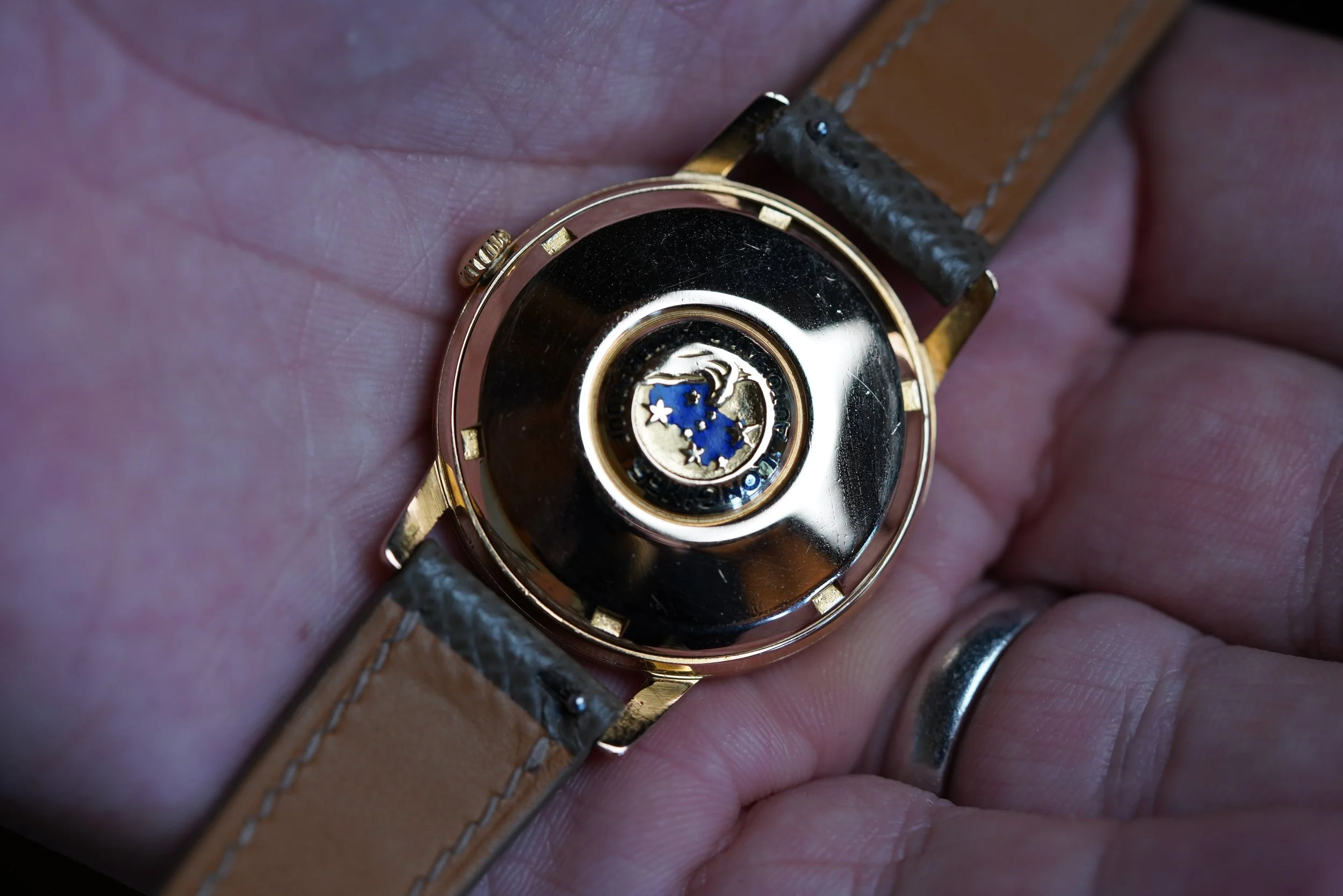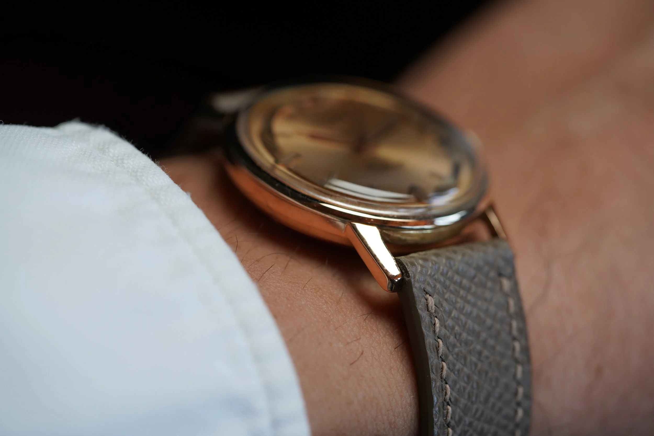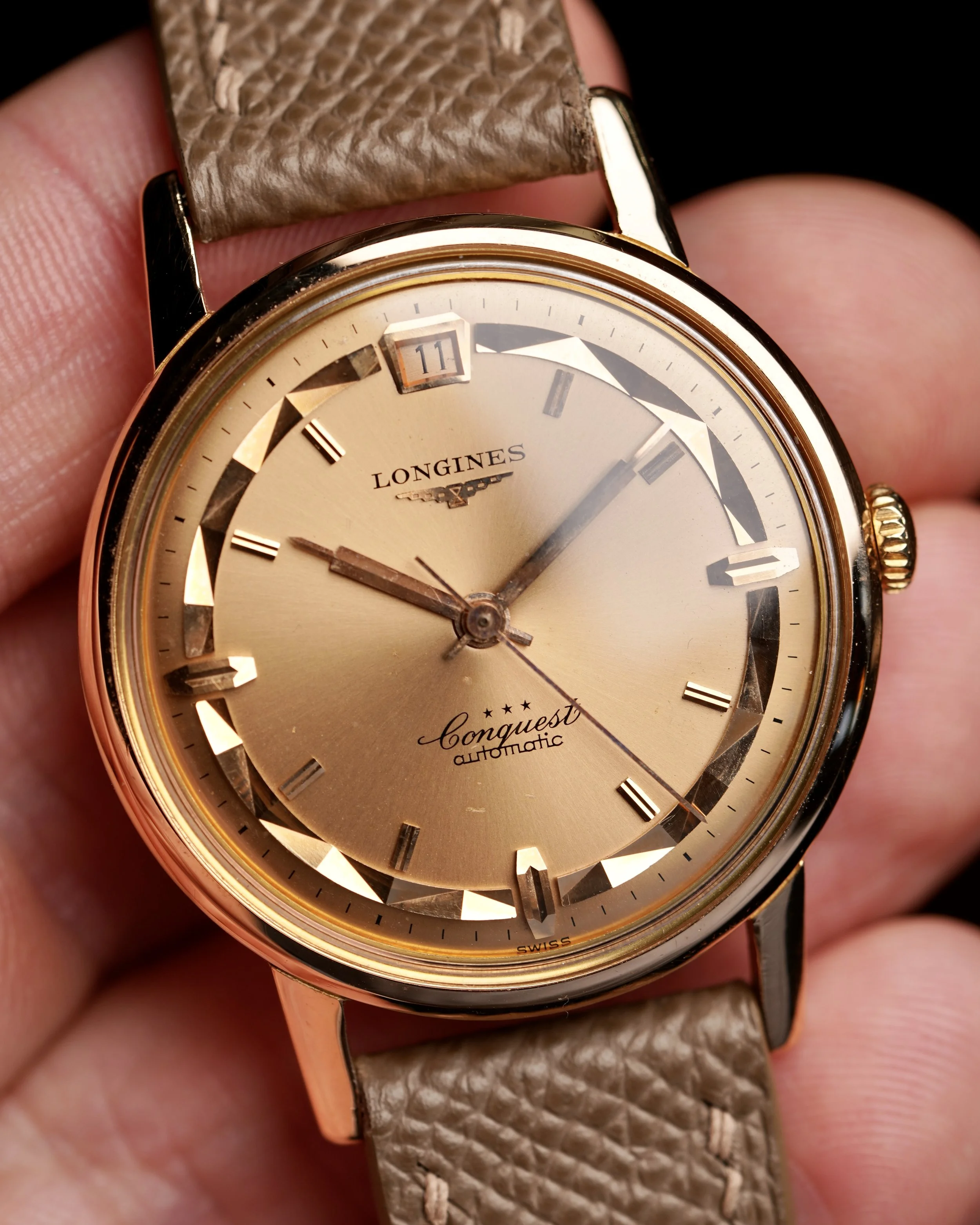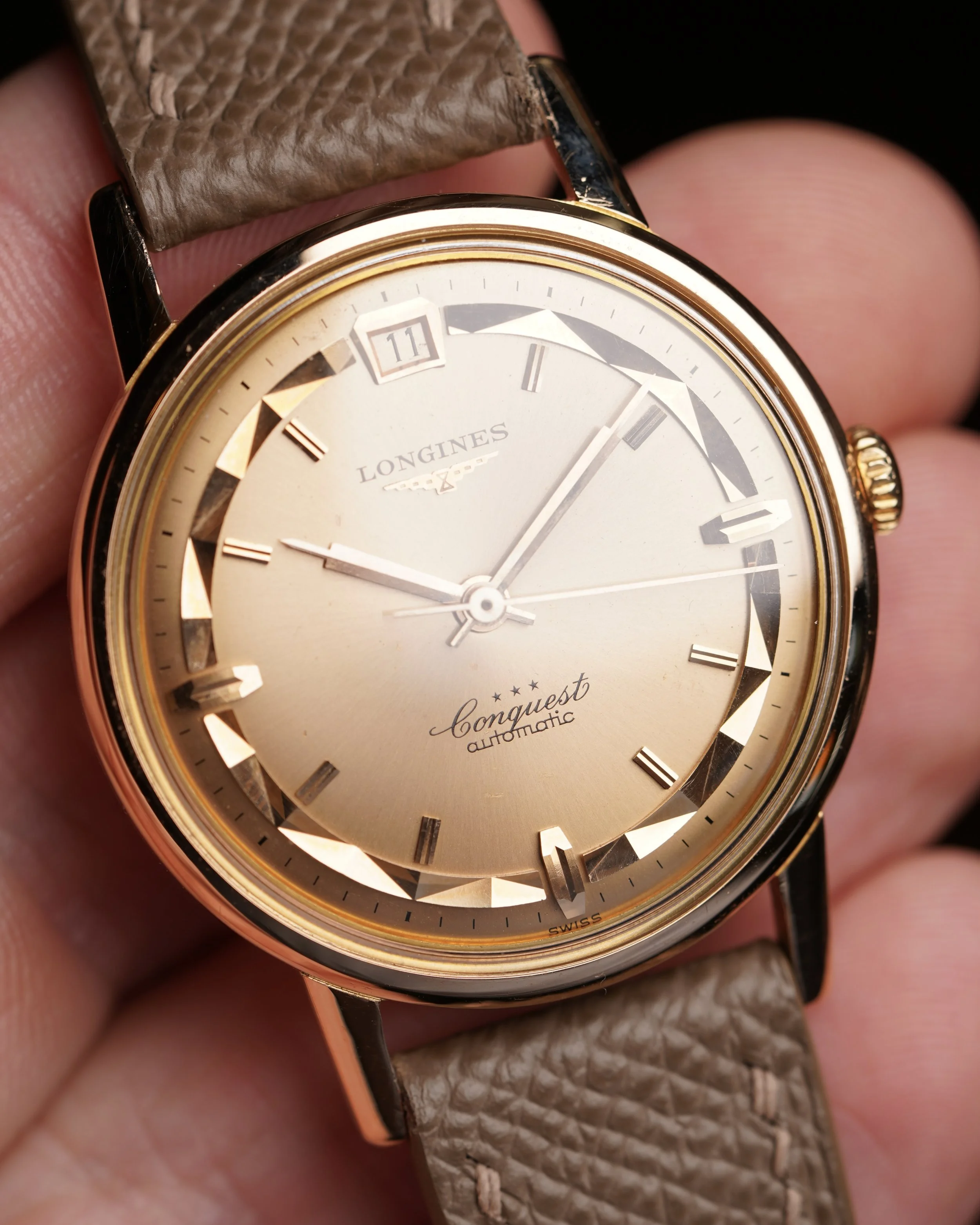 This is an extremely attractive example of the iconic Longines Conquest. This Longines Conquest with DeLuxe dial features an incredible rose dial. The watch dates to the 1960s. It measures 35mm in diameter and is paired on an aftermarket strap and gold plated Longines buckle. The 18k rose gold case has been polished. The crown has been replaced.