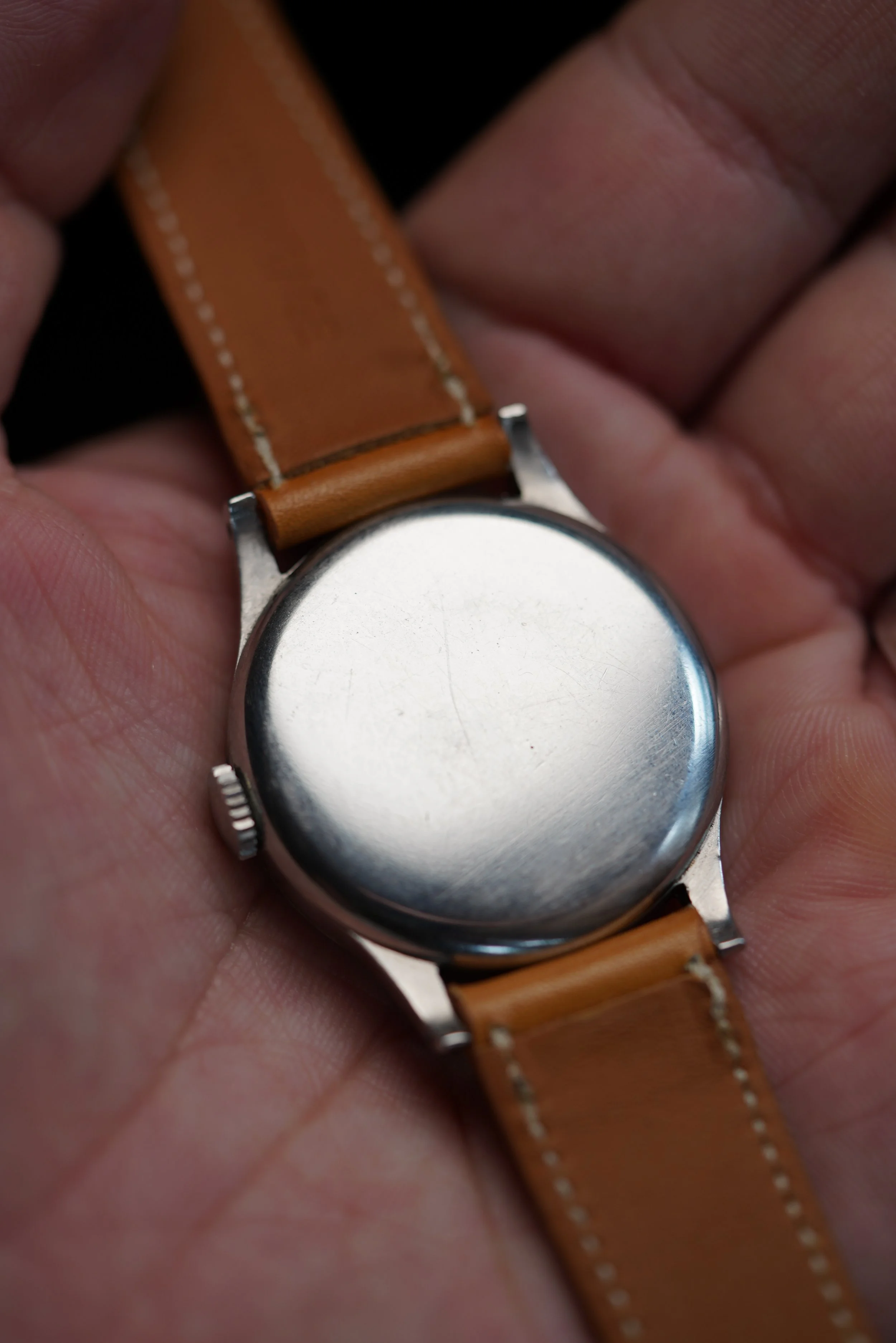 This is a cool time-only Longines with non-luminous silver dial. I features painted Arabic numerals. The case is in stainless steel and measures 35mm in diameter and approximately 42.5mm lug-to-lug. It is powered by a manual wind movement. The case appears to be lightly polished.