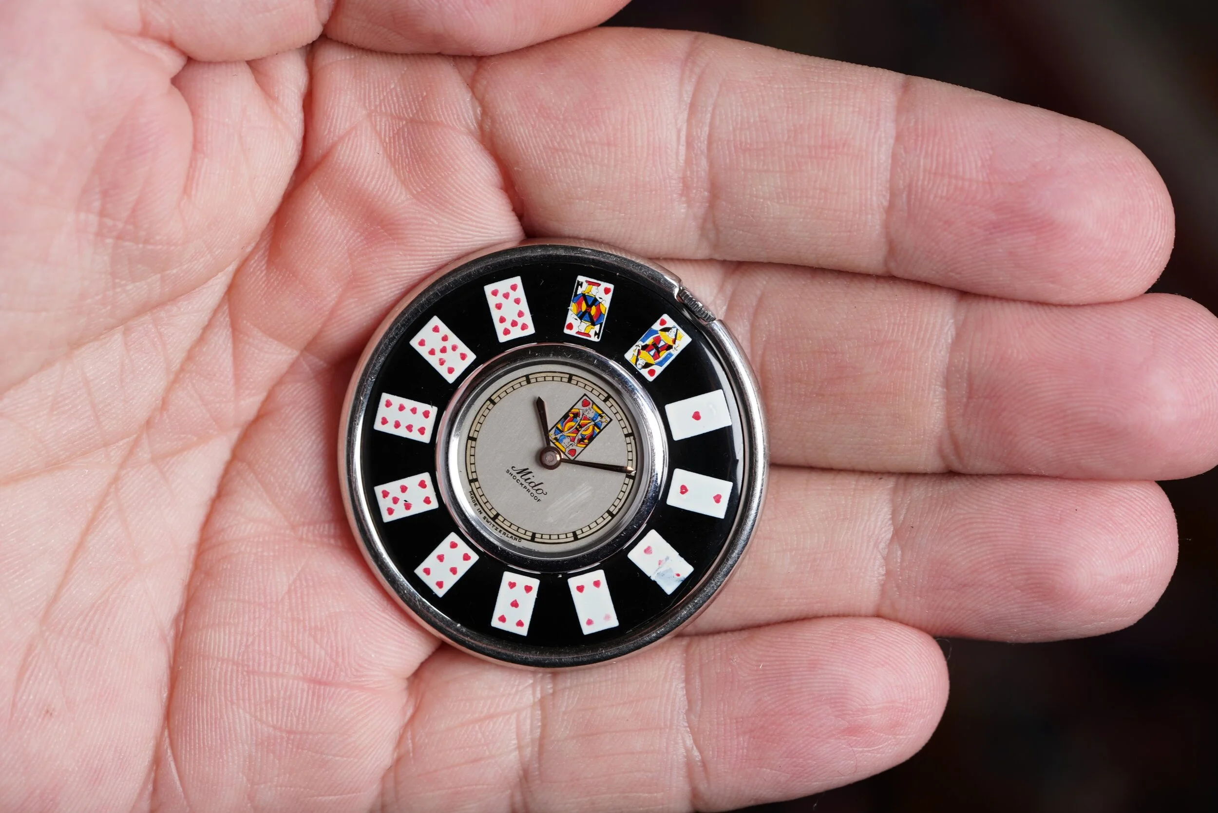 The unusual pocket watch has somewhat of a roulette wheel inspiration that makes one’s mind travel to Las Vegas casino vibes. One can only imagine its previous owner fancied himself as a Sam "Ace" Rothstein type figure. Or perhaps even a ladies man based on the King of Hearts located on the dial. Maybe even a decorated card shark in their local community of the 1950s. Whomever the watch is destined for in the present, they’re likely a passionate collector with a love for whimsical horological instruments.