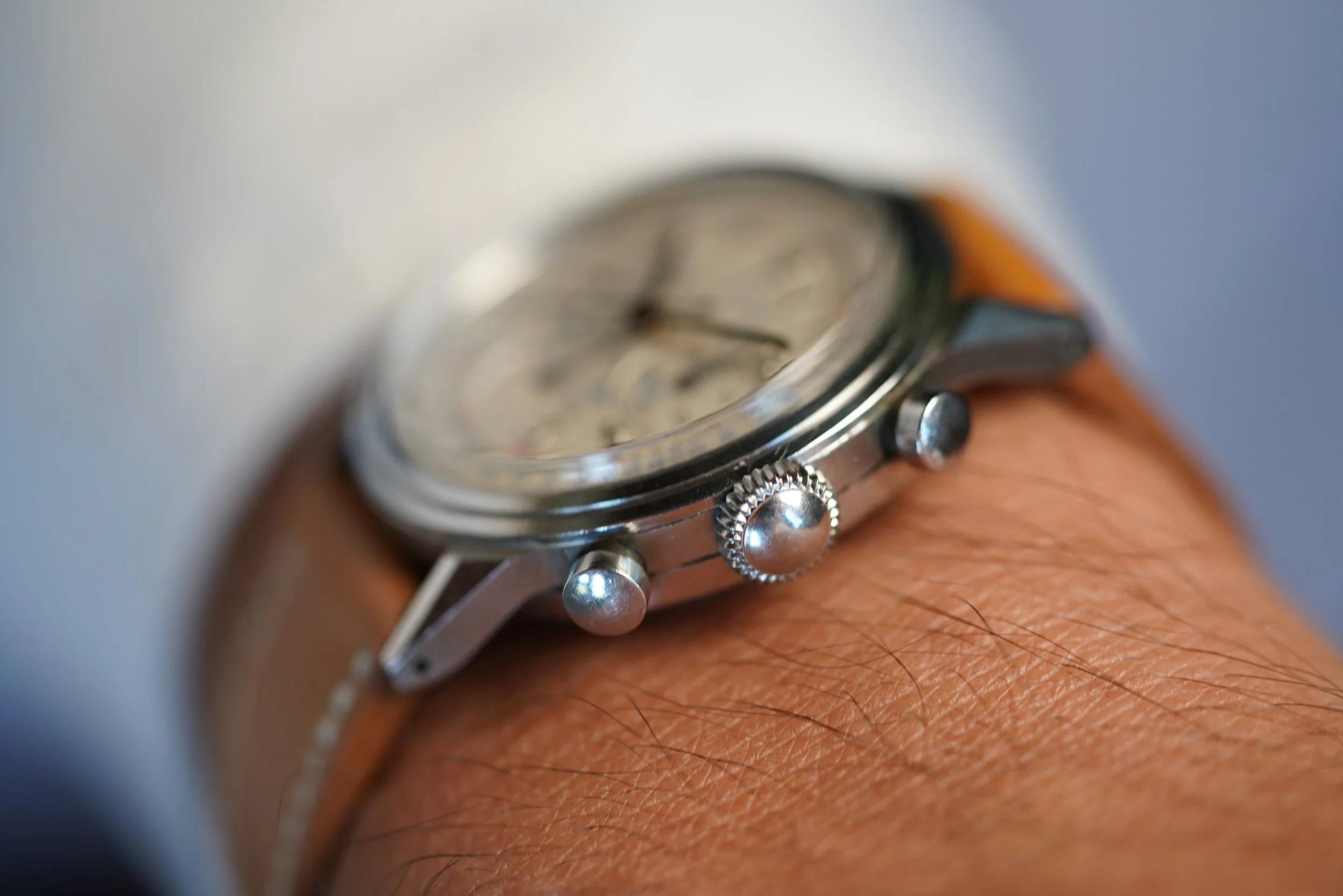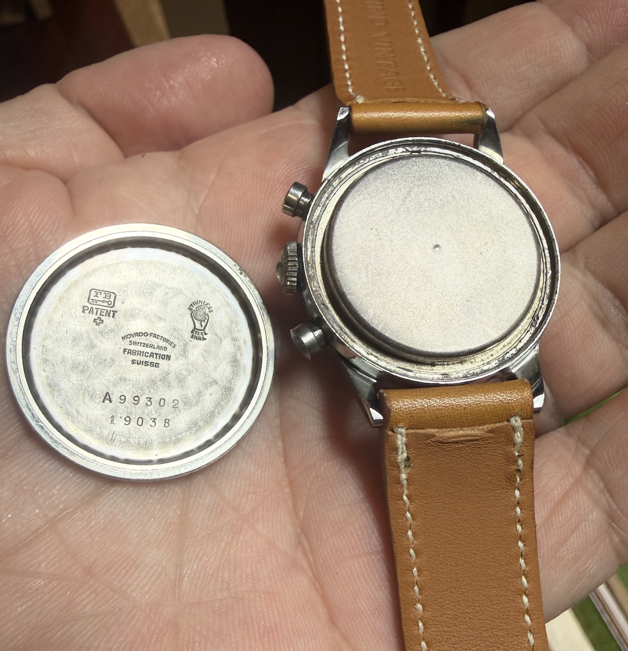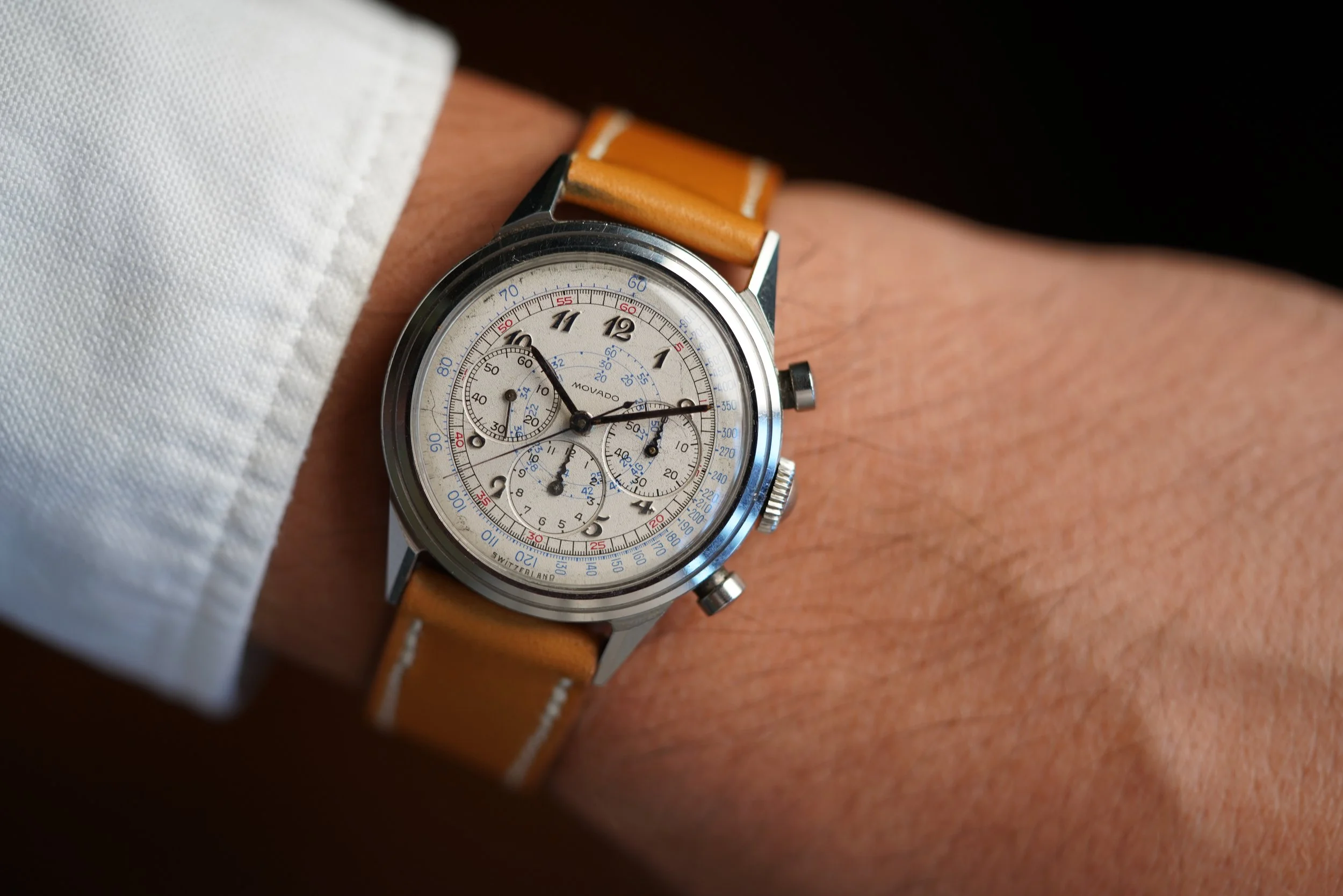 This Movado chronograph features a stunning dial with Breguet numerals. The case measures approximately 35mm in diameter and 43mm lug to lug. The case appears to be unpolished. It features very attractive and uncommon applied-Breguet numerals. It is powered by the legendary calibre M95!