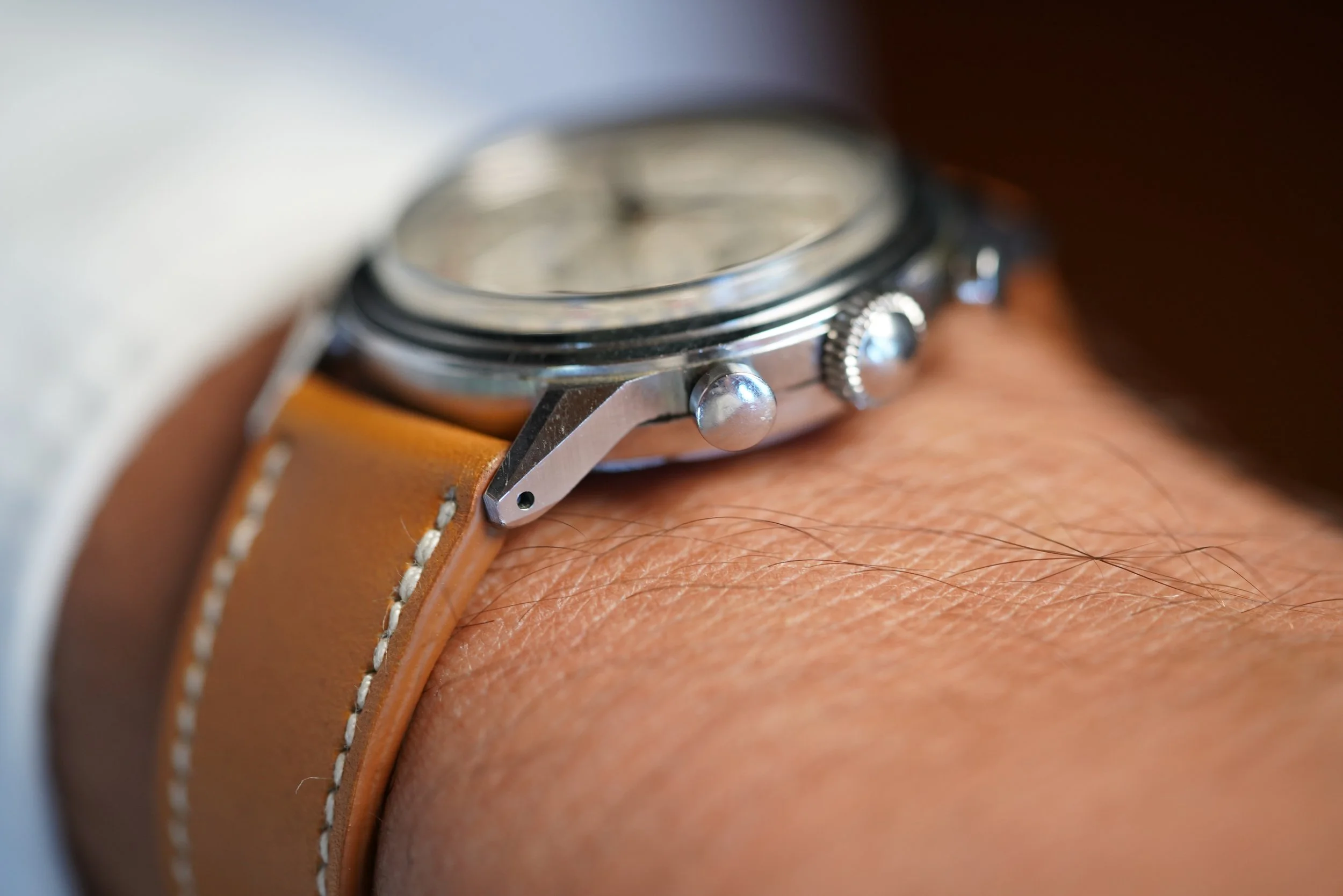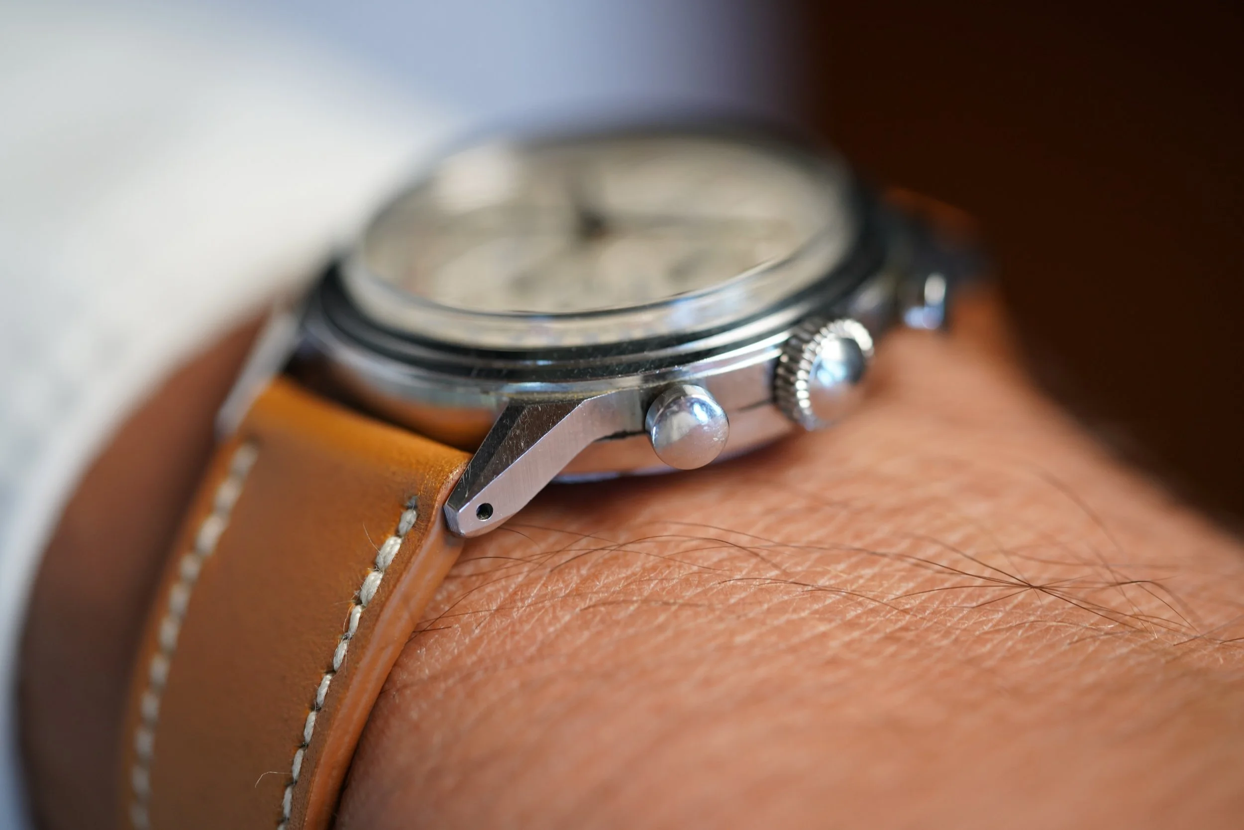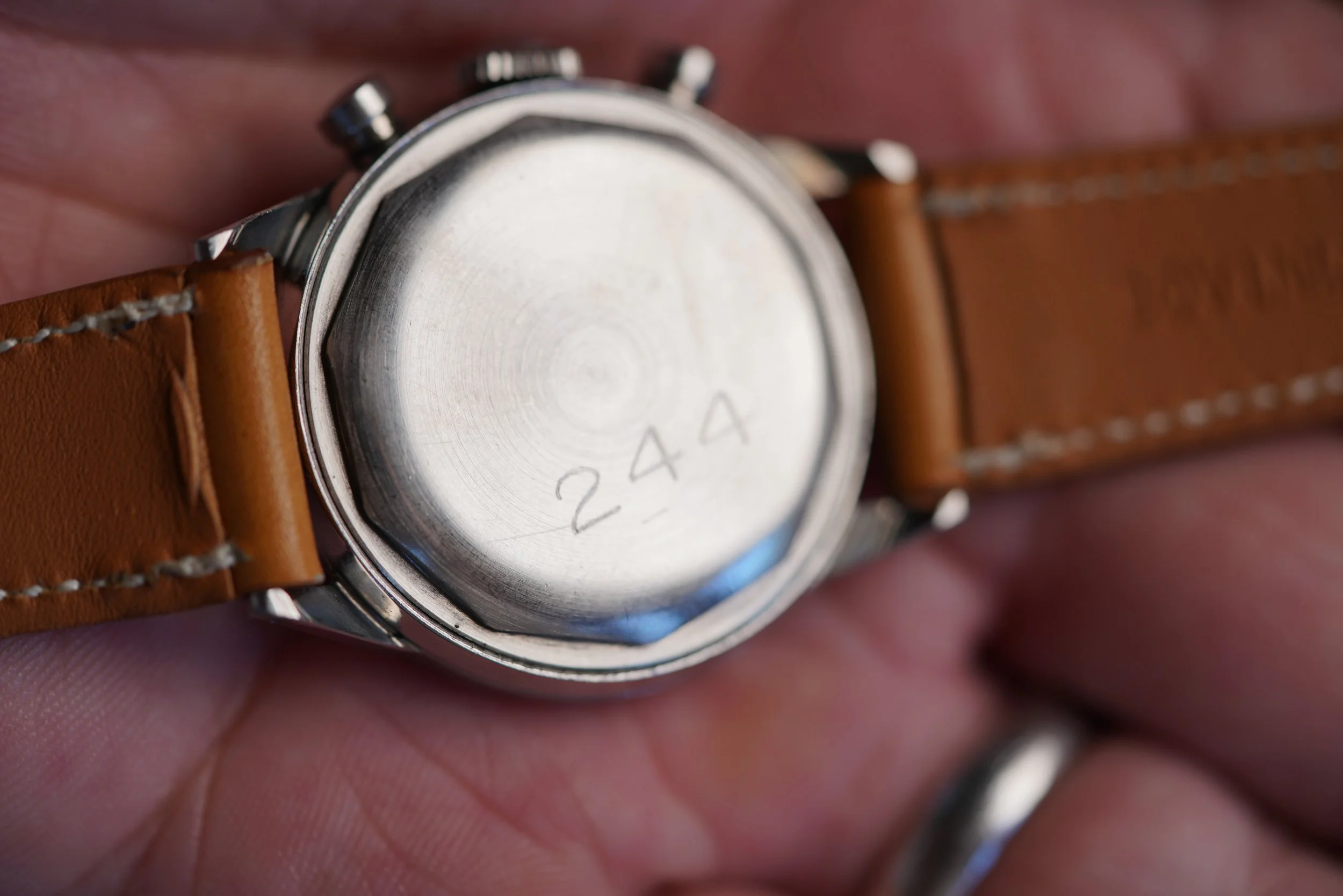 This Movado chronograph features a stunning dial with Breguet numerals. The case measures approximately 35mm in diameter and 43mm lug to lug. The case appears to be unpolished. It features very attractive and uncommon applied-Breguet numerals. It is powered by the legendary calibre M95!