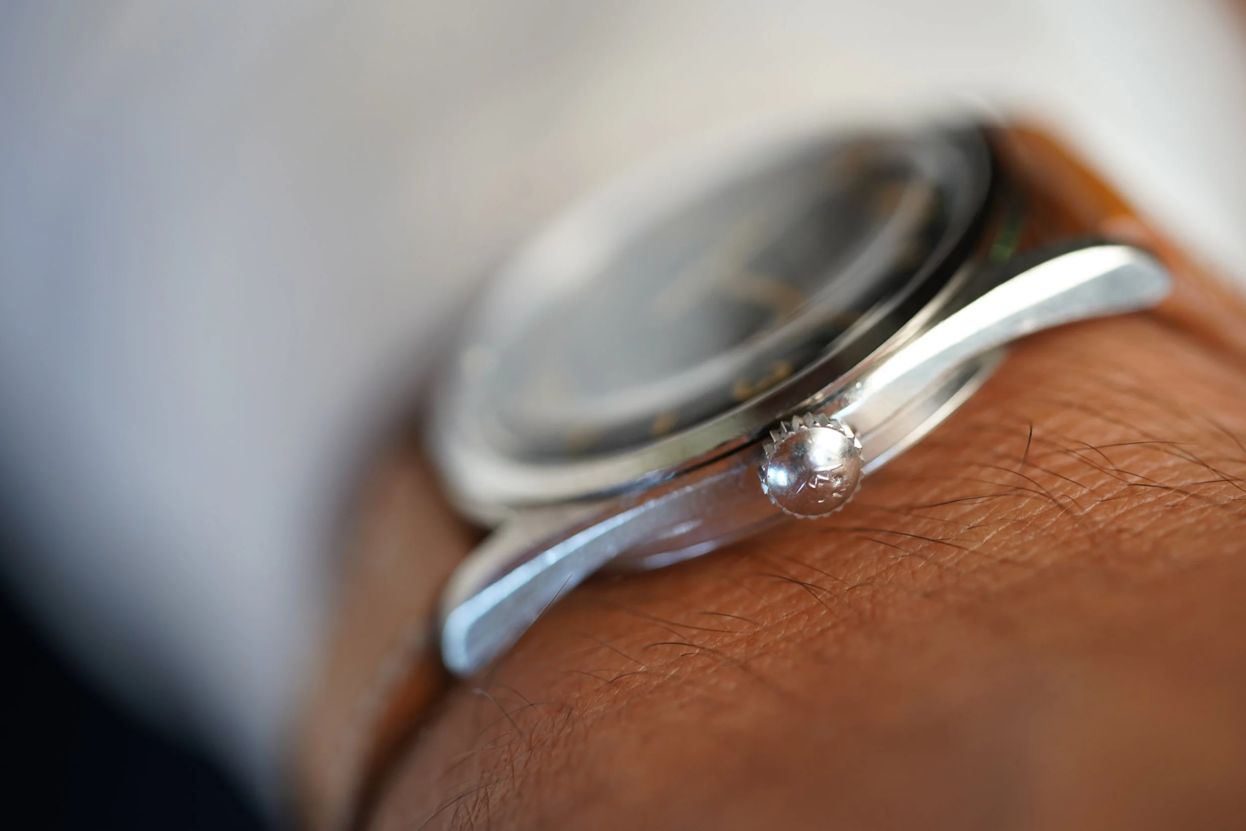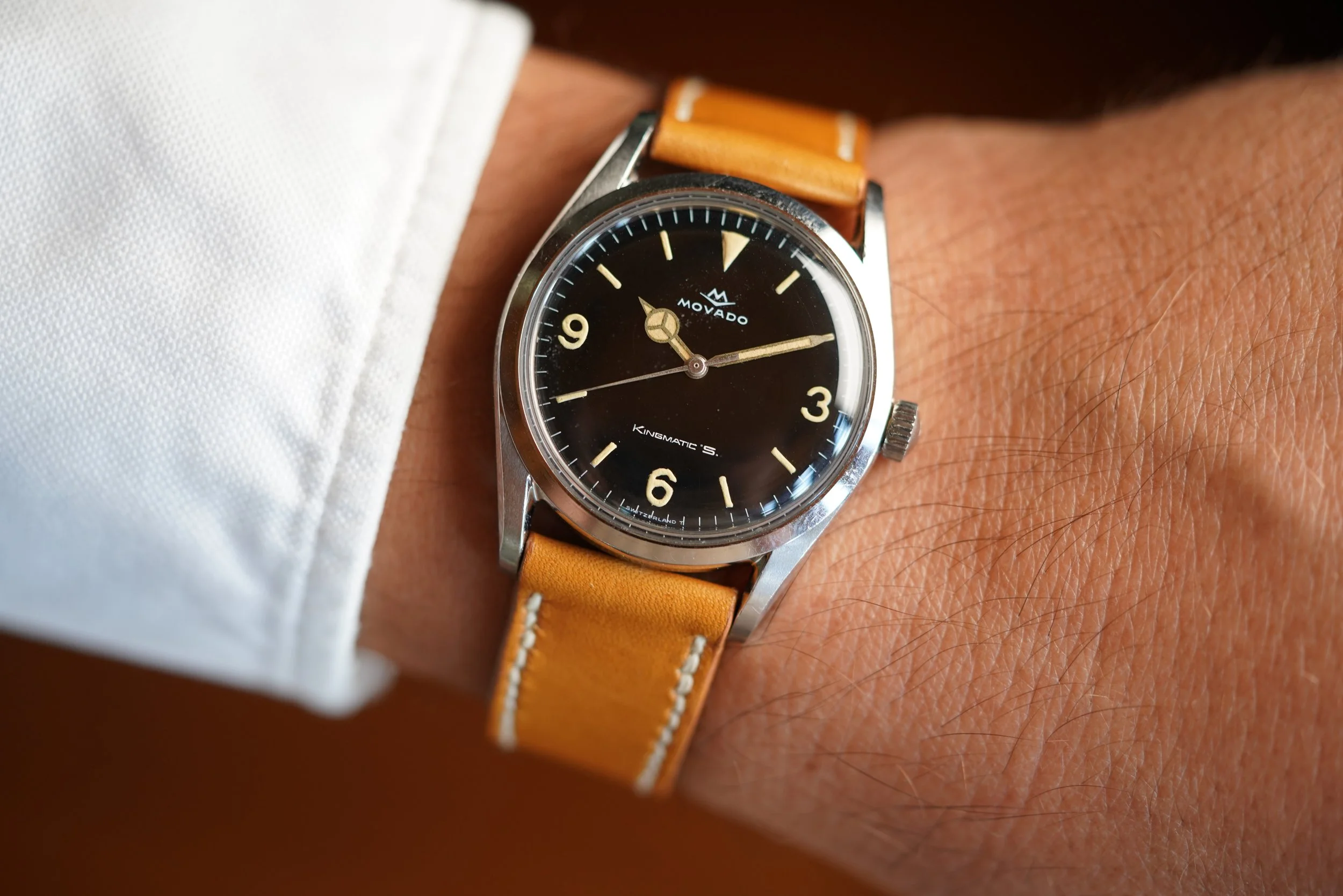 This Movado Kingmatic is an awesome watch. The case measures approximately 35mm in diameter (42mm lug-to-lug). The case appears to be unpolished. It features a beautiful and uncommon glossy Explorer dial similar to the Rolex Explorer 1016. The dates to the 1960s.