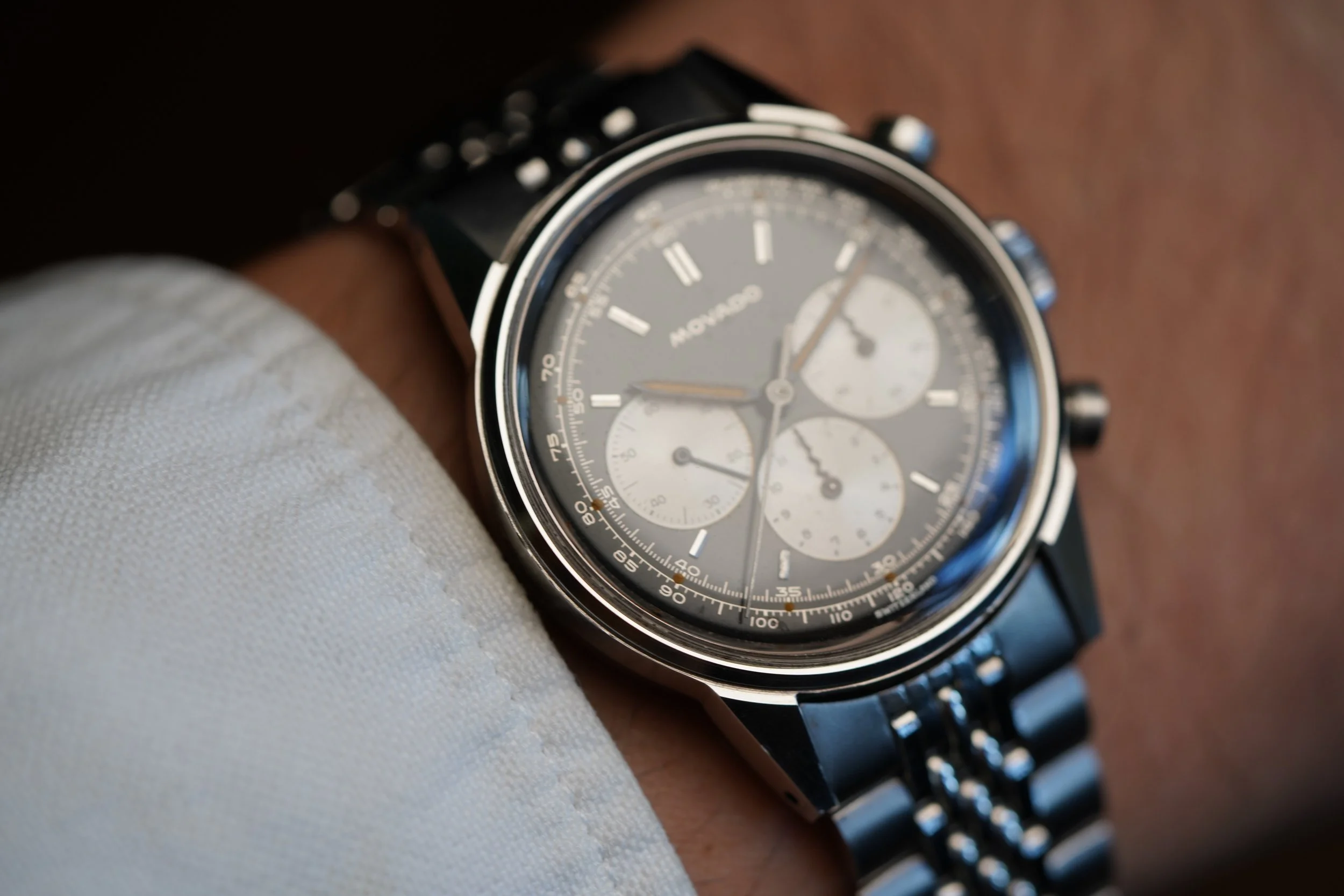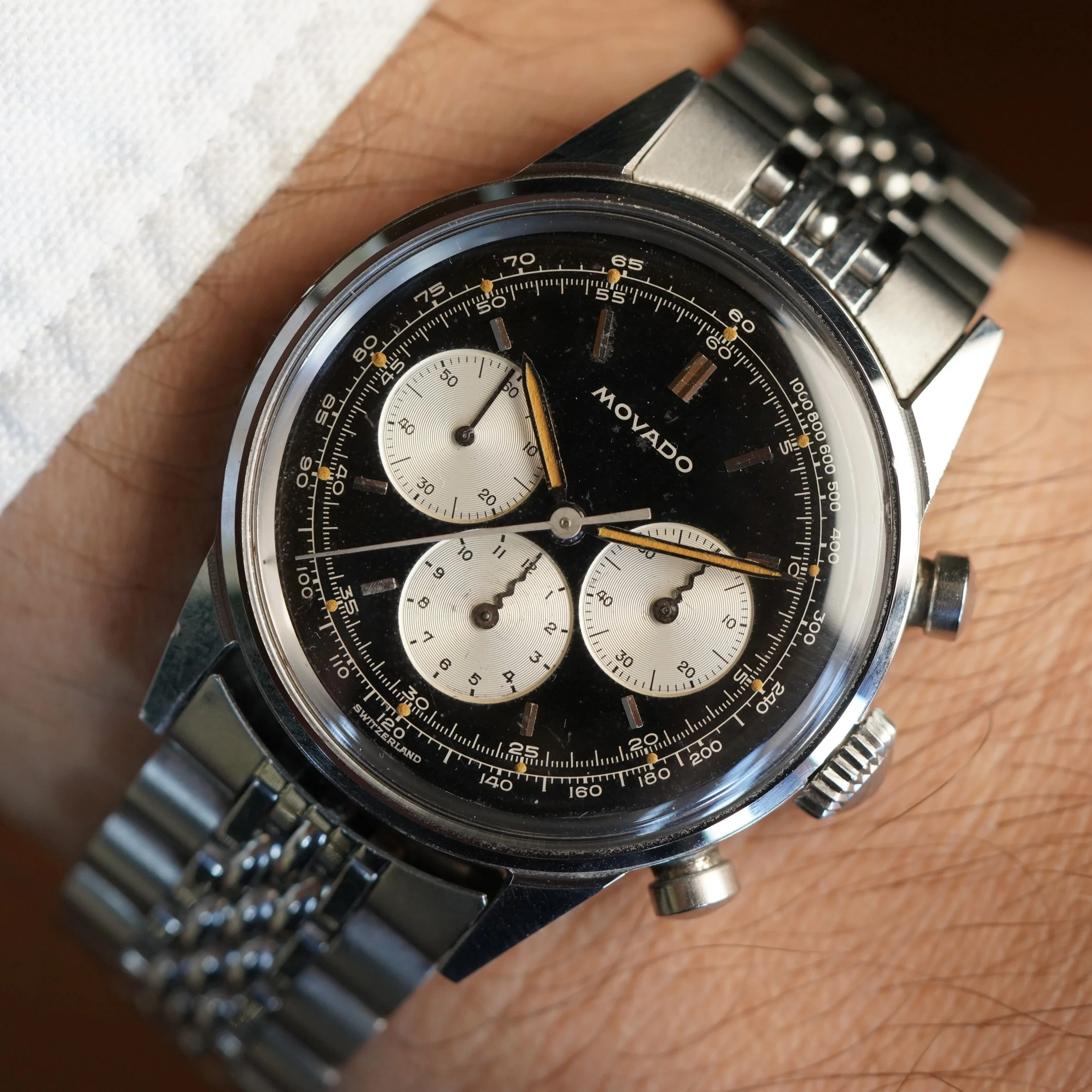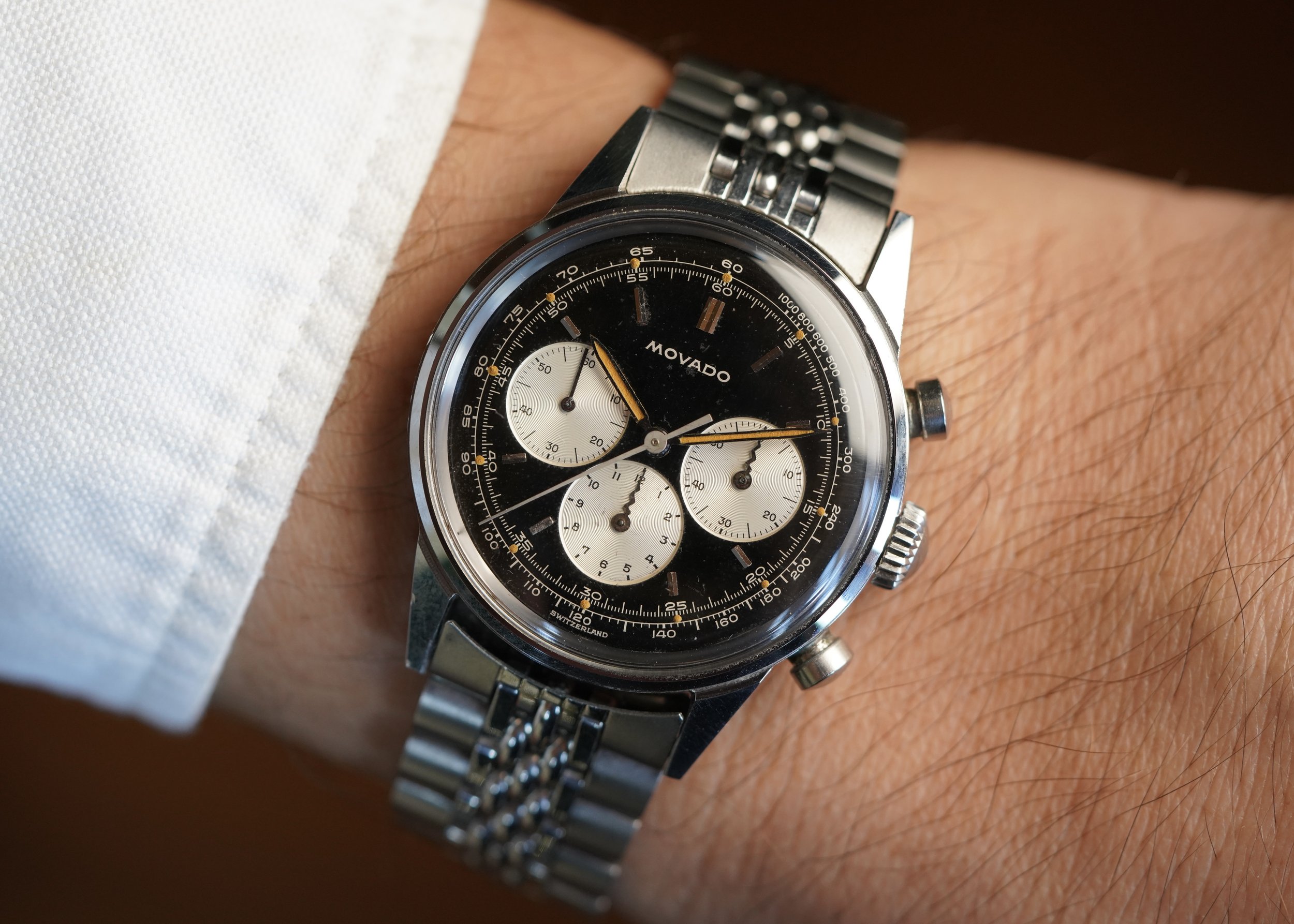 The Movado M95 chronographs are incredible timepieces not only for their movements, but also the cases and dials. This is very attractive and nice example. It is paired on a period correct Movado bracelet. The case appears to be unpolished and measures 35mm in diameter. The case was produced by Taubert Frères (formerly François Borgel). The dial and hands have been relumed.