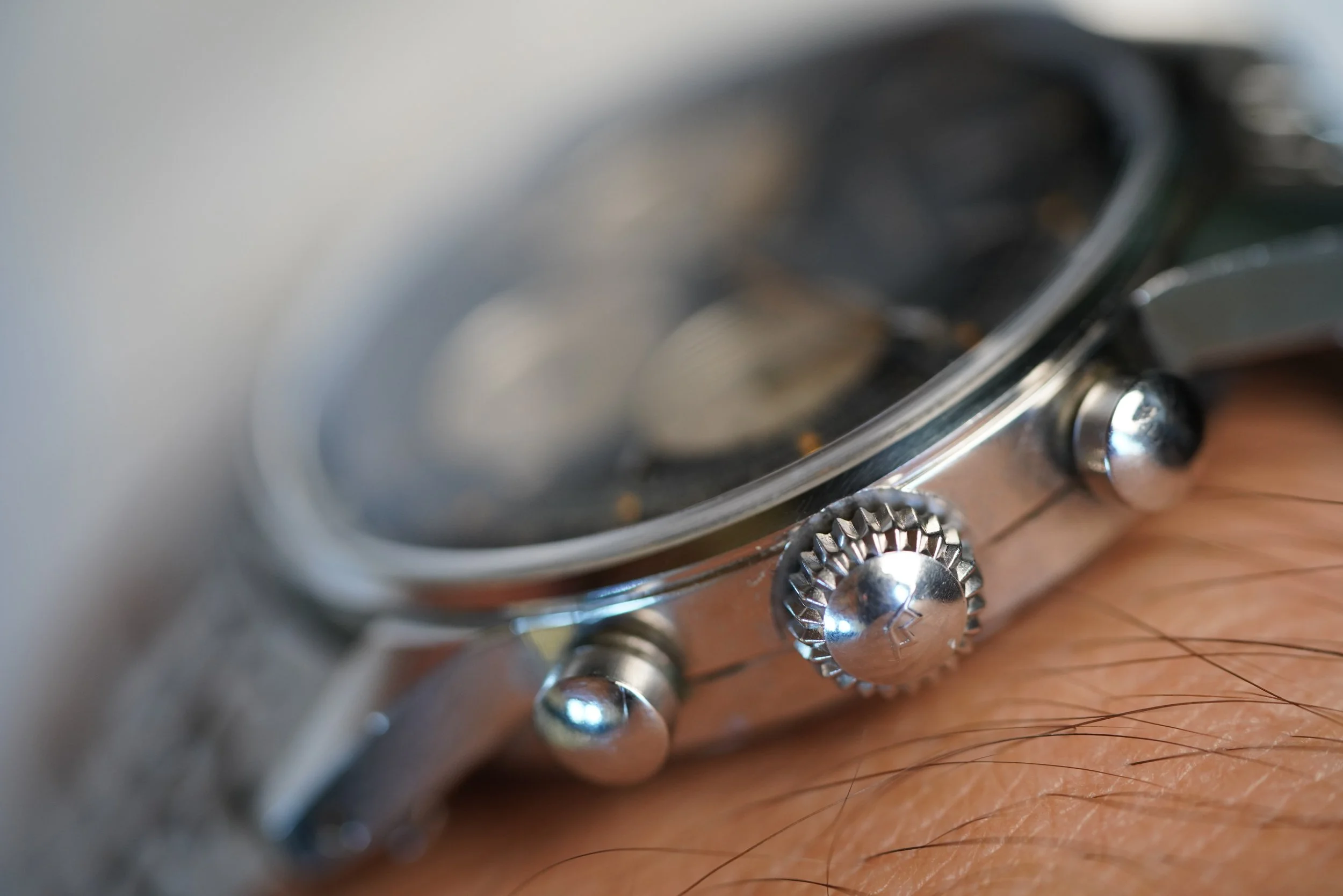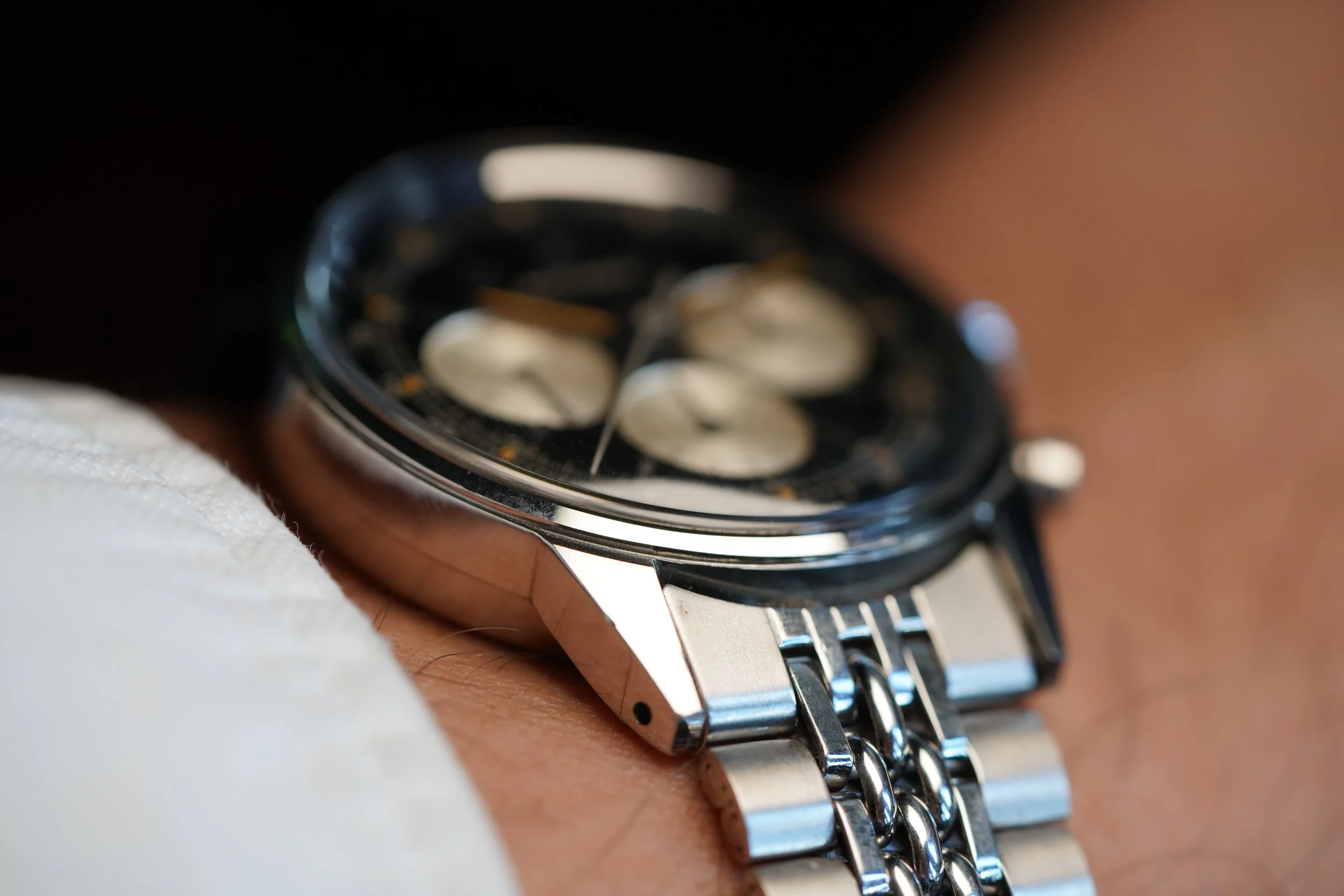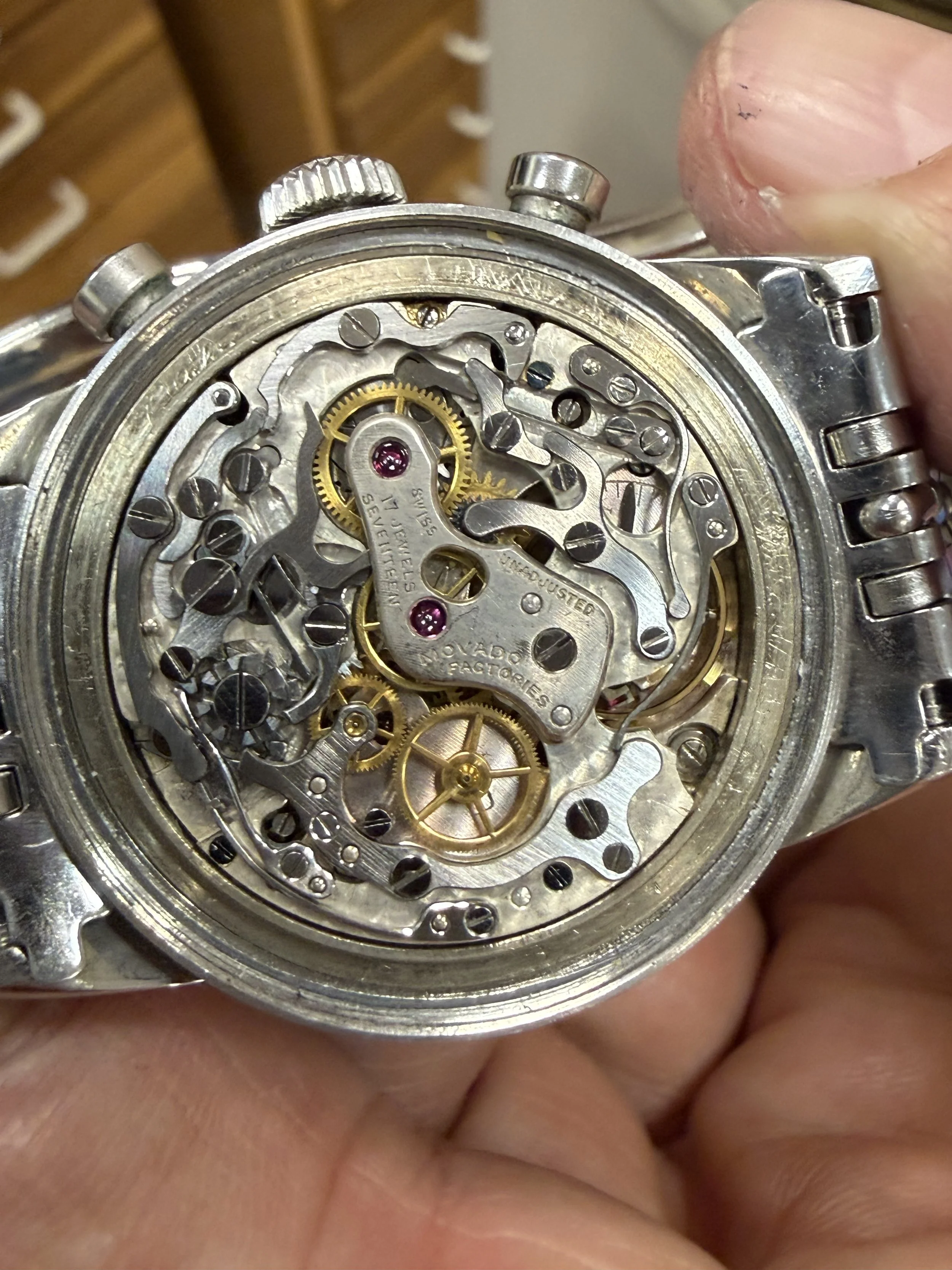 The Movado M95 chronographs are incredible timepieces not only for their movements, but also the cases and dials. This is very attractive and nice example. It is paired on a period correct Movado bracelet. The case appears to be unpolished and measures 35mm in diameter. The case was produced by Taubert Frères (formerly François Borgel). The dial and hands have been relumed.