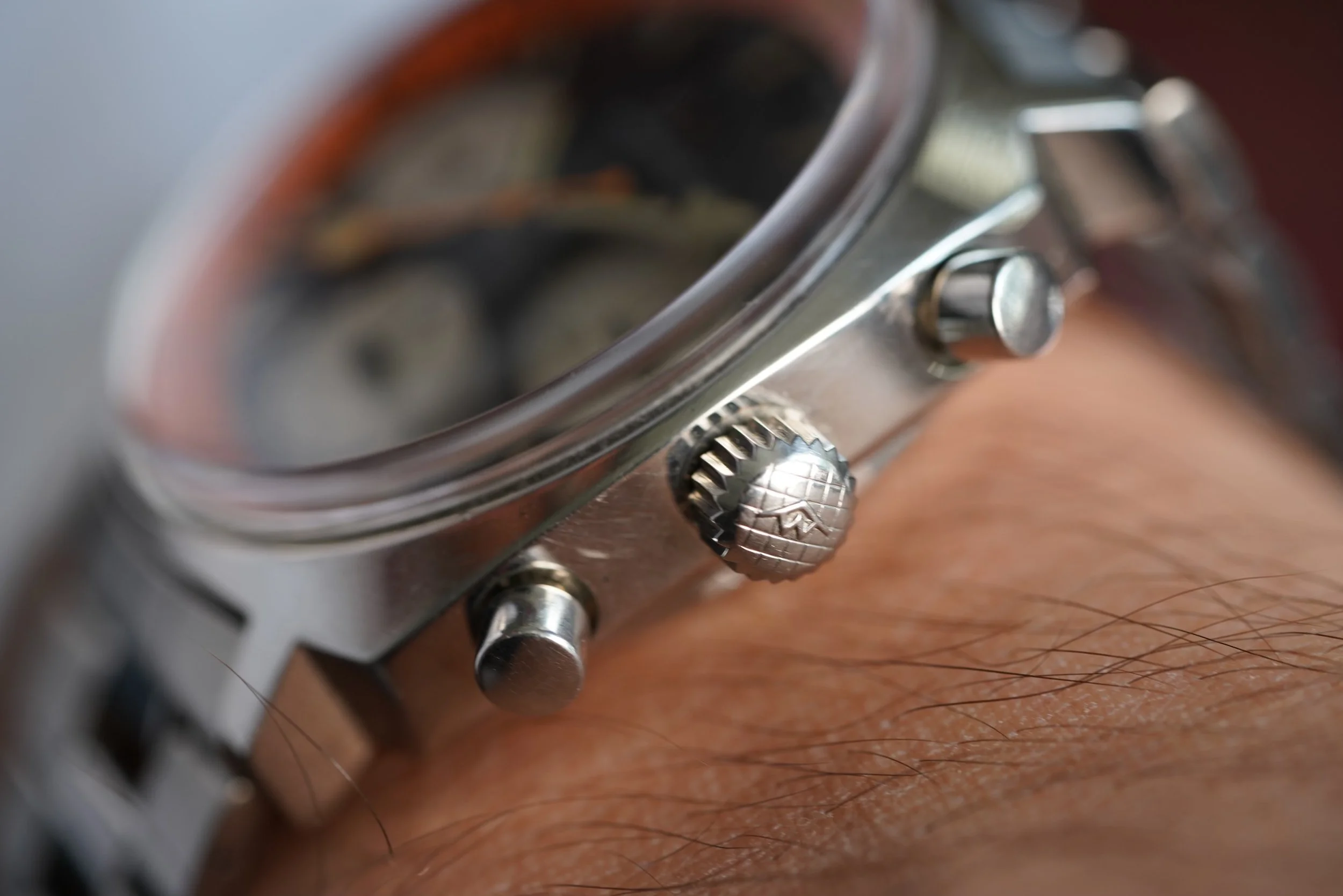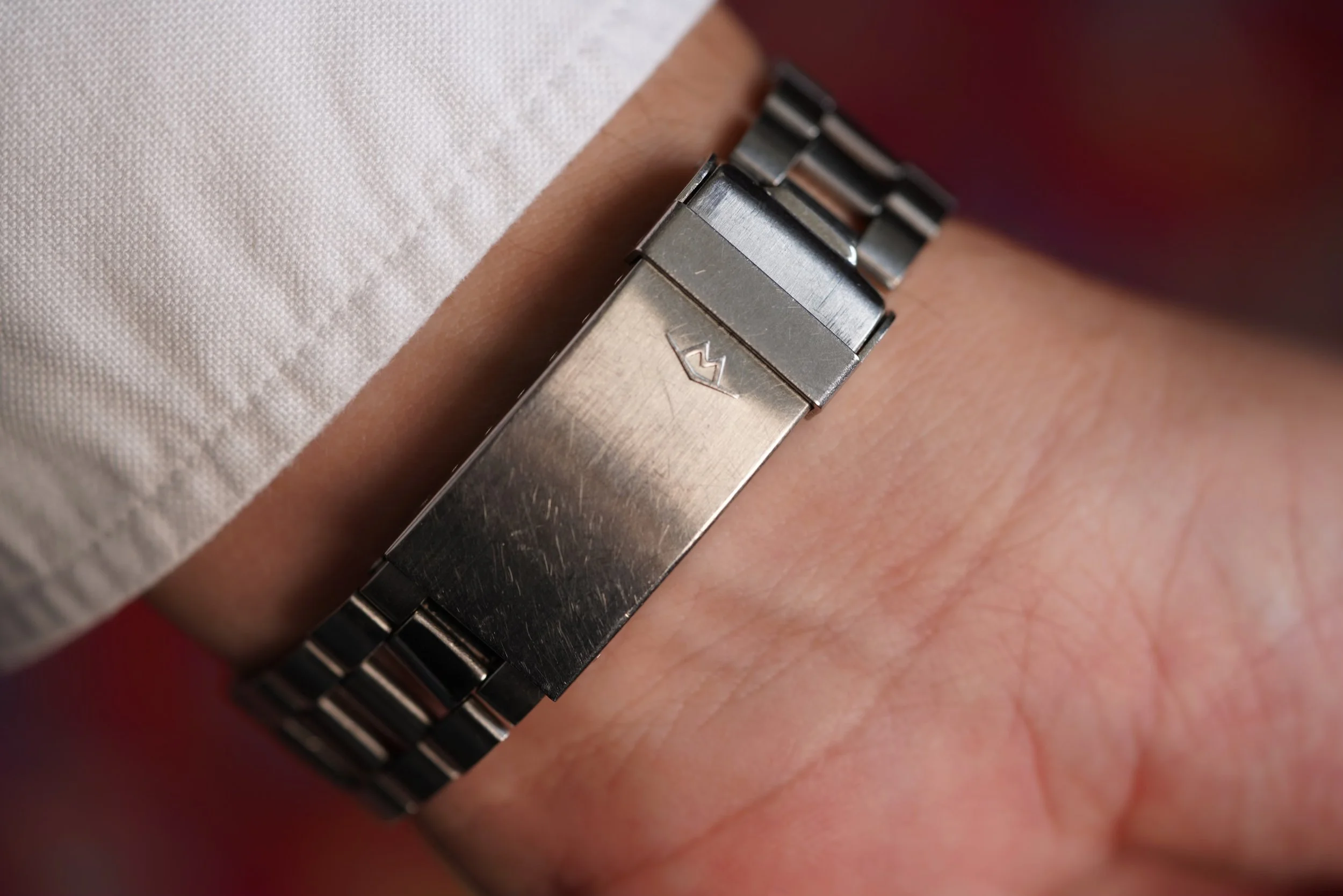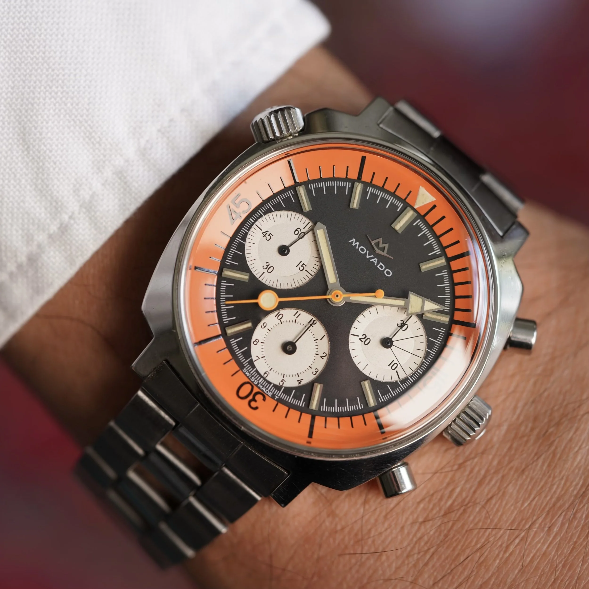 In the late 1960s and early 1970s, Movado and Zenith teamed up often in designs of sports watches, particularly dive watches and chronographs. This Movado Super Sub Sea Chronograph epitomizes that collaboration. The reference 206-705-502 began production in 1969 and is one of the first watches from the two brands. The watch contains a variety of attractive design choices, most notably the cushion case, orange inner dive bezel, elongated central minute hand with the large arrow at the tip, and orange lollipop central seconds hand. The watch comes with its original Movado by Gay Frères ladder bracelet.