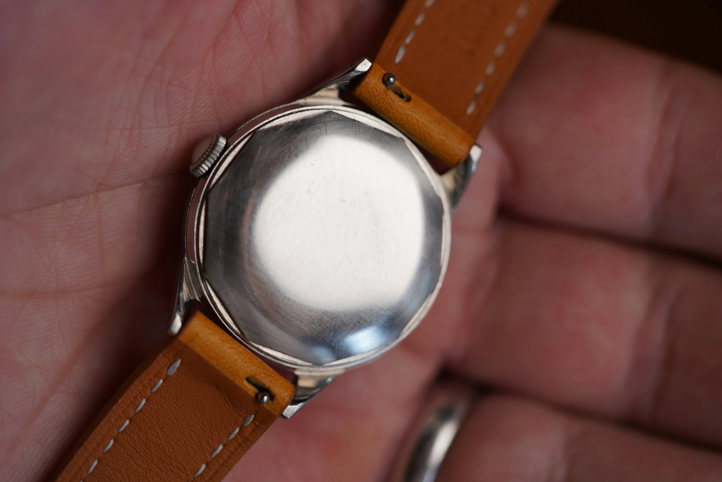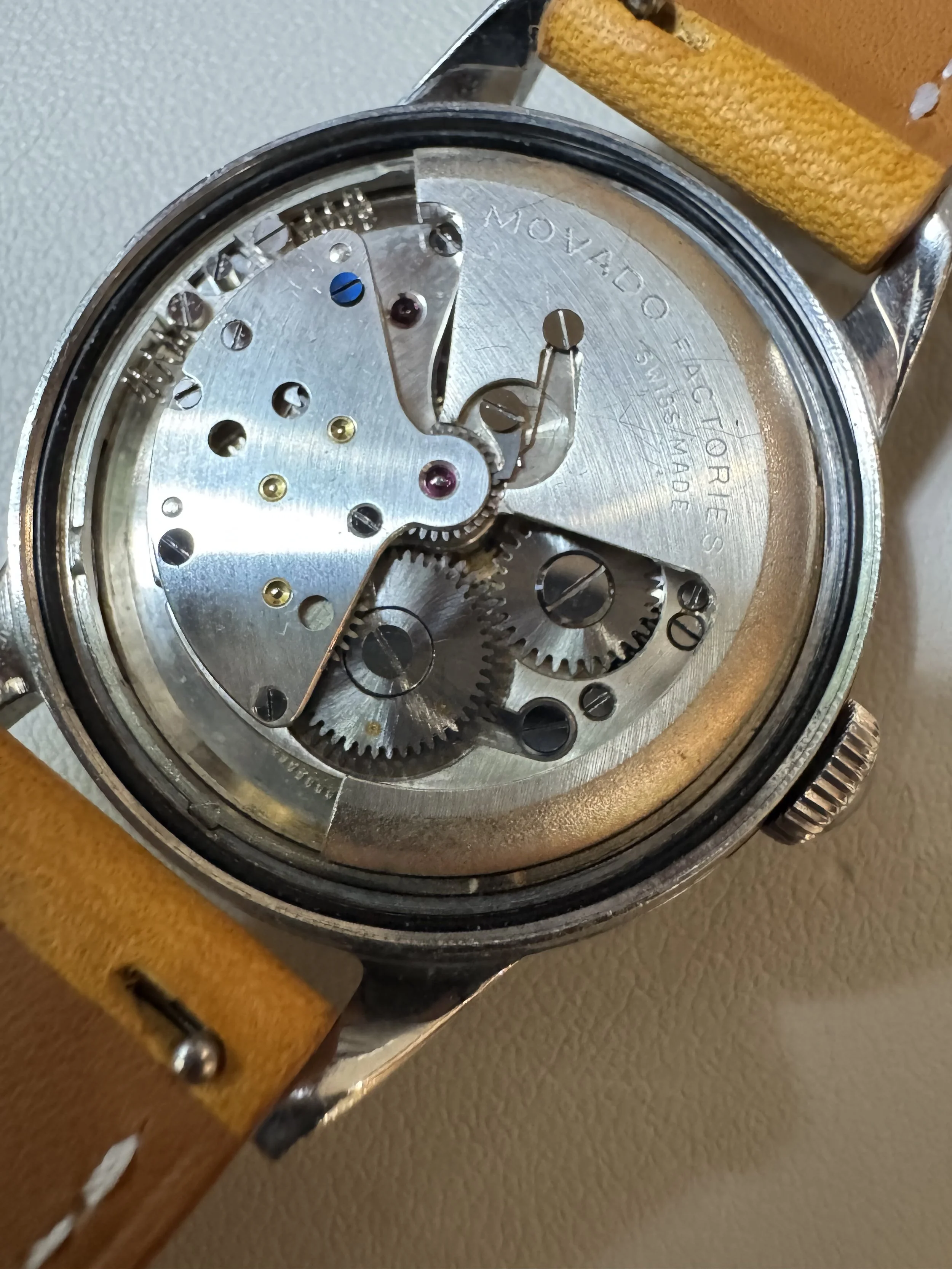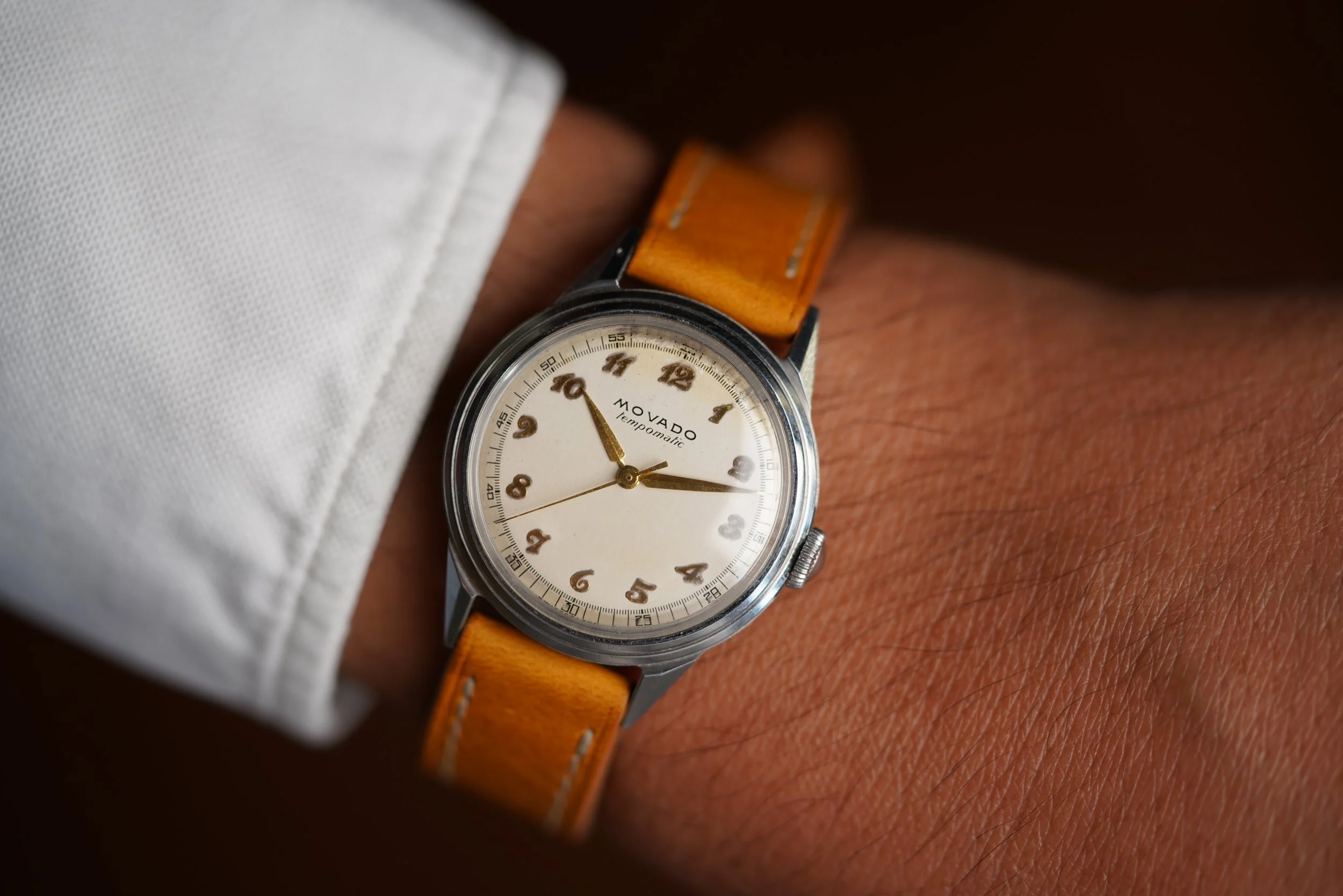 This Movado Tempomatic is a great watch. The case measures approximately 33mm in diameter (41mm lug-to-lug). The stainless steel case appears to be unpolished. The dial features gold Breguet-style numerals and gold alpha hands. It features an FB (Taubert Freres) case. There is possibly a Portuguese import hallmark on the top left lug.