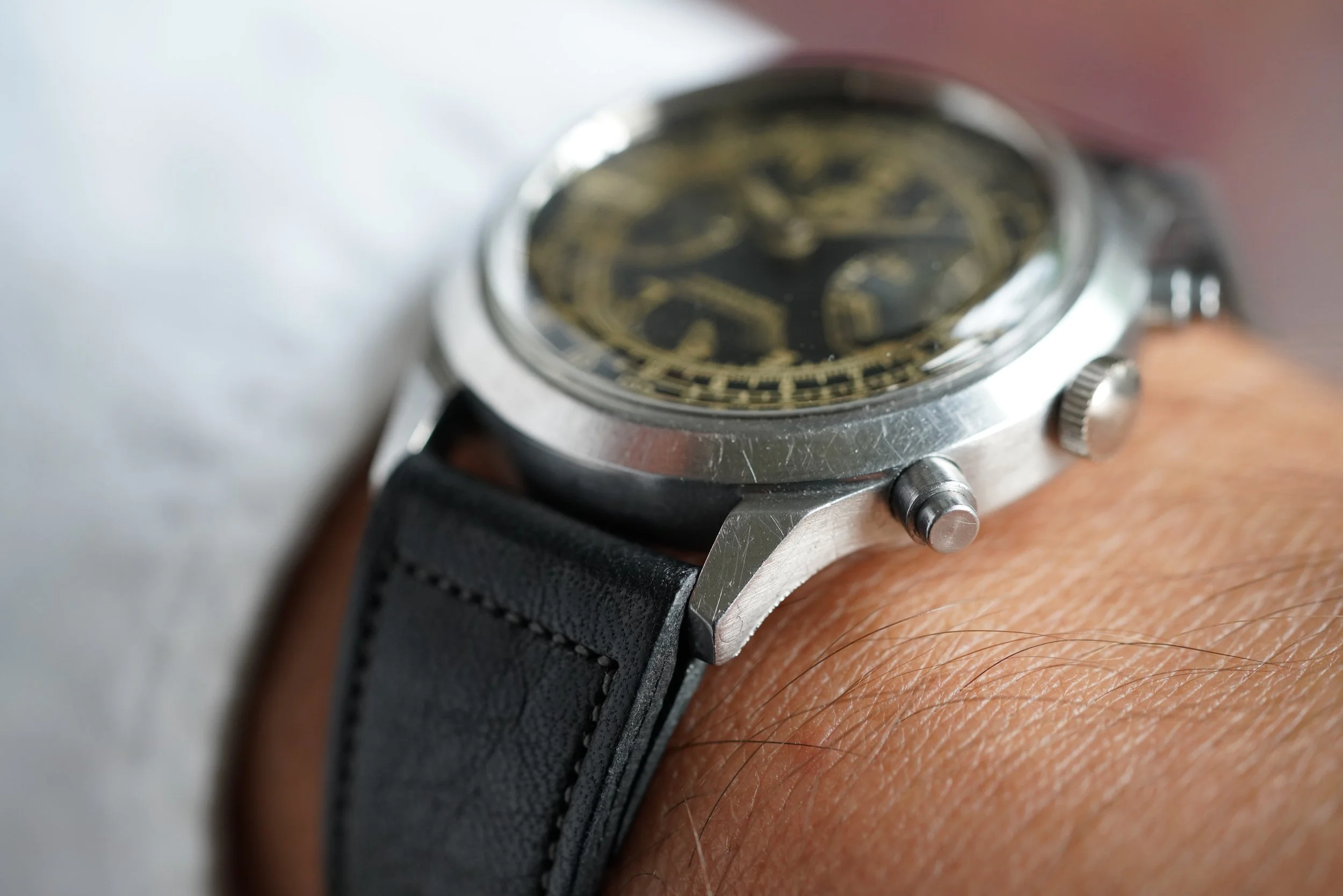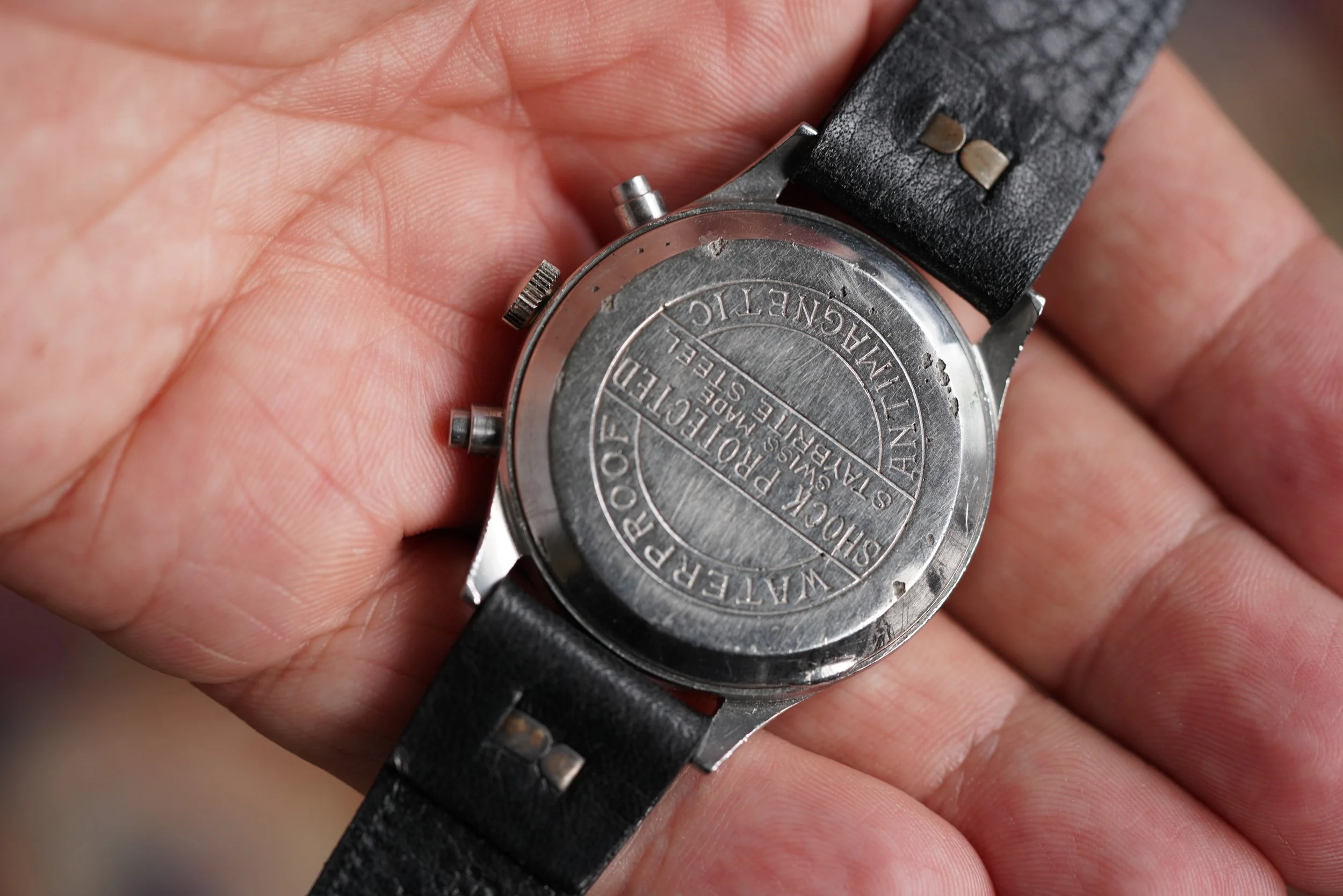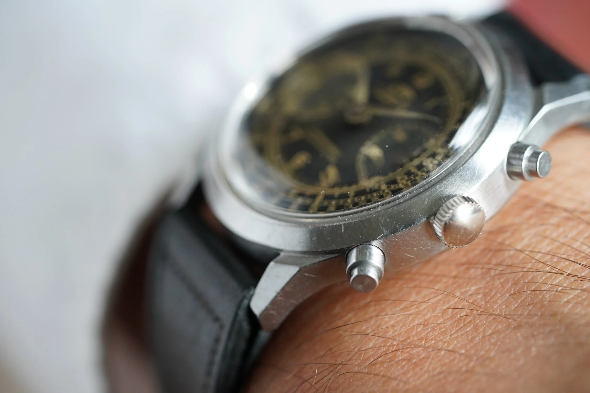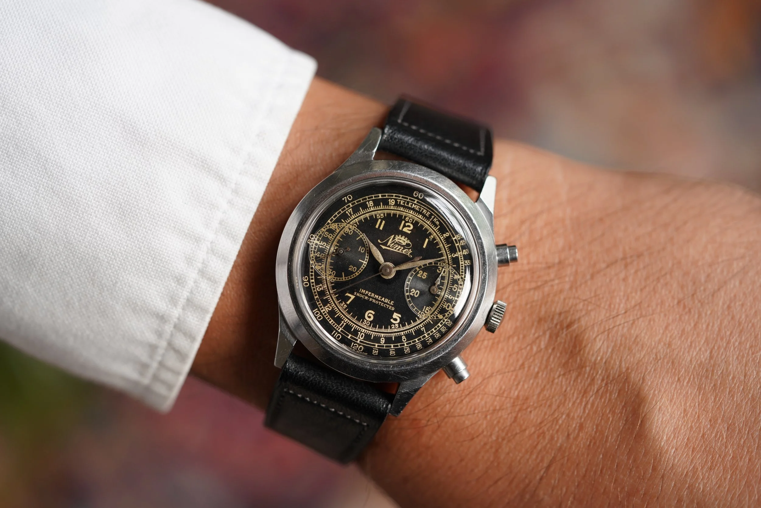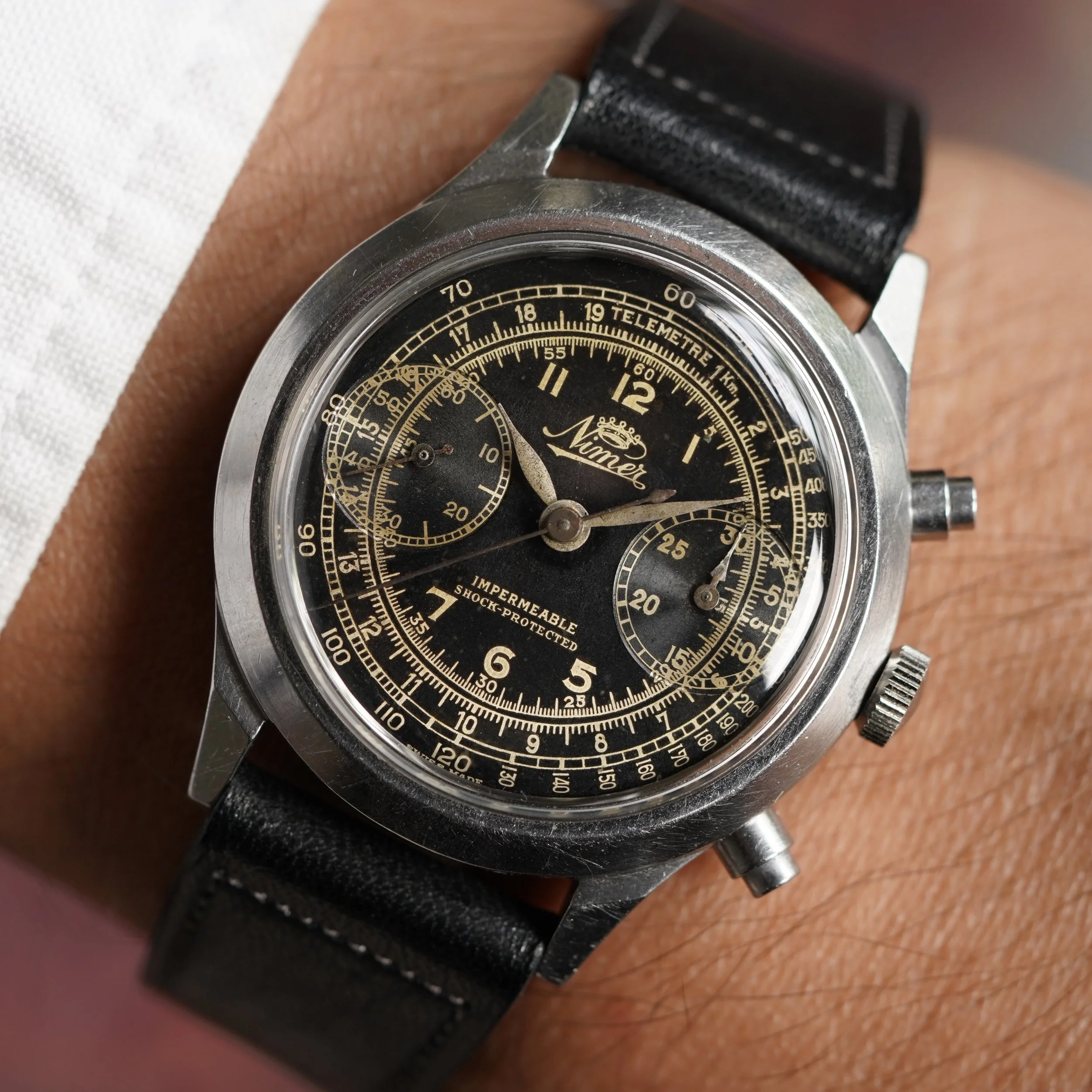 This Nimer chronograph is a very cool watch with a non-luminous gilt dial. The watch features a case very similar (if not also made by) Spillman chronograph models made for UG. We believe the case is unpolished. It features fixed springbars.