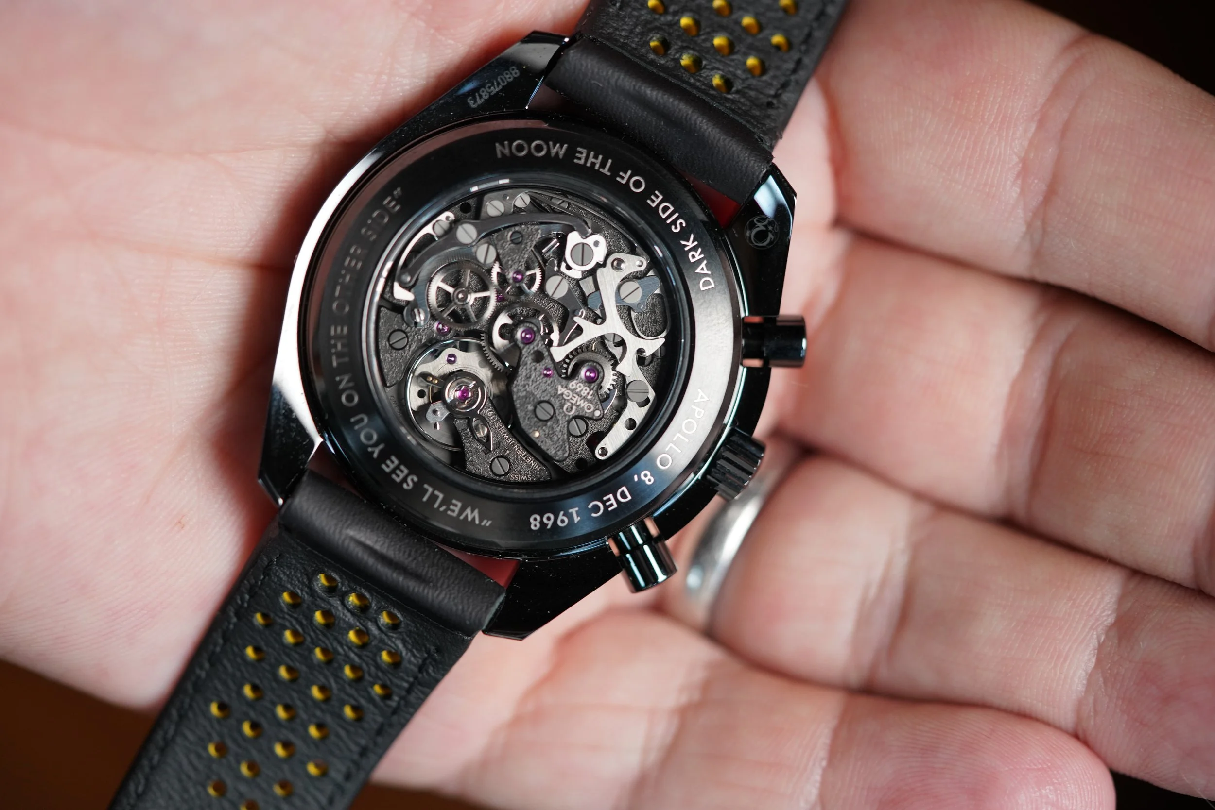 This is a modern “Dark Side of the Moon” Speedmaster reference 311.92.44.30.01.001 which pays homage to NASA’s Apollo 8 mission of 1968.
