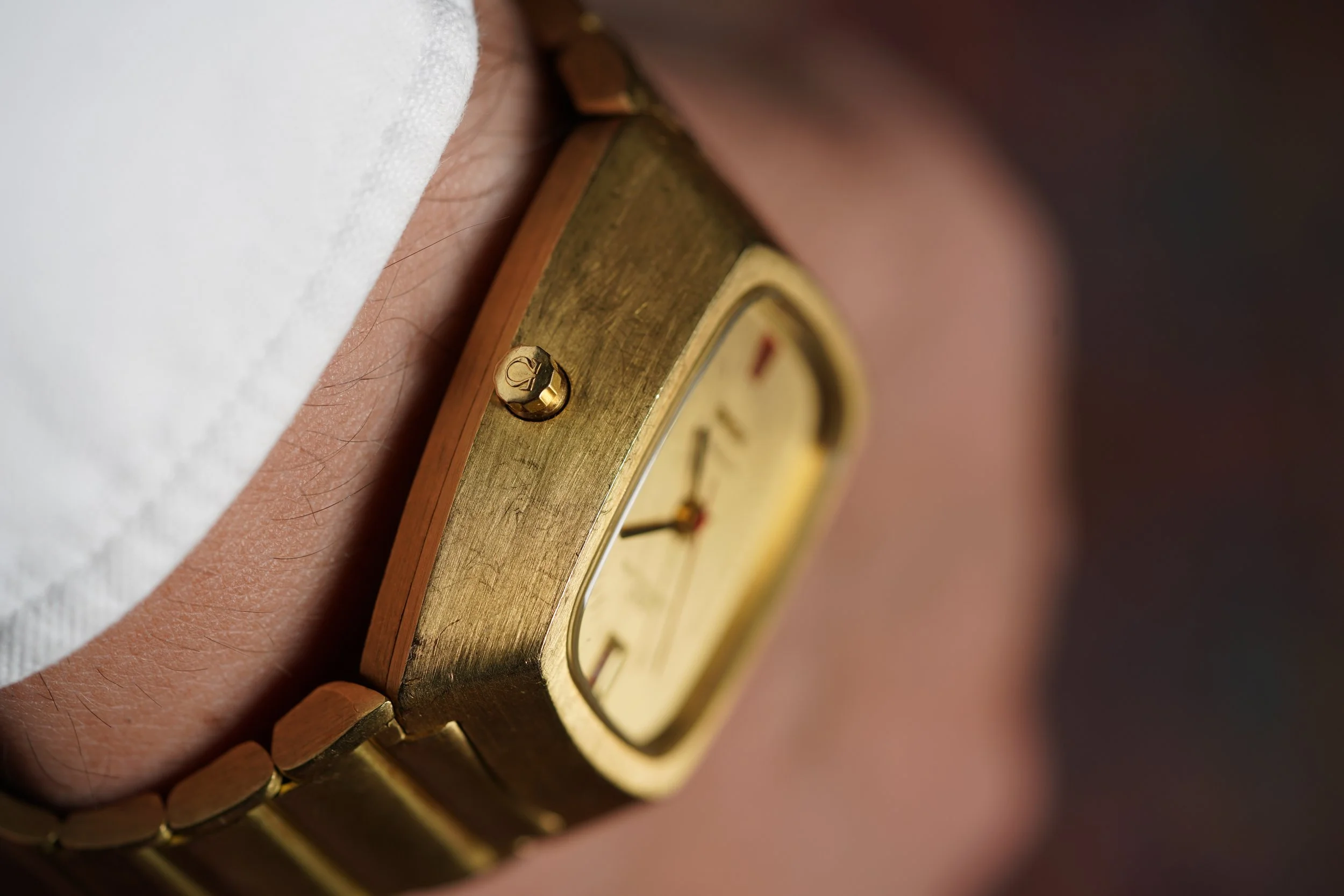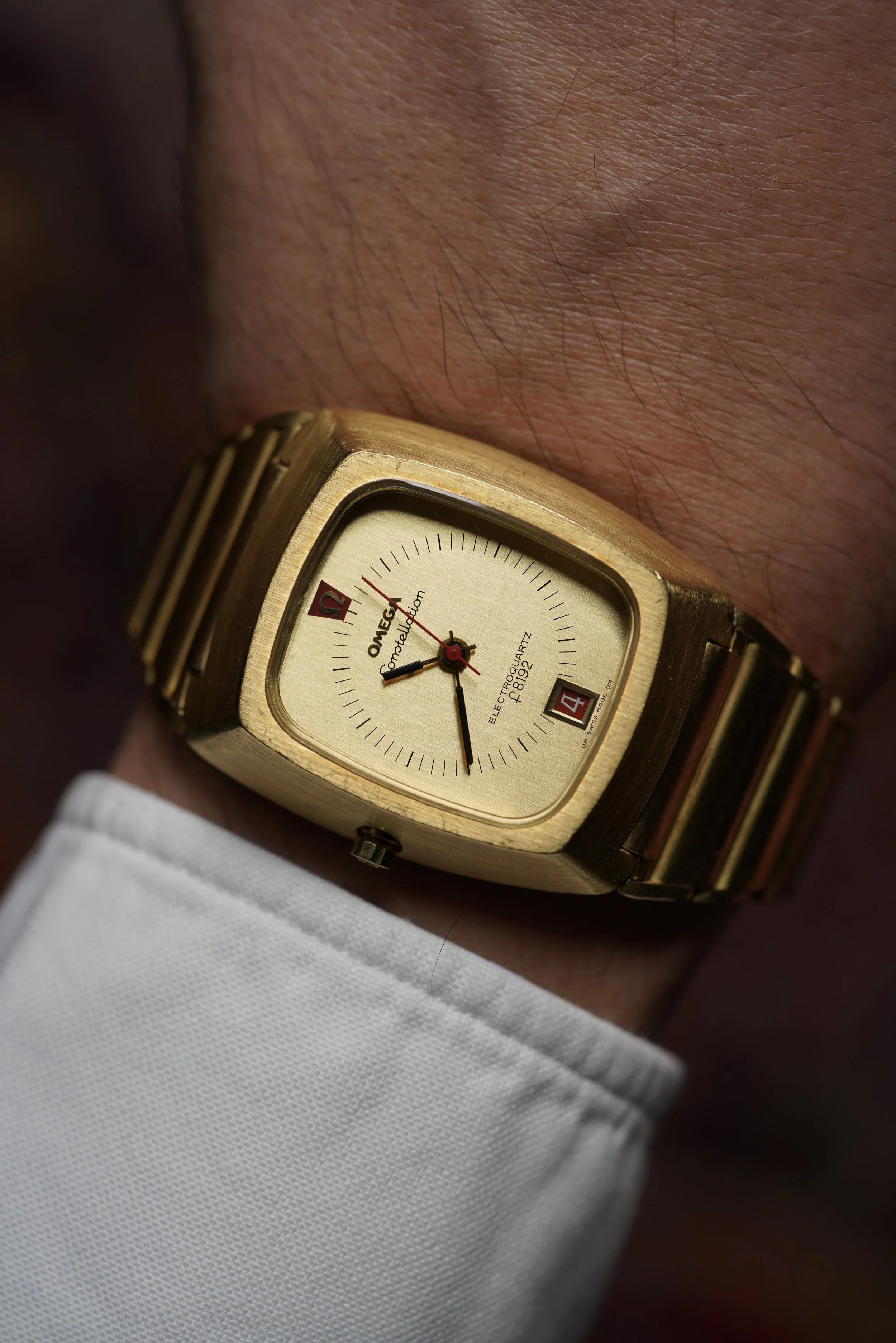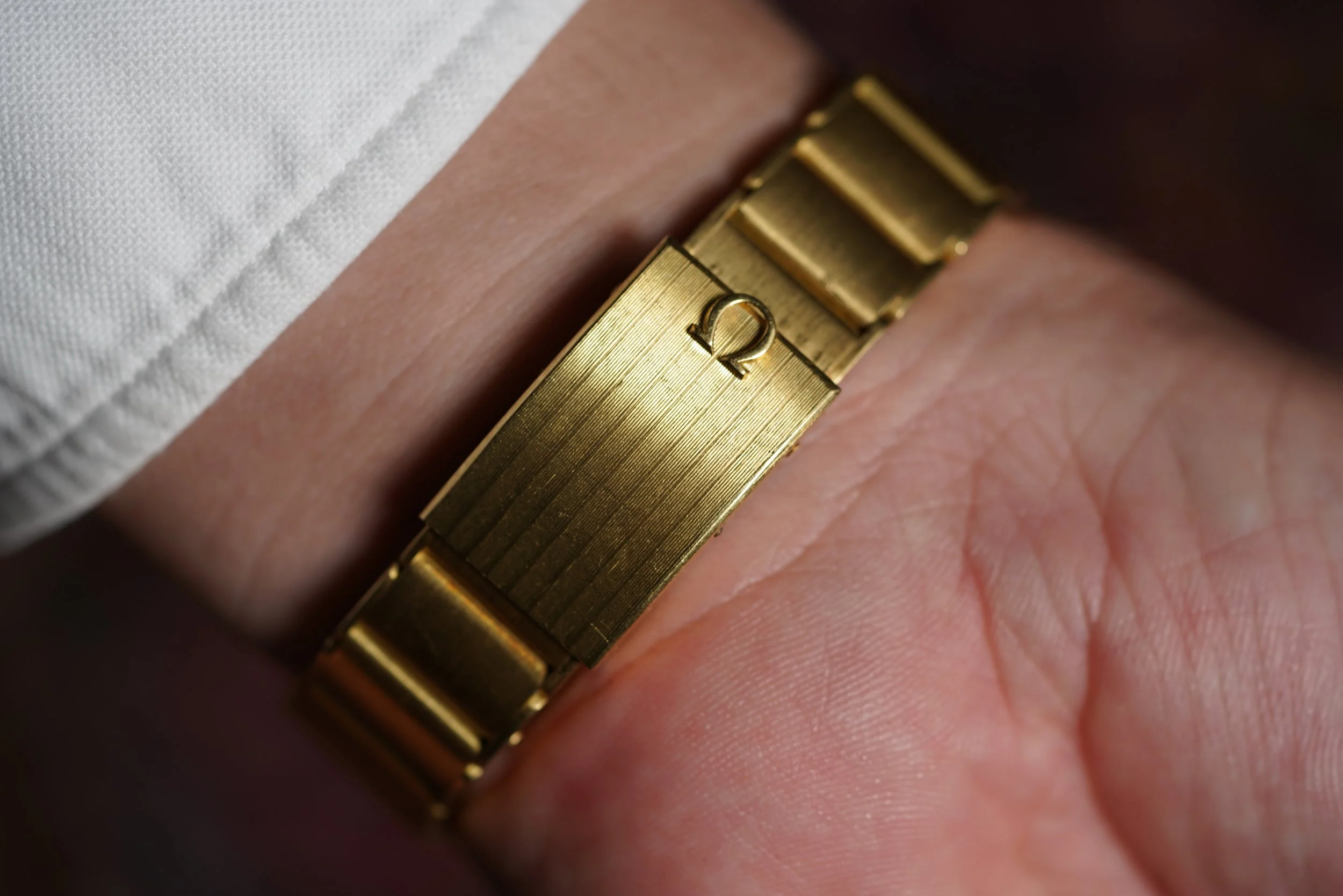 This OMEGA Constellation is an incredible and humongous 18K yellow gold timepiece with a very long bracelet. The watch is in spectacular condition. We believe the case is unpolished. It is powered by the Beta 21 calibre!