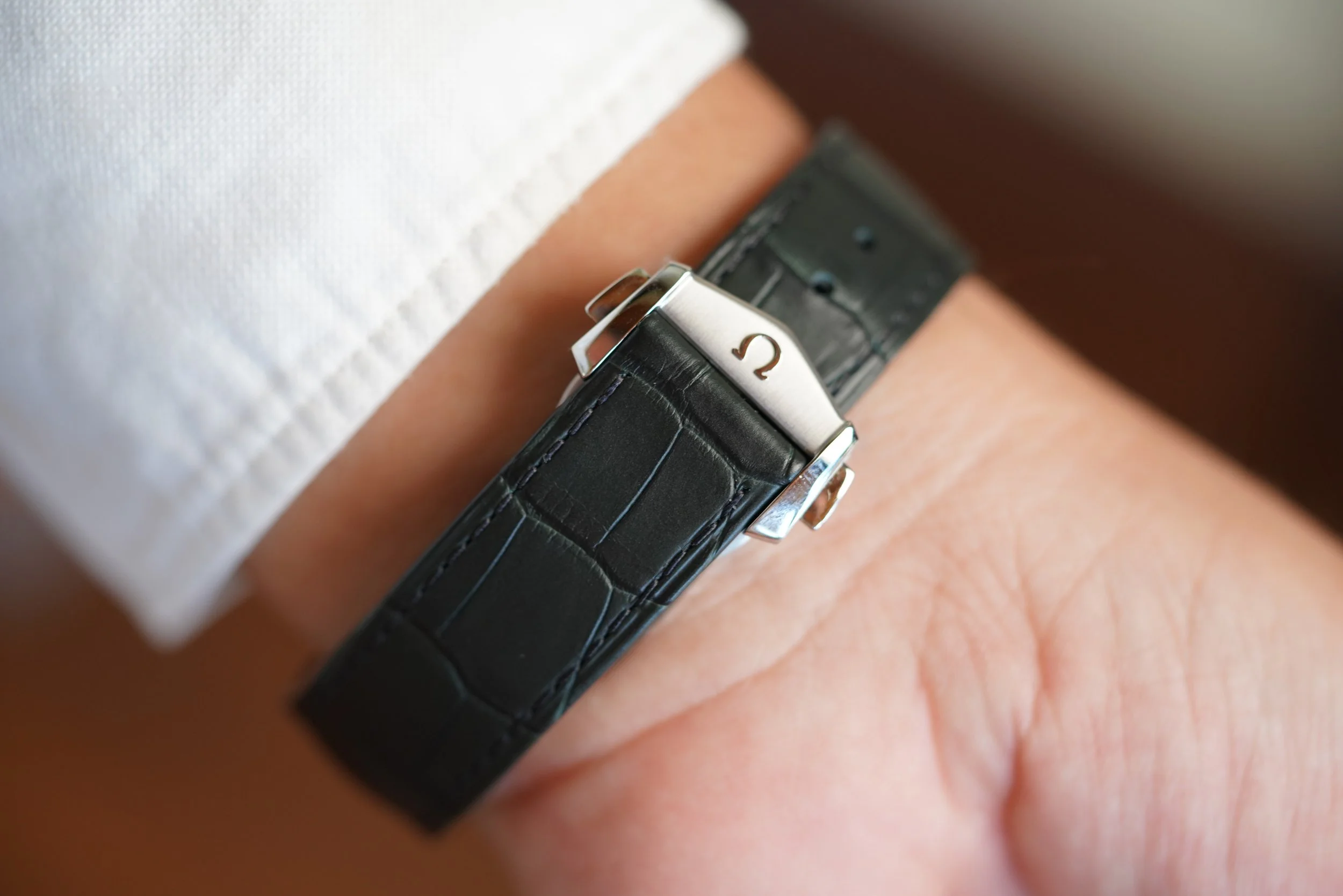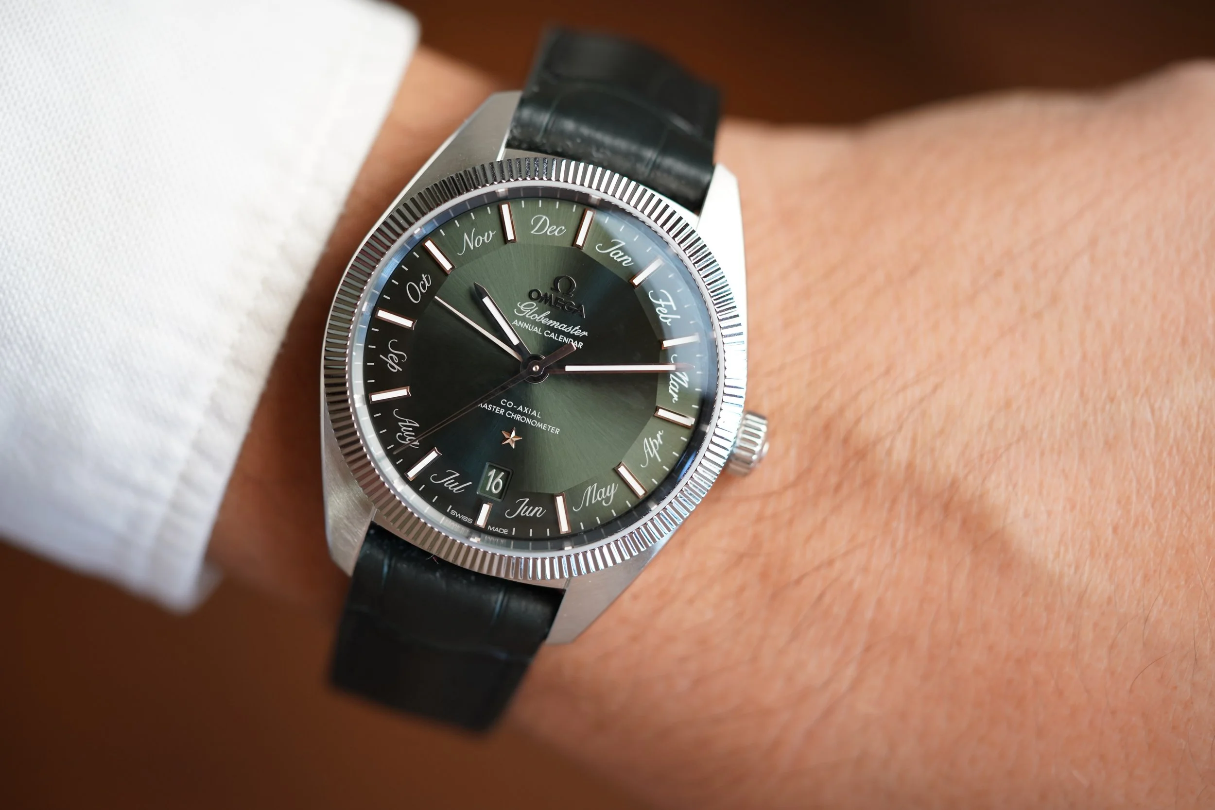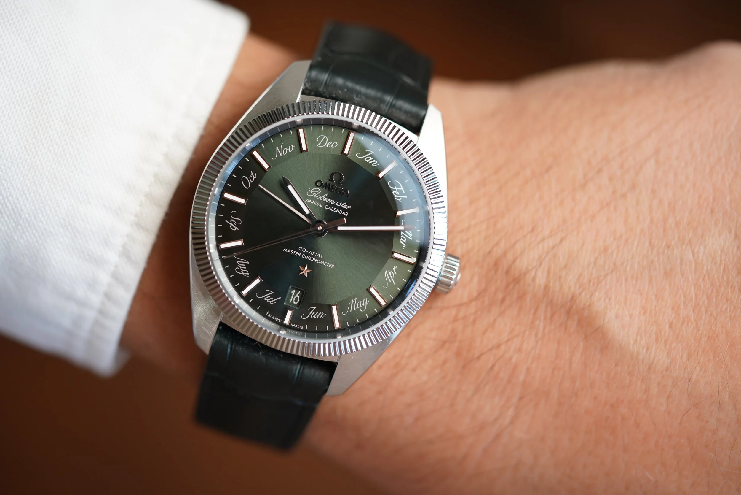 This Omega Globemaster is a 41mm stainless steel annual calendar with a green “pie-pan” dial that pays homage to the vintage Constellation models from the 1950s. The case is 41mm in diameter and 50.10mm lug-to-lug. It’s powered by the automatic caliber Omega 8922. It comes with a leather strap and a stainless steel Omega deployant buckle. It was sold in 2024.