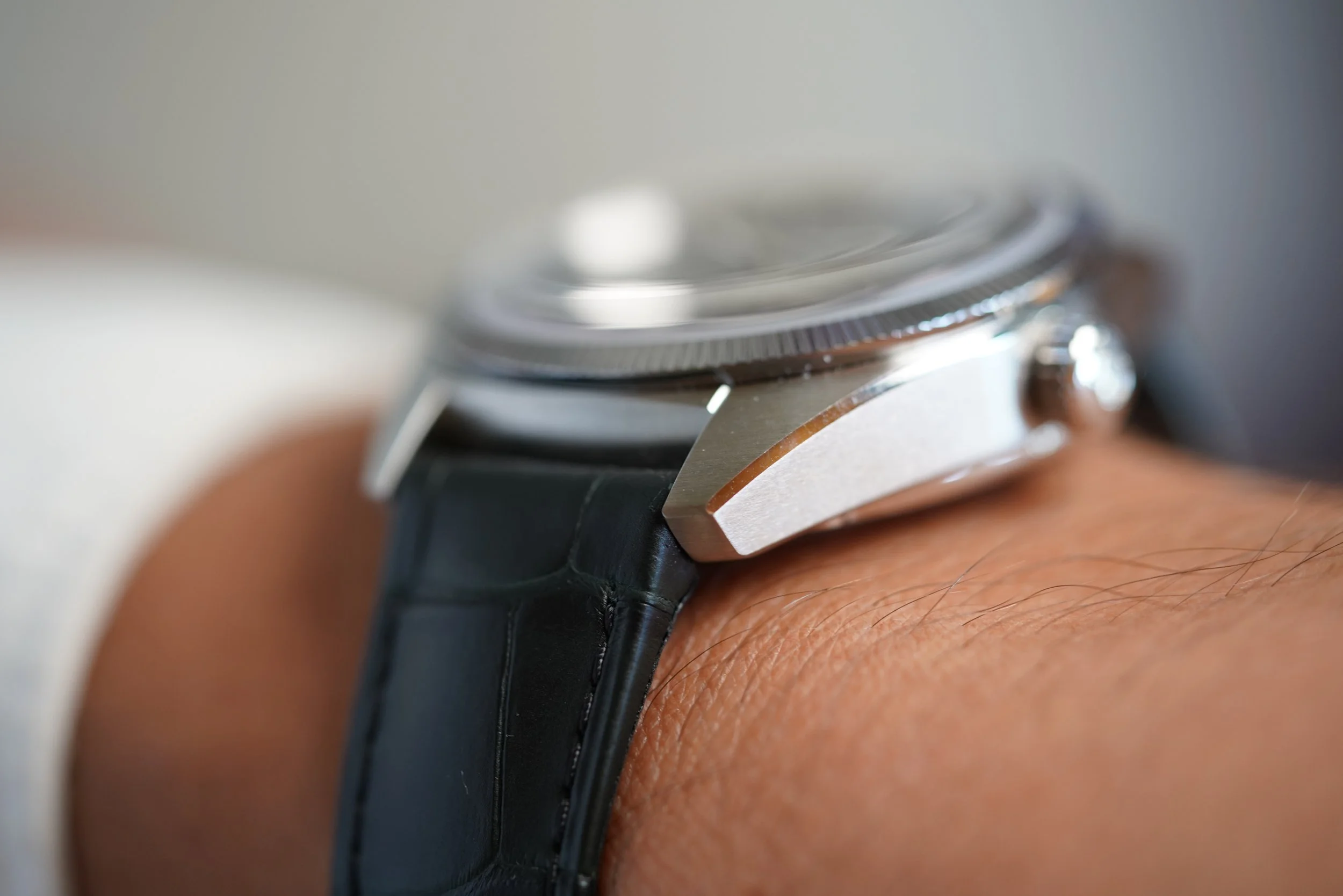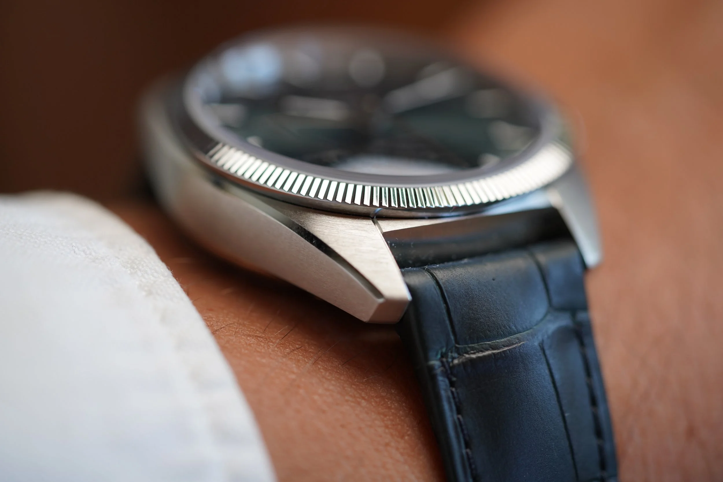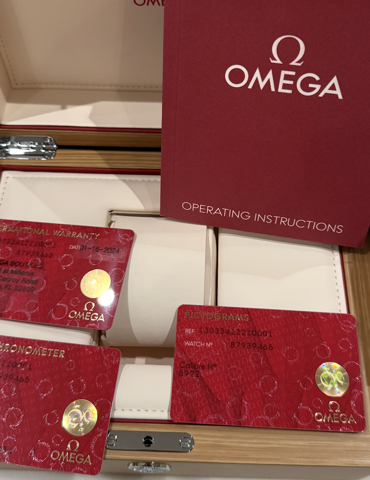 This Omega Globemaster is a 41mm stainless steel annual calendar with a green “pie-pan” dial that pays homage to the vintage Constellation models from the 1950s. The case is 41mm in diameter and 50.10mm lug-to-lug. It’s powered by the automatic caliber Omega 8922. It comes with a leather strap and a stainless steel Omega deployant buckle. It was sold in 2024.