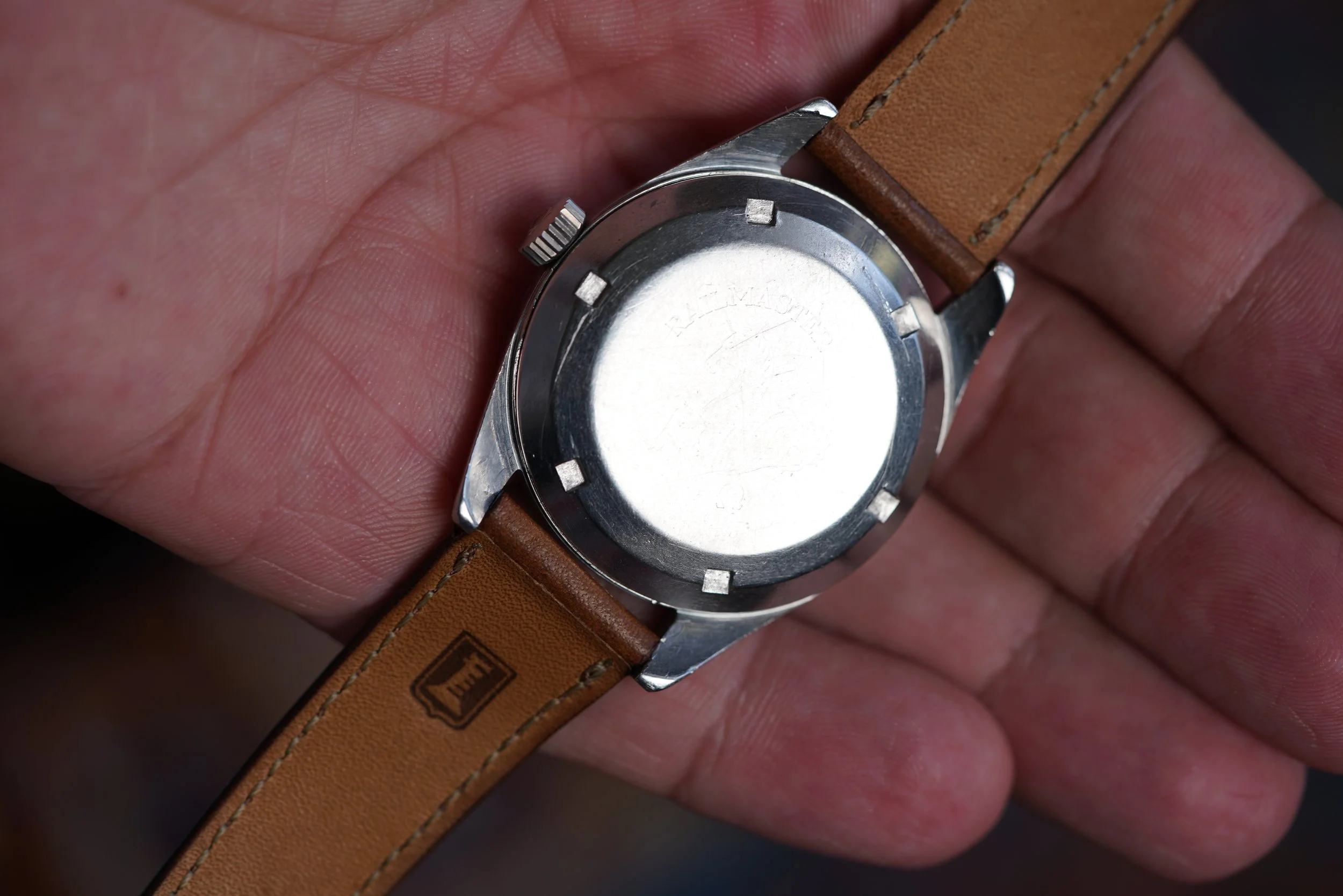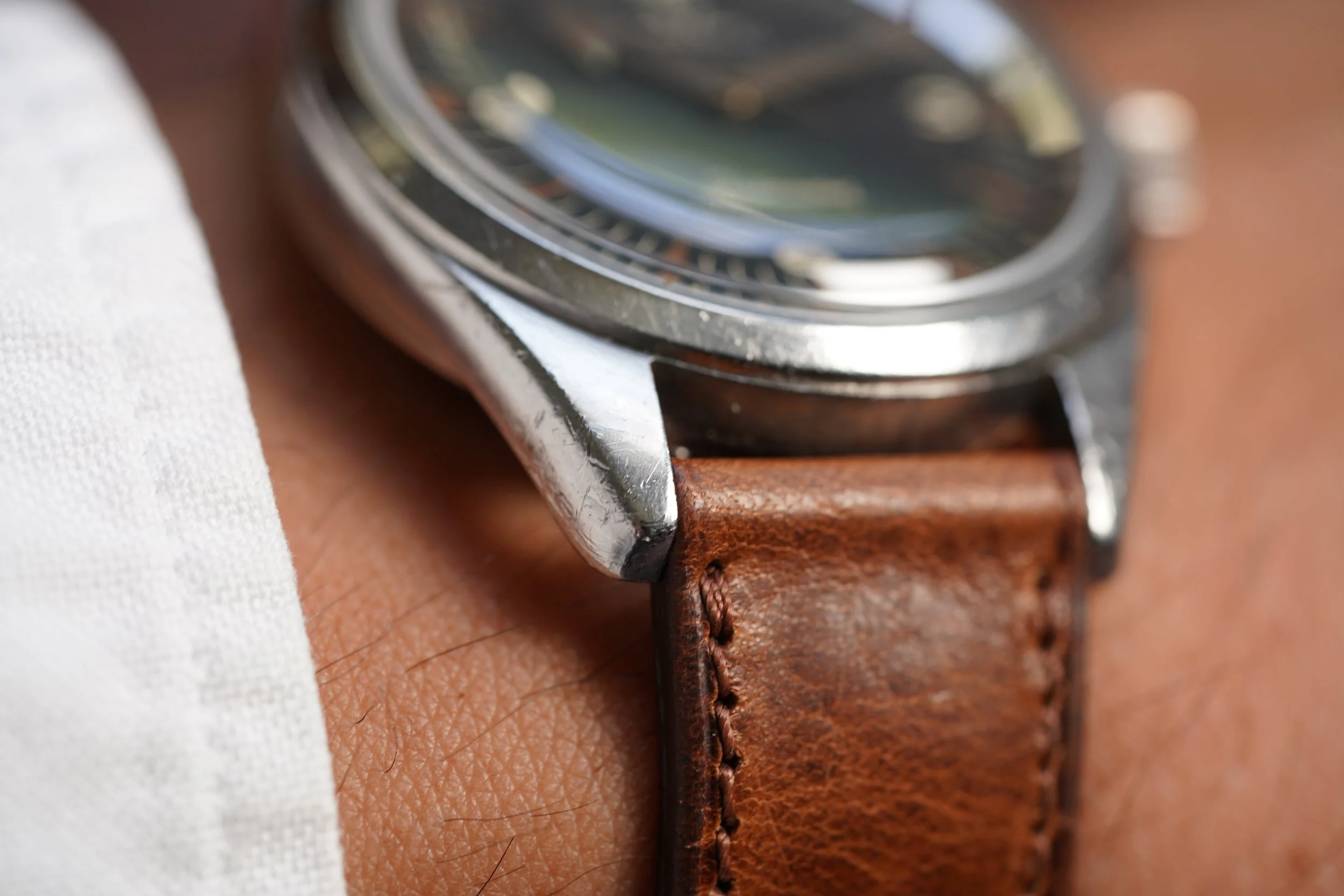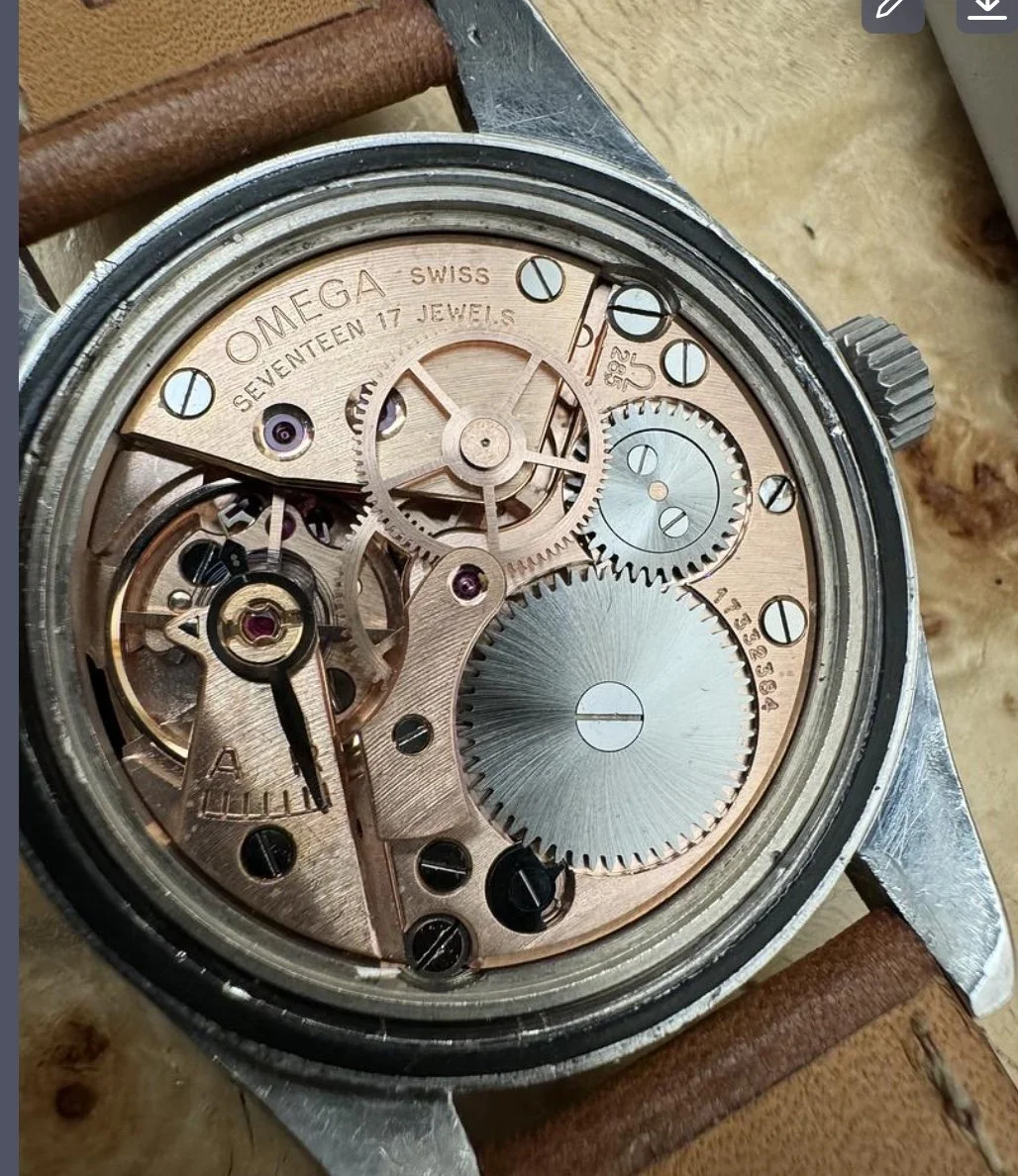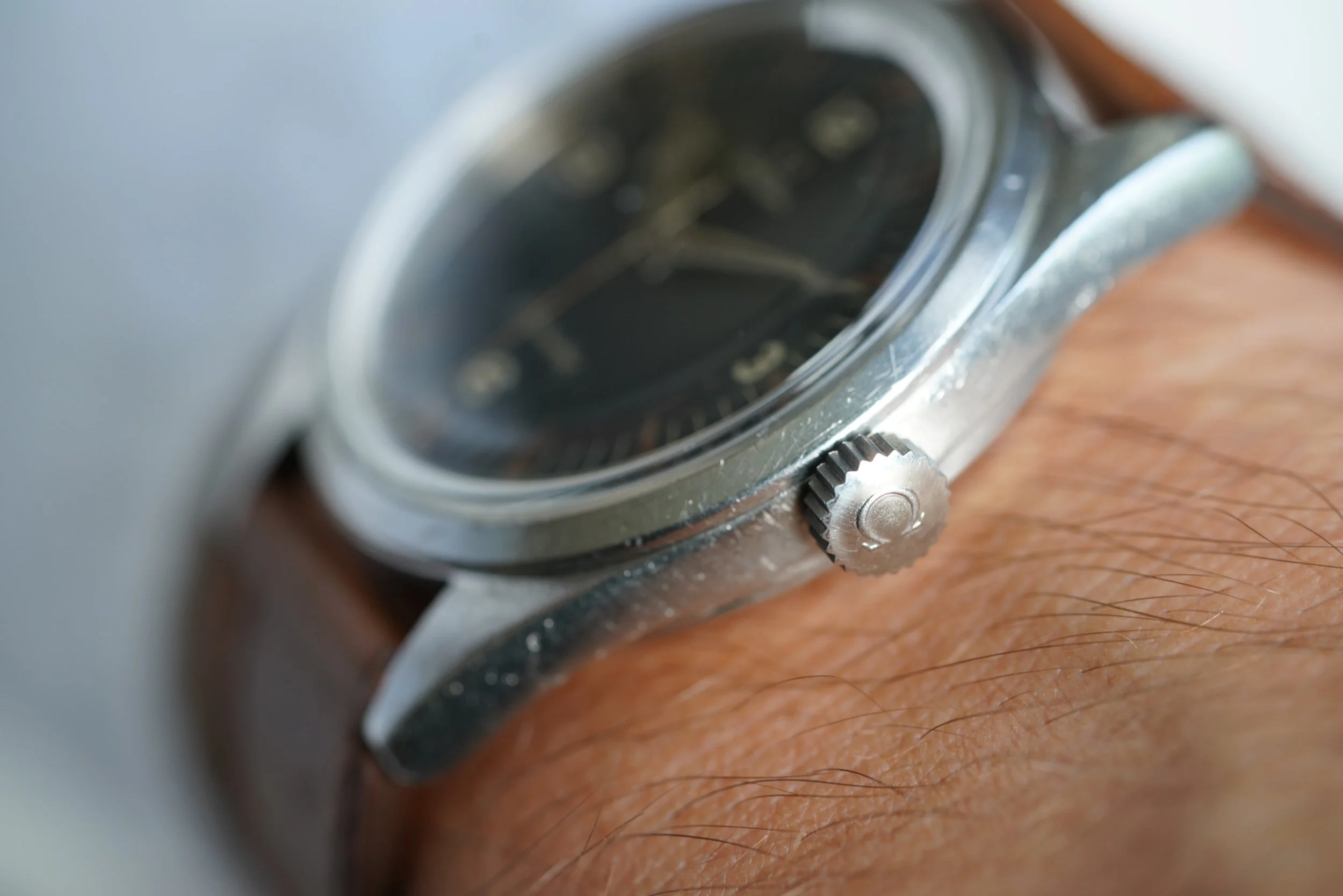 This OMEGA Ralimaster reference 2914-4 SC is an awesome watch. It has very beautiful lume. We believe the case is unpolished but heavily worn. The case measures 38mm by 47mm lug to lug. The watch dates to circa 1959 with a 17.3M movement number. The crown is a replacement.