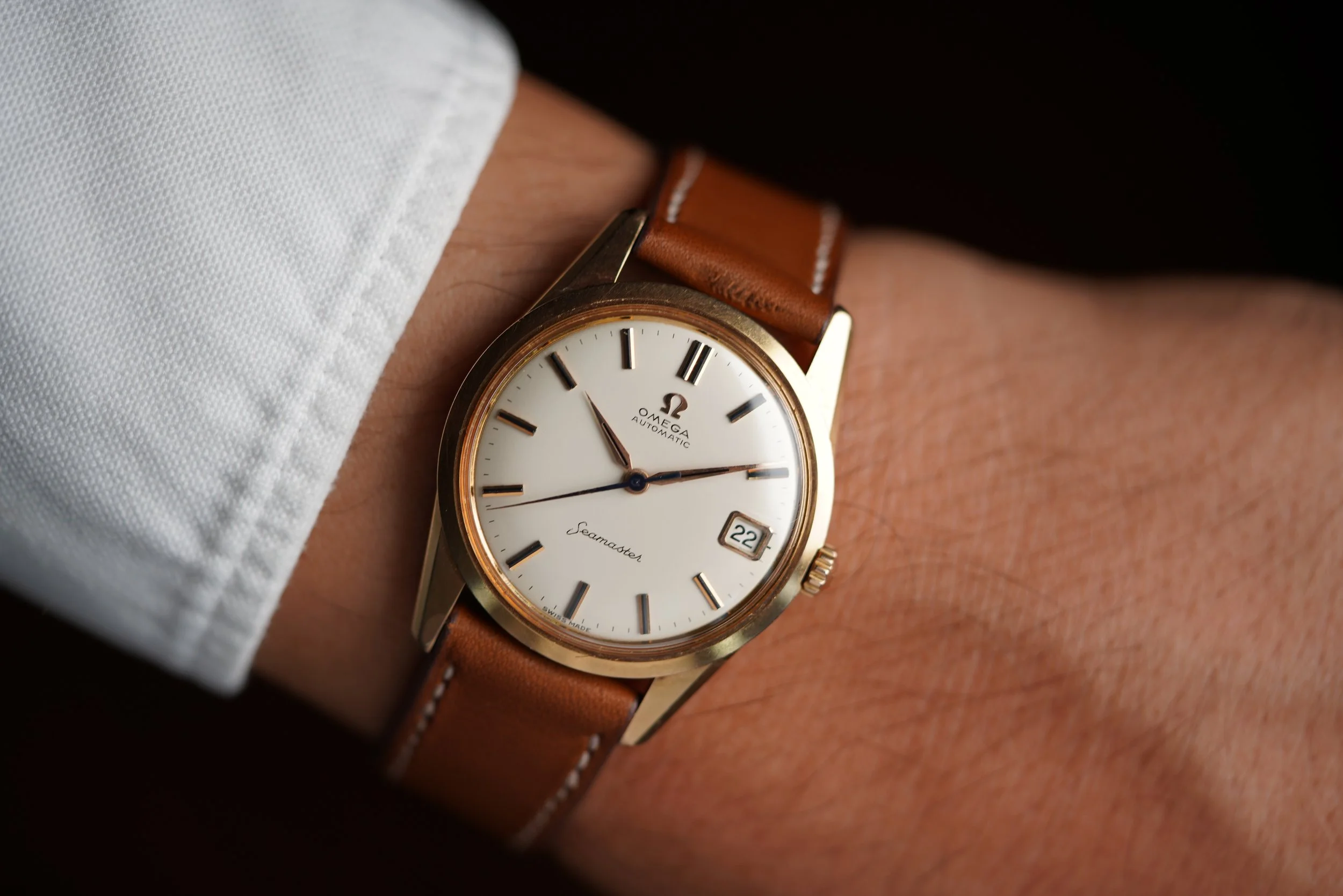 This watch is an elegant take on the iconic Omega Seamaster line. The case is in 18k rose gold and appears to be unpolished. The watch features an automatic movement, the Omega 562, and has a date window at the 3 o’clock index. It measures 34mm in diameter and approximately 42mm lug-to-lug.