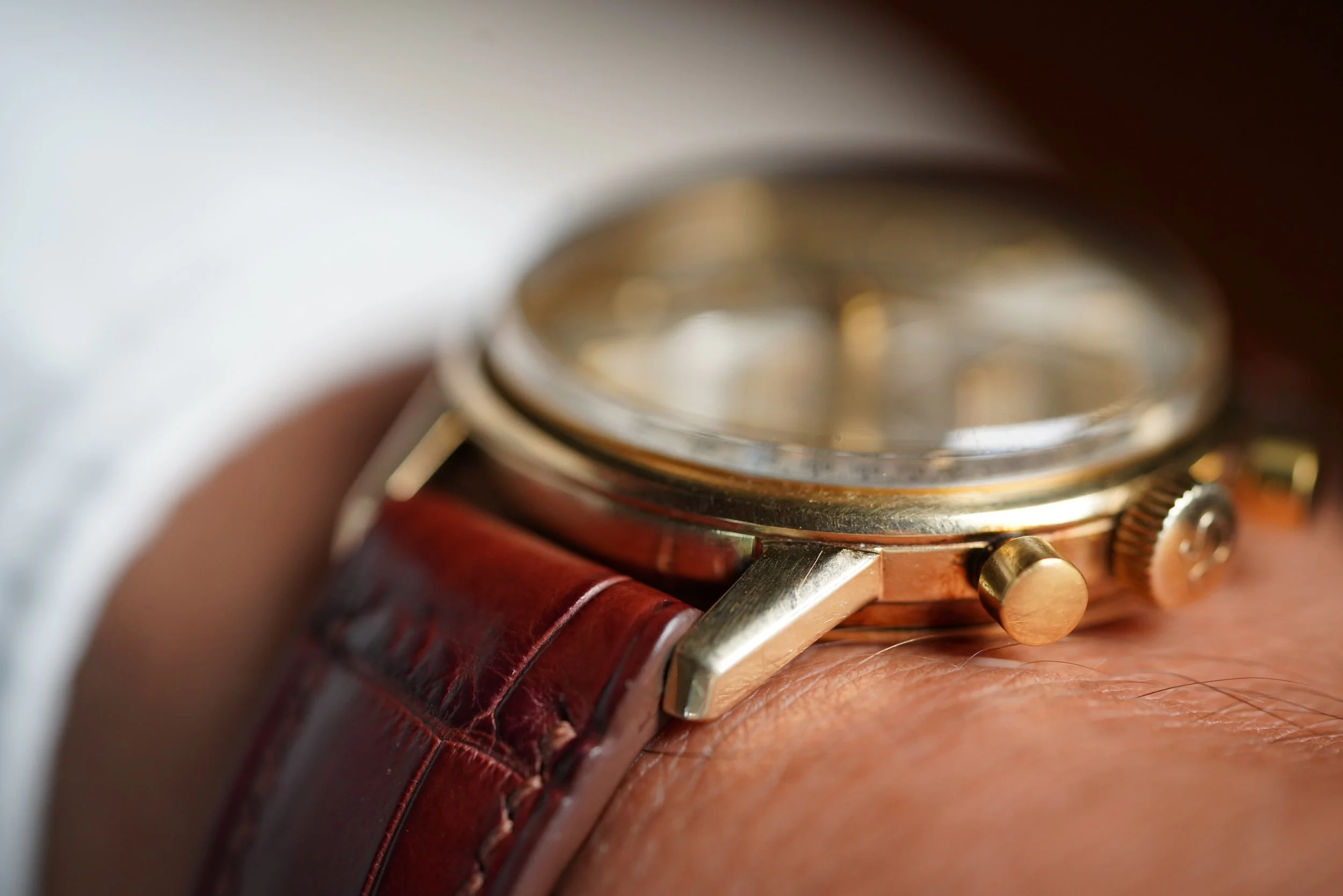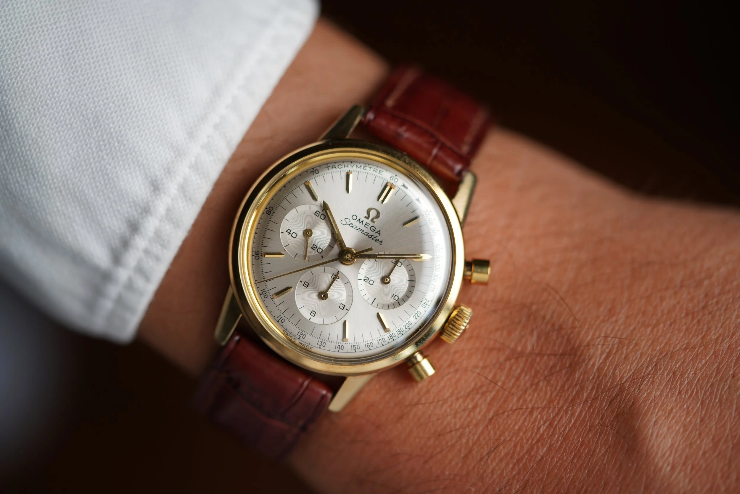 The iconic Omega Seamaster remains one of the brand's flagship watches to date. This example, reference 105.001 in 14k gold, is a tasteful take on the Omega chronograph. The case is has been lightly polished. The watch features the legendary Omega 321 movement, renowned for powering many of the Speedmasters throughout the late 1950s and 1960s. It measures 35.5mm in diameter and approximately 42.5mm lug-to-lug.