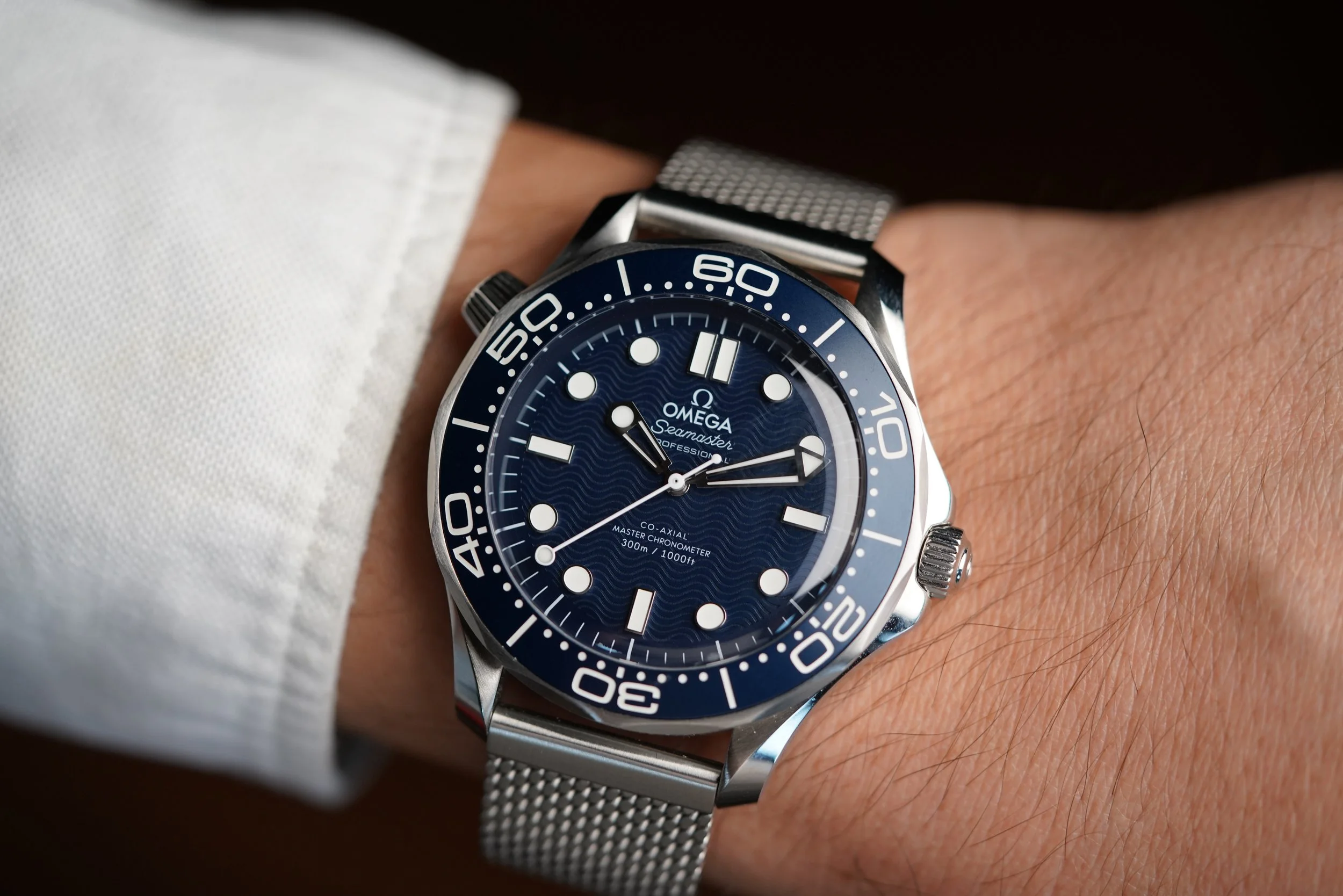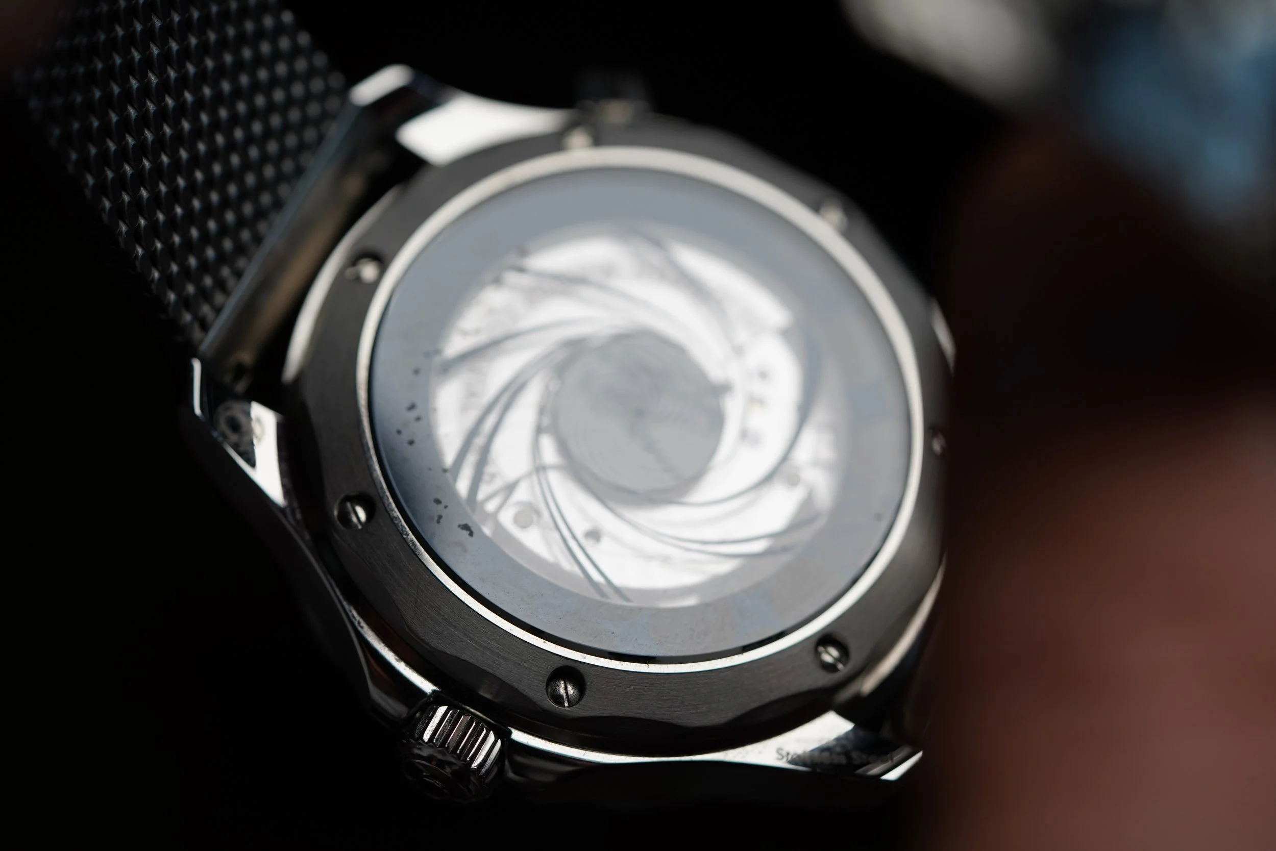This OMEGA Seamaster Diver 300M James Bond 60 Year Anniversary is a very special watch. It measures 42mm in diameter. The watch commemorates the 60 year anniversary of James Bond. “It was launched to celebrate six decades of 007 on screen, OMEGA’s Seamaster Diver 300M in stainless steel is replete with Bond movie tributes, including a playful and dynamic nod to the iconic opening sequence, known and loved by Bond fans all over the world.” Did you notice the caseback? “The famous opening sequence, featuring Bond in silhouette and spinning gun barrel, plays out on the caseback, beneath a sapphire decorated with micro-structured metallisation. The “moiré” effect animation is linked to the spinning of the lollipop seconds hand, so the action never stops.” Wow!