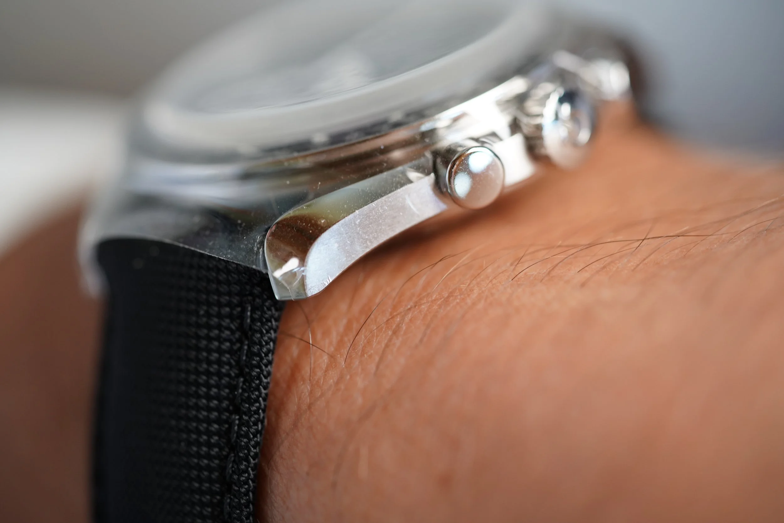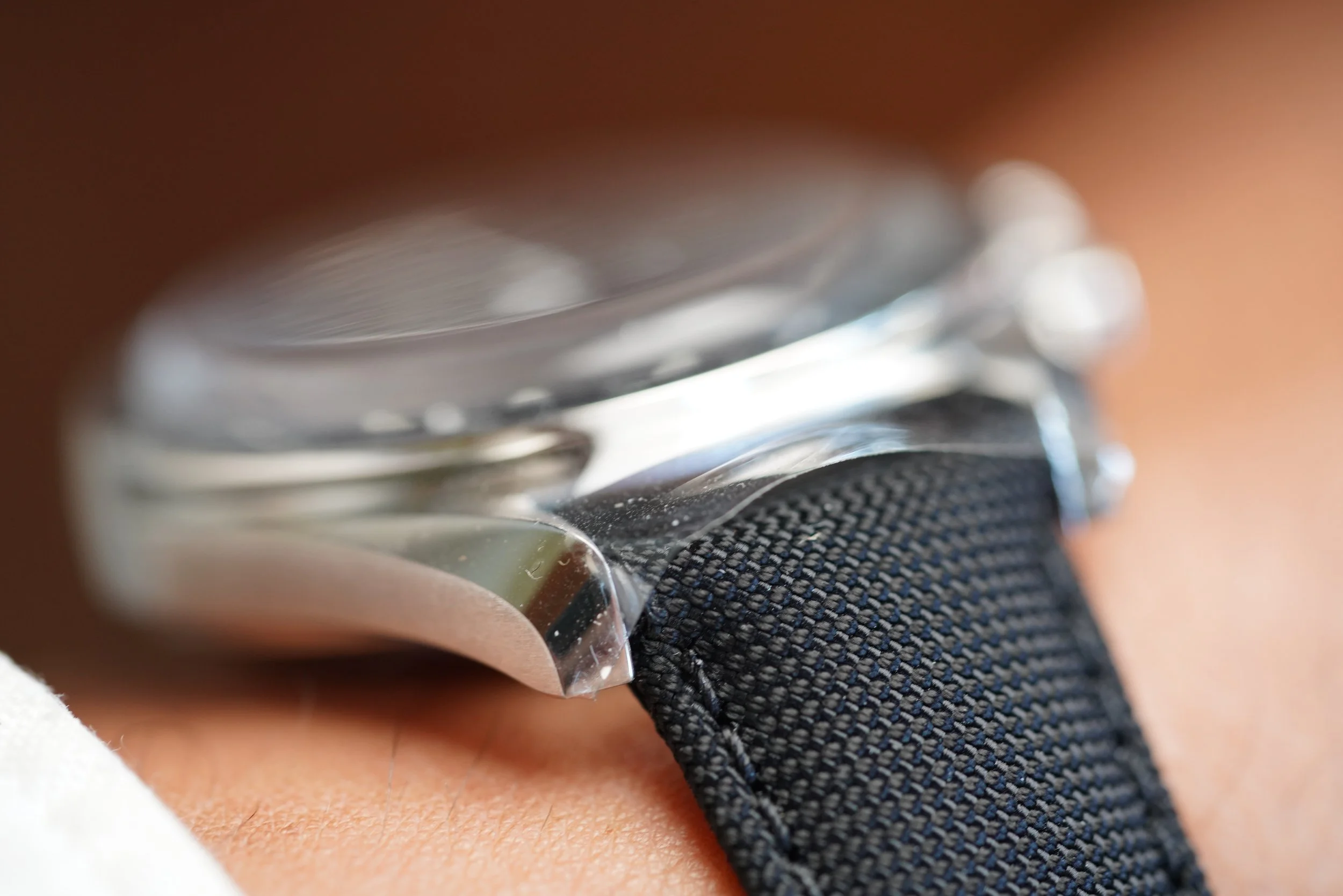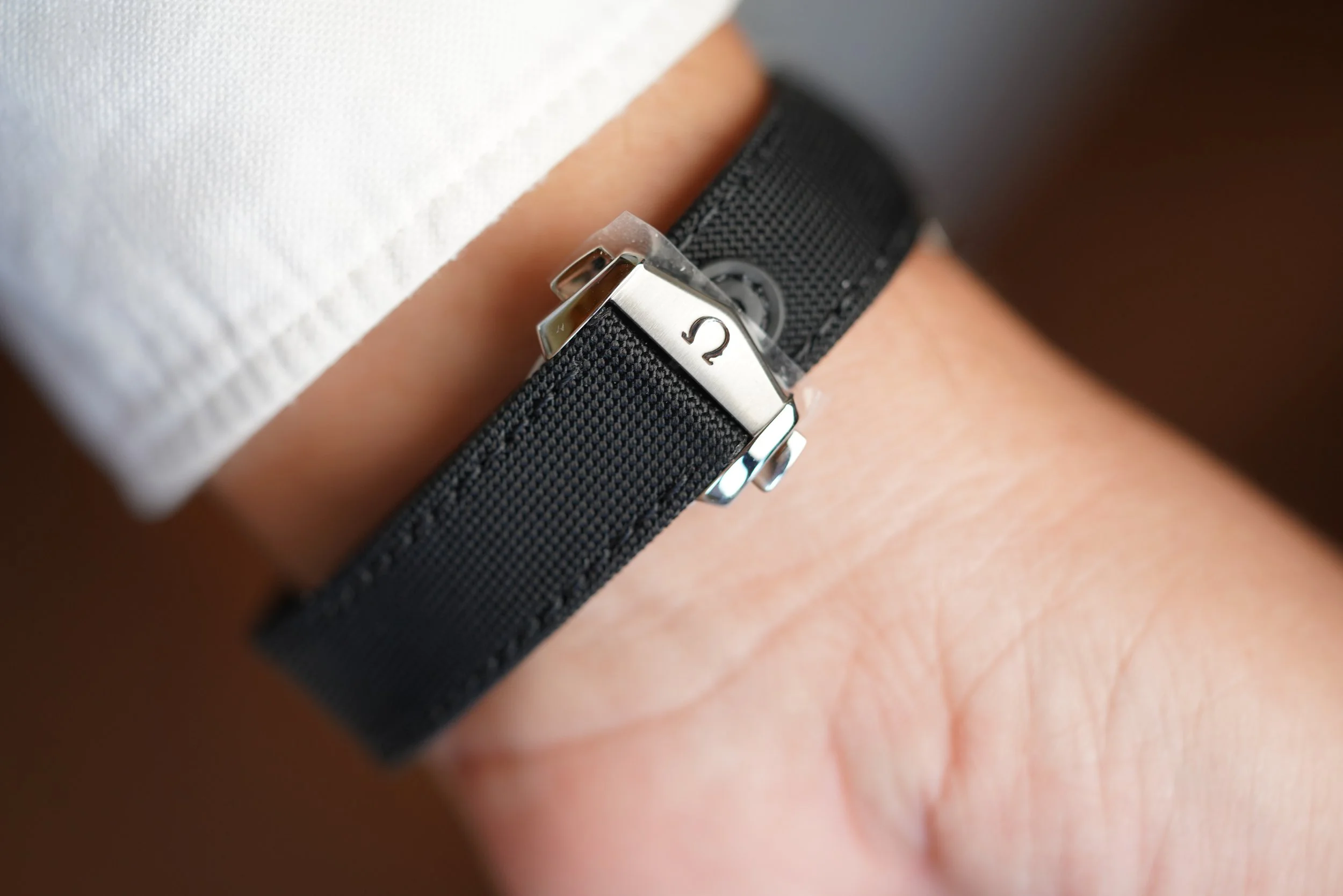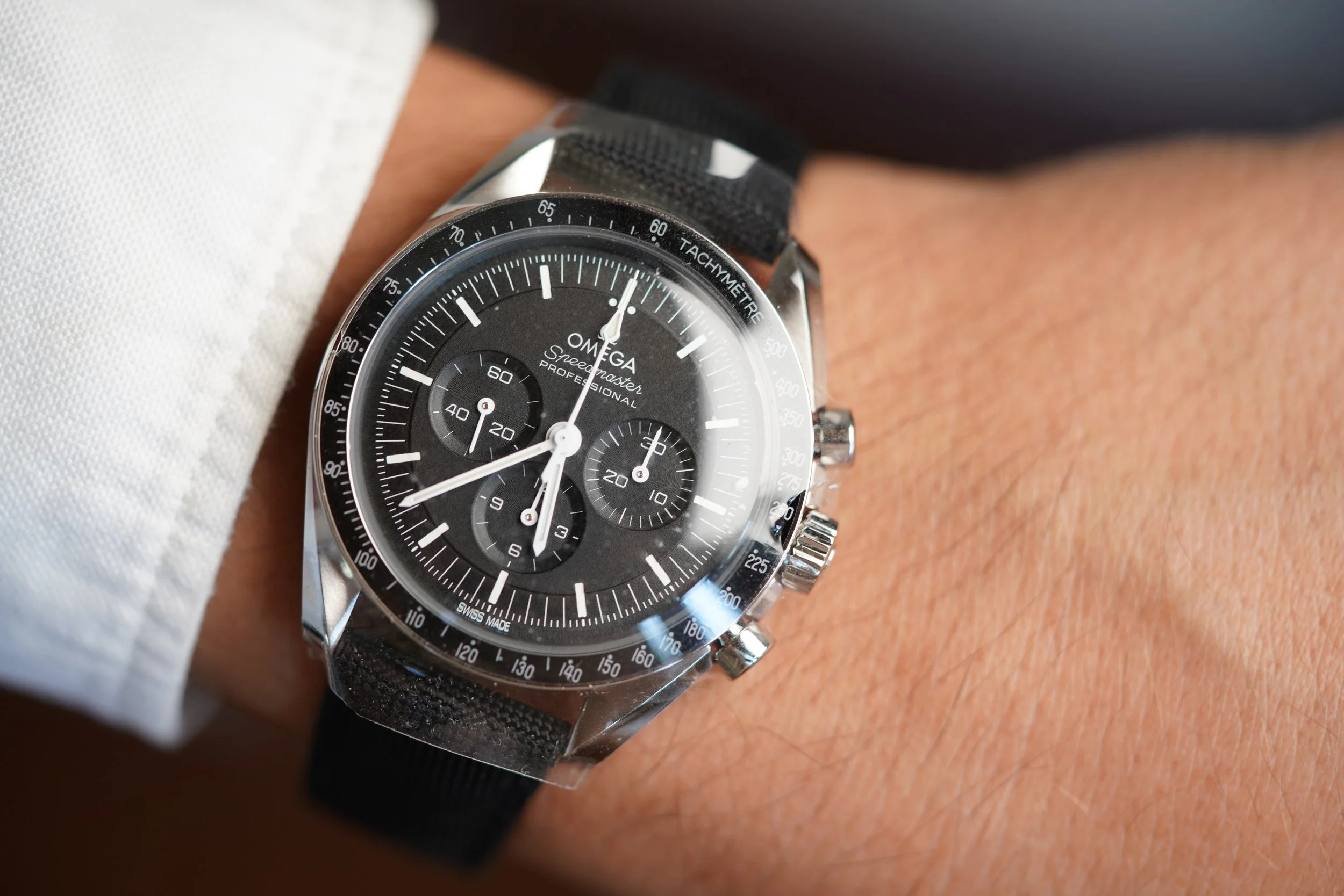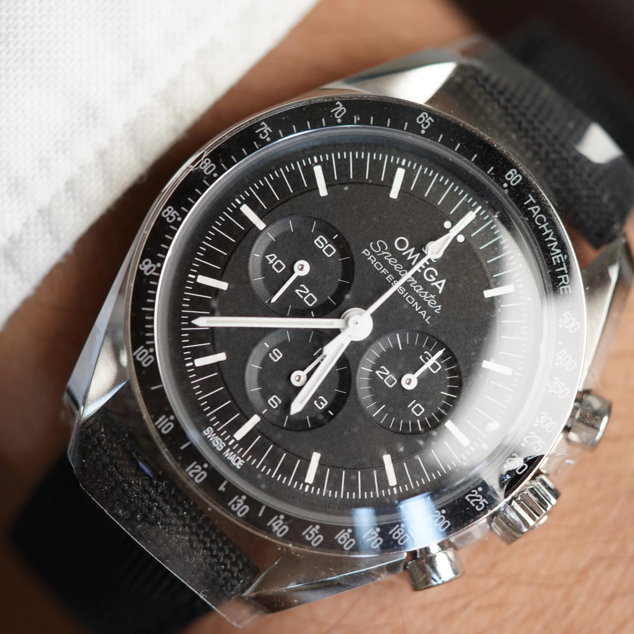 This is a great modern Speedmaster paired on a black nylon strap with an Omega deployant buckle. The watch is powered by the Omega master chronometer calibre 3861. This reference also features a “hesalite” acrylic crystal, like the vintage models.
