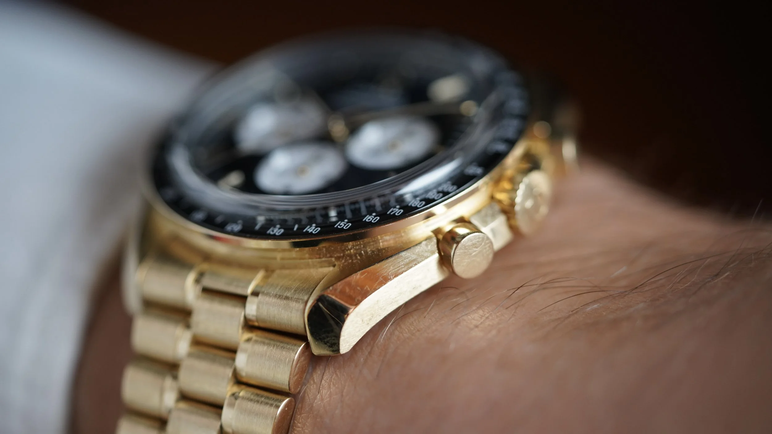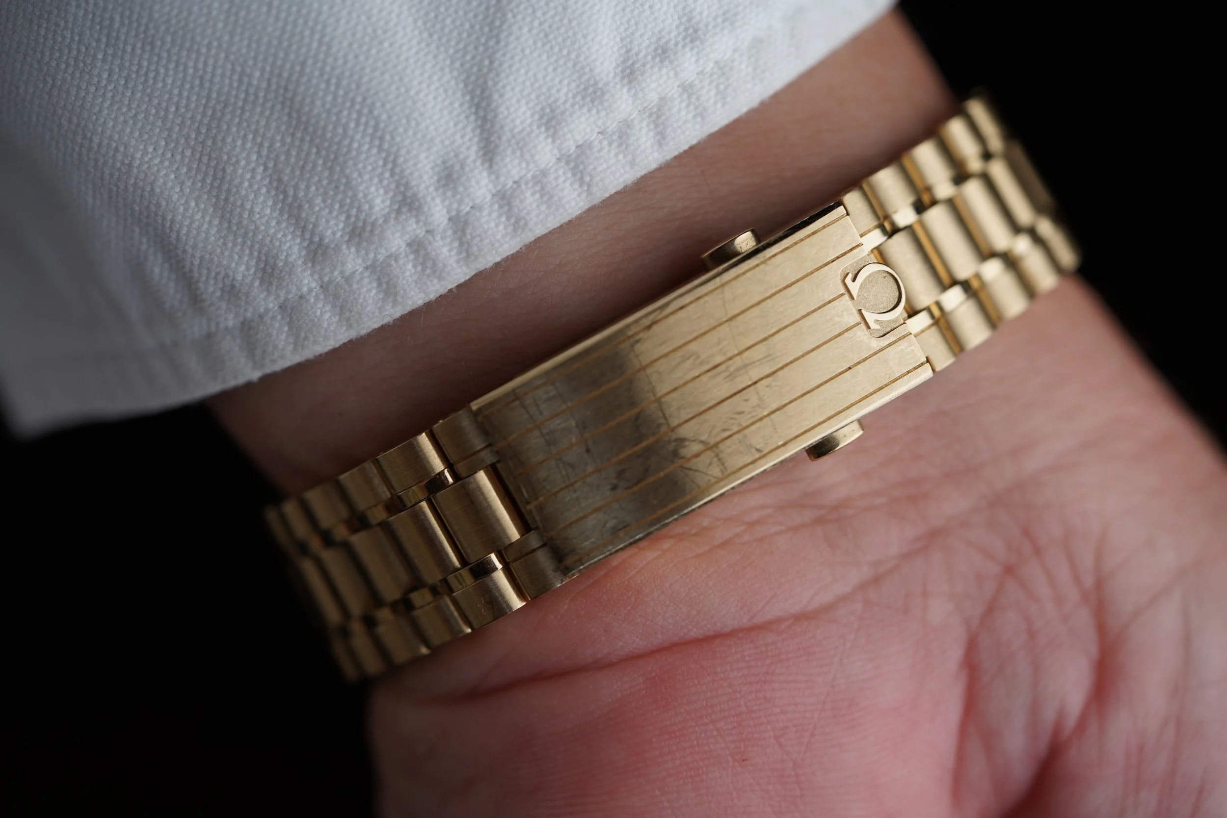 This OMEGA Speedmaster is a great modern chronograph. The 42mm case and bracelet are both in Moonshine gold, OMEGA’s 18k yellow gold alloy. The watch features a black dial with contrasting white subdials. The watch features an exhibition caseback displaying the 3861 movement. The watch shows some signs of wear, but we believe it to be unpolished.