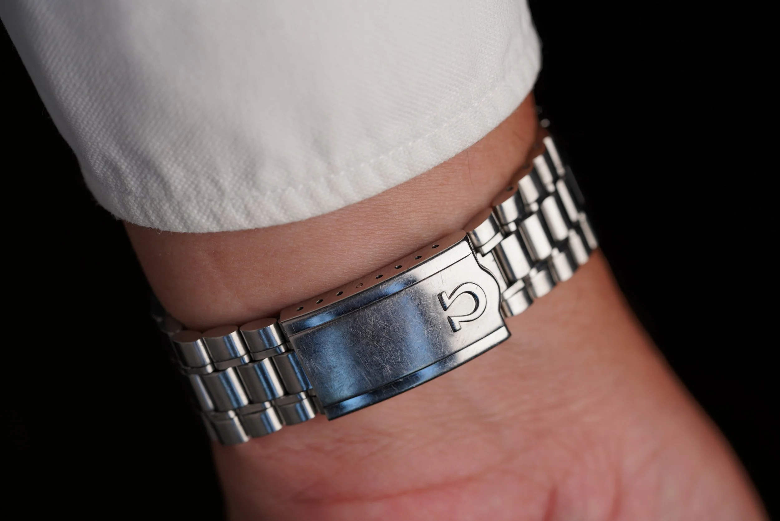 This OMEGA Speedmaster Mark 2 reference 145.014 is a phenomenal watch with an exotic-racing dial. The case is in great condition and has never been polished. It is paired on the rare 1159 OMEGA bracelet.