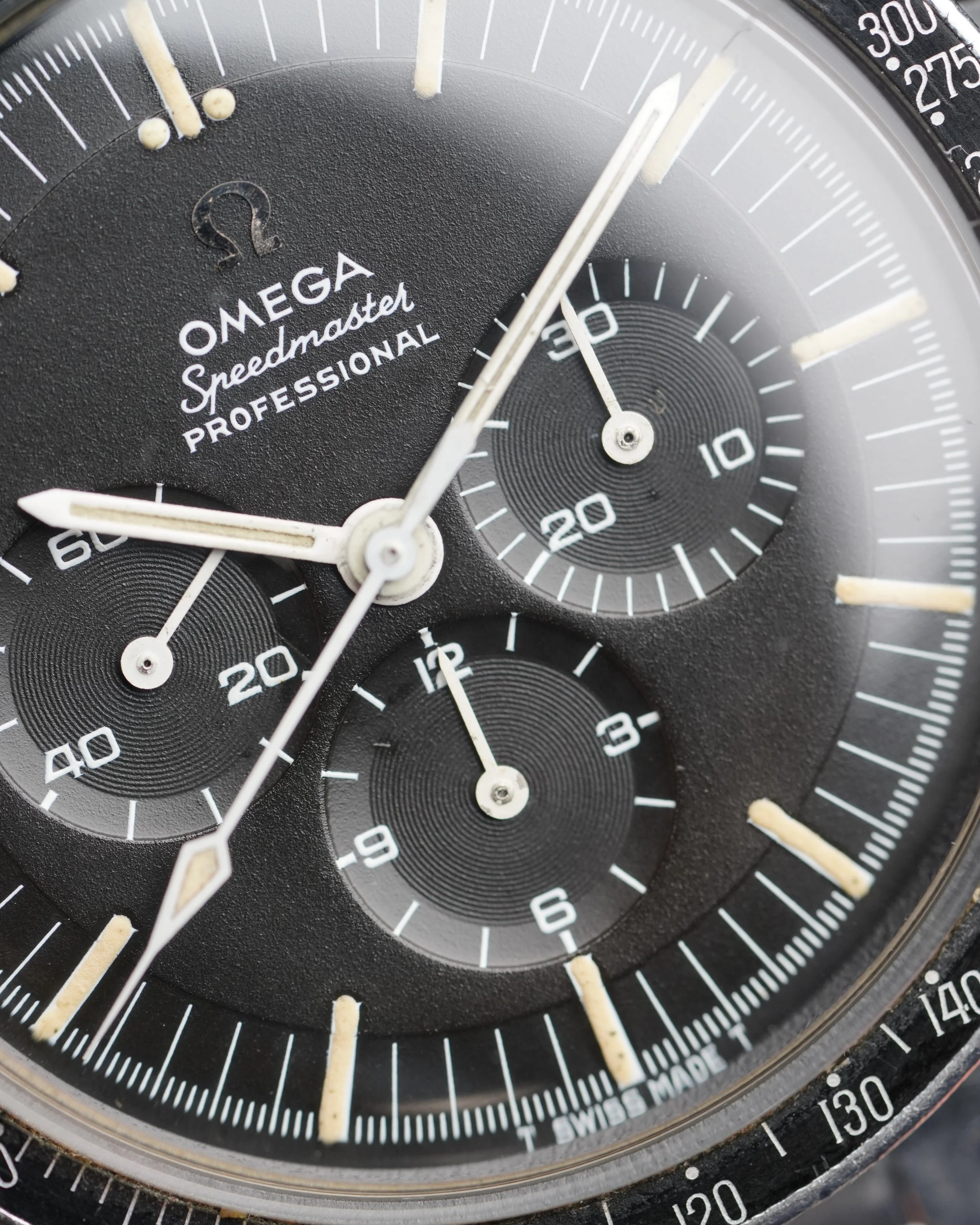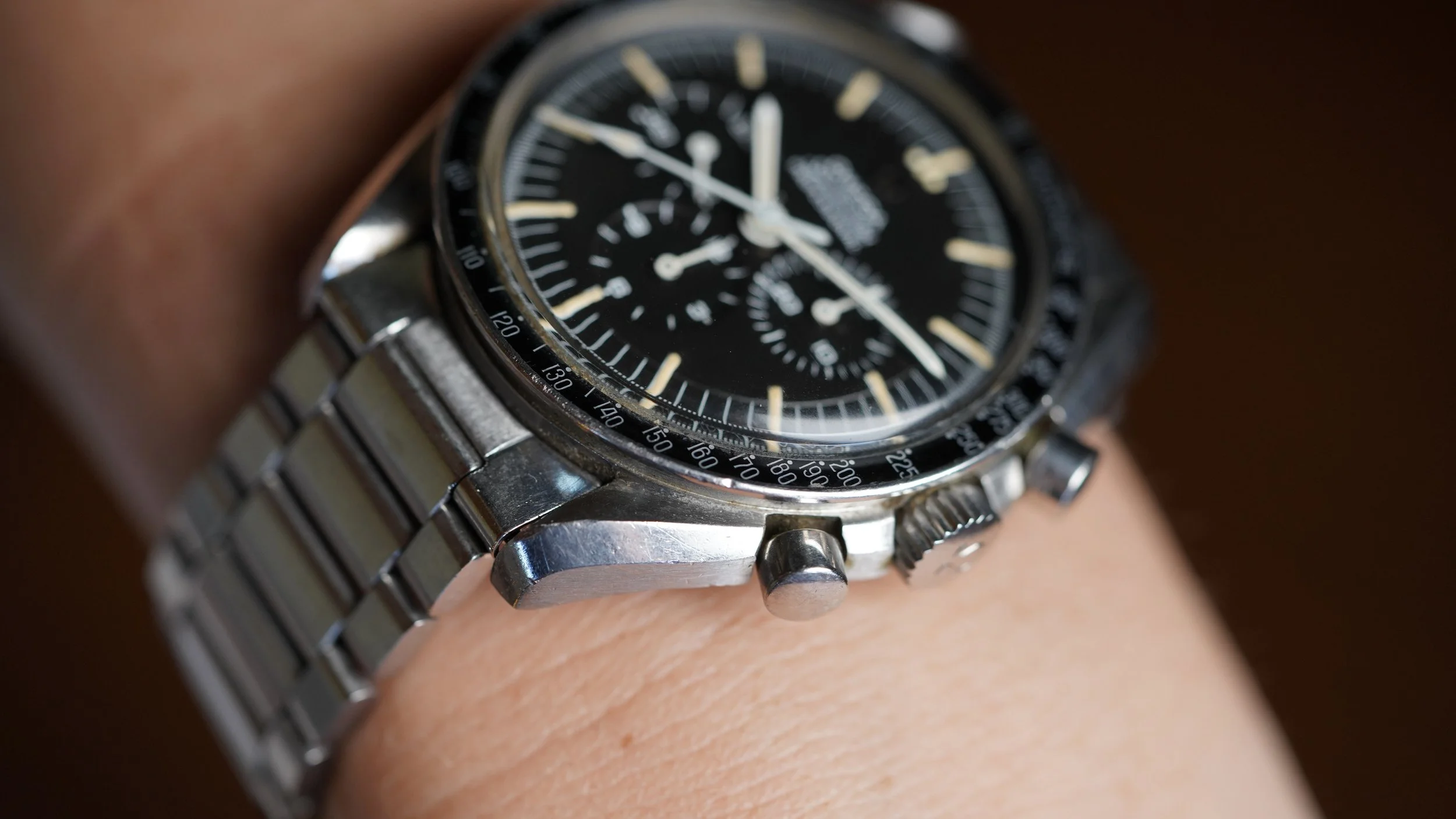 This OMEGA Speedmaster Professional reference 145.012-67 is a very nice example. The case appears to be unpolished and measures at 42mm. It is powered by a manual wind movement calibre 321. Everyone prefers the 321 over the successor calibre 861! The crown is original. The lume is very attractive. Someone on Hodinkee one time referred to the luminous markers as “the lumes” in a video on vintage OMEGA. It was unsettling and Eric hated hearing it.