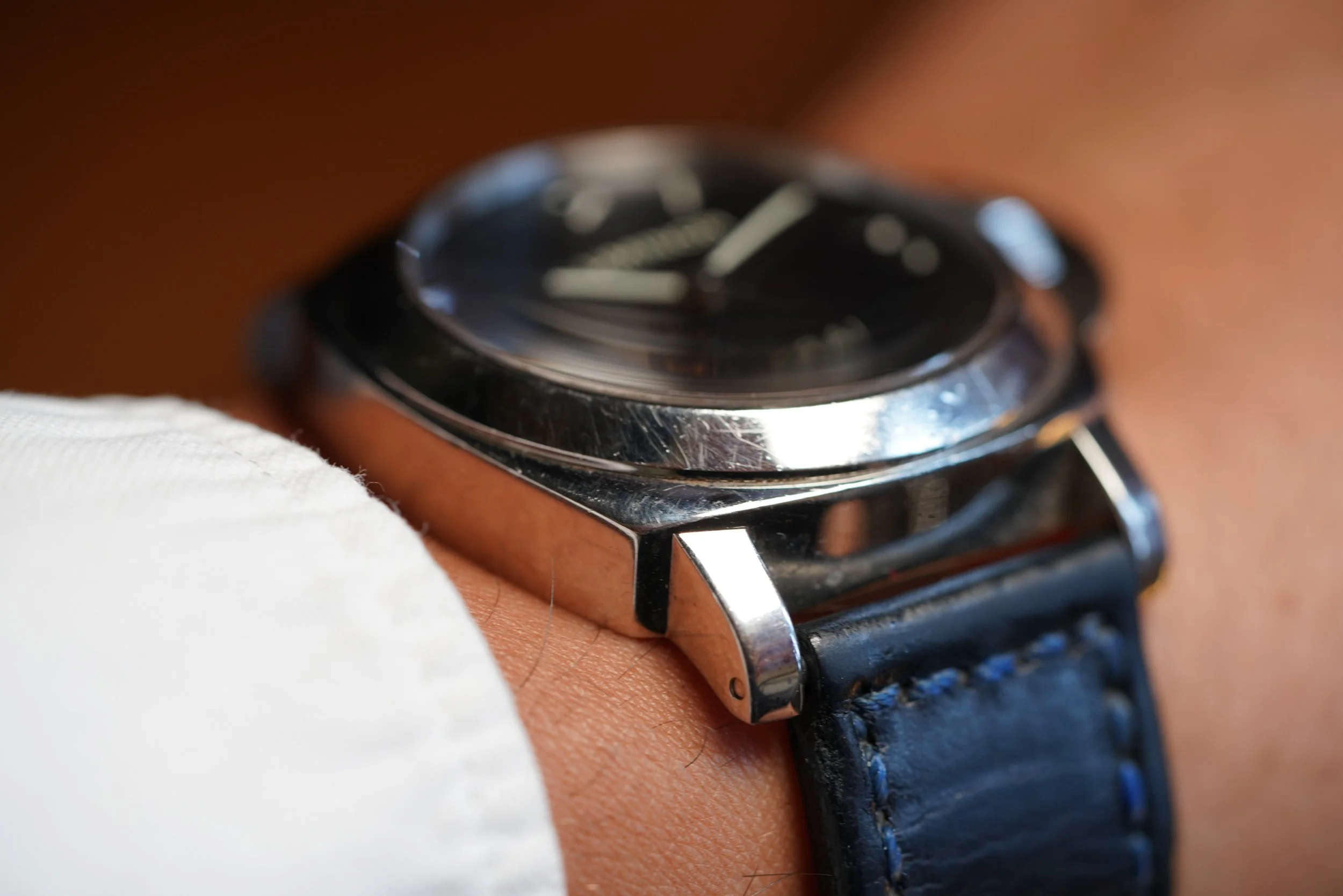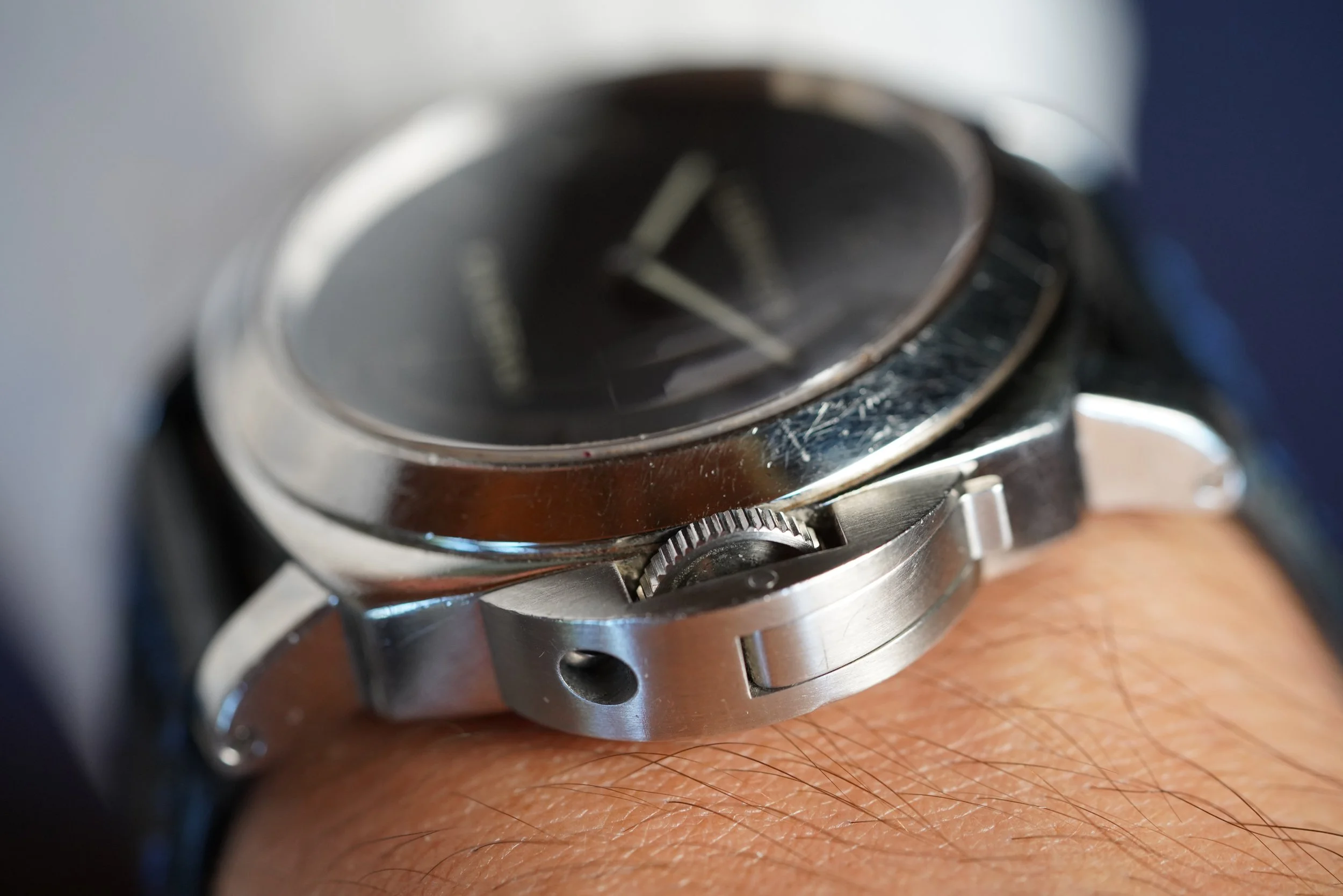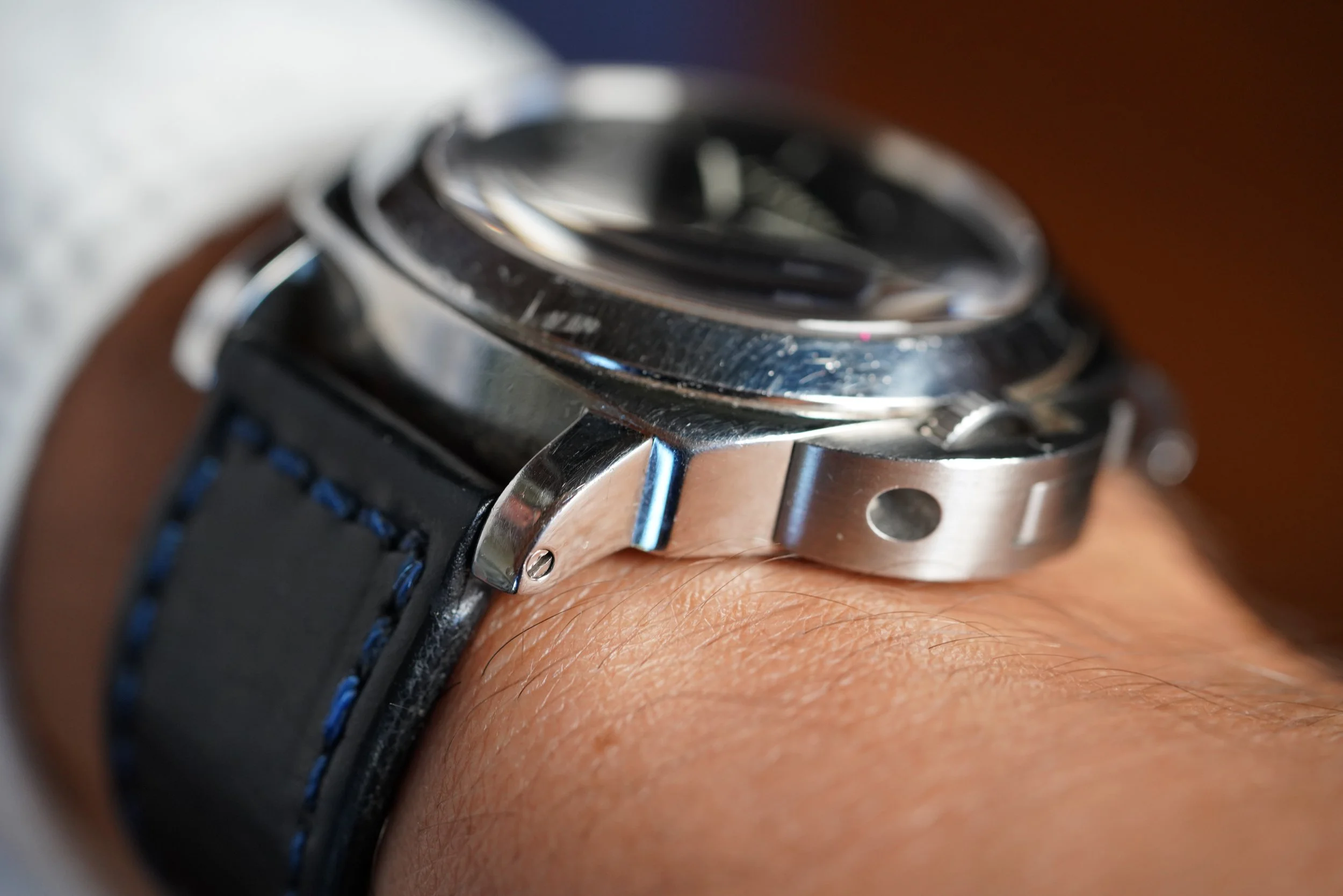 This is a very special Panerai Luminor and it appears to be the PAM 112. The case is stainless steel. It measures approximately 45mm in diameter. The lume is very attractive.