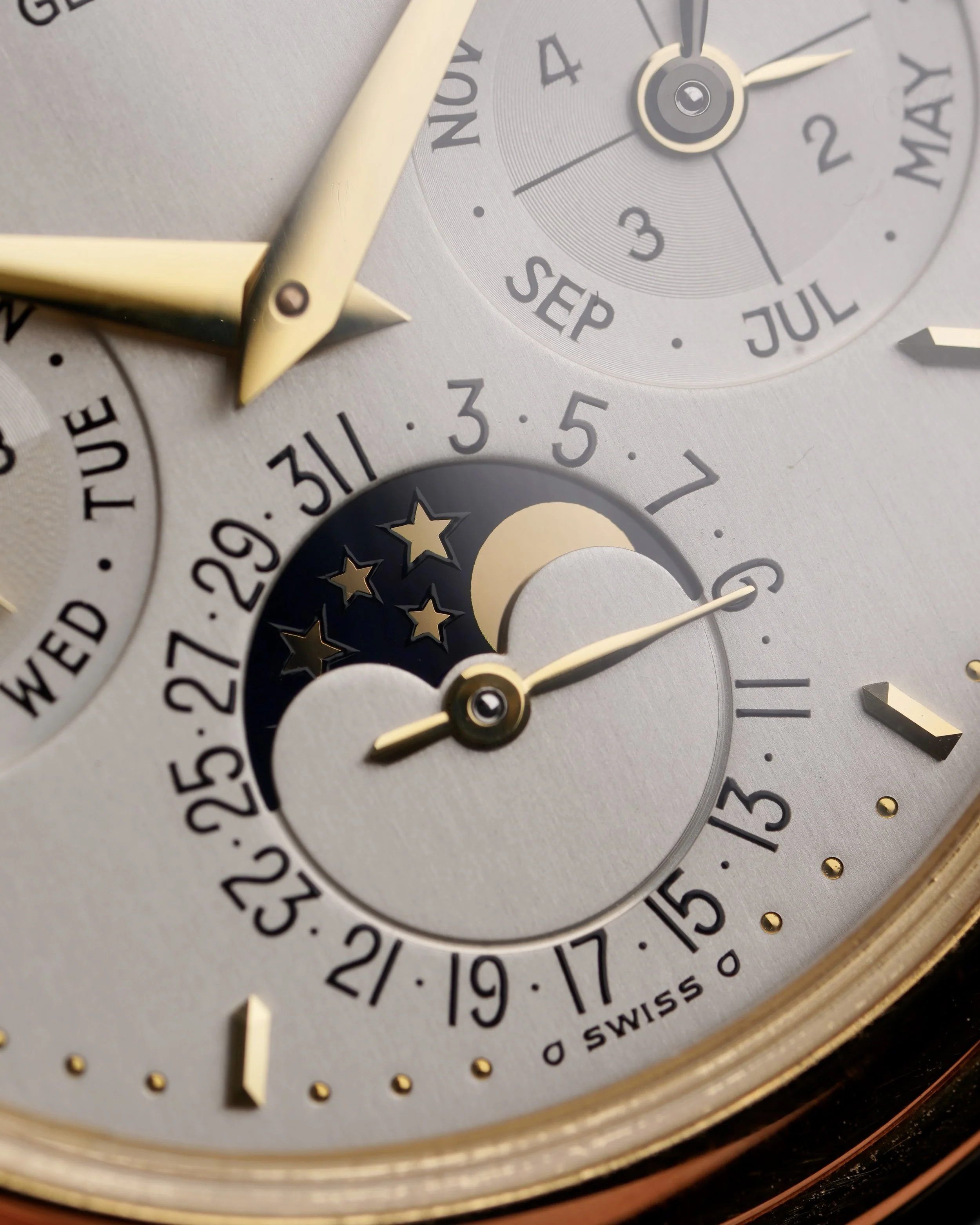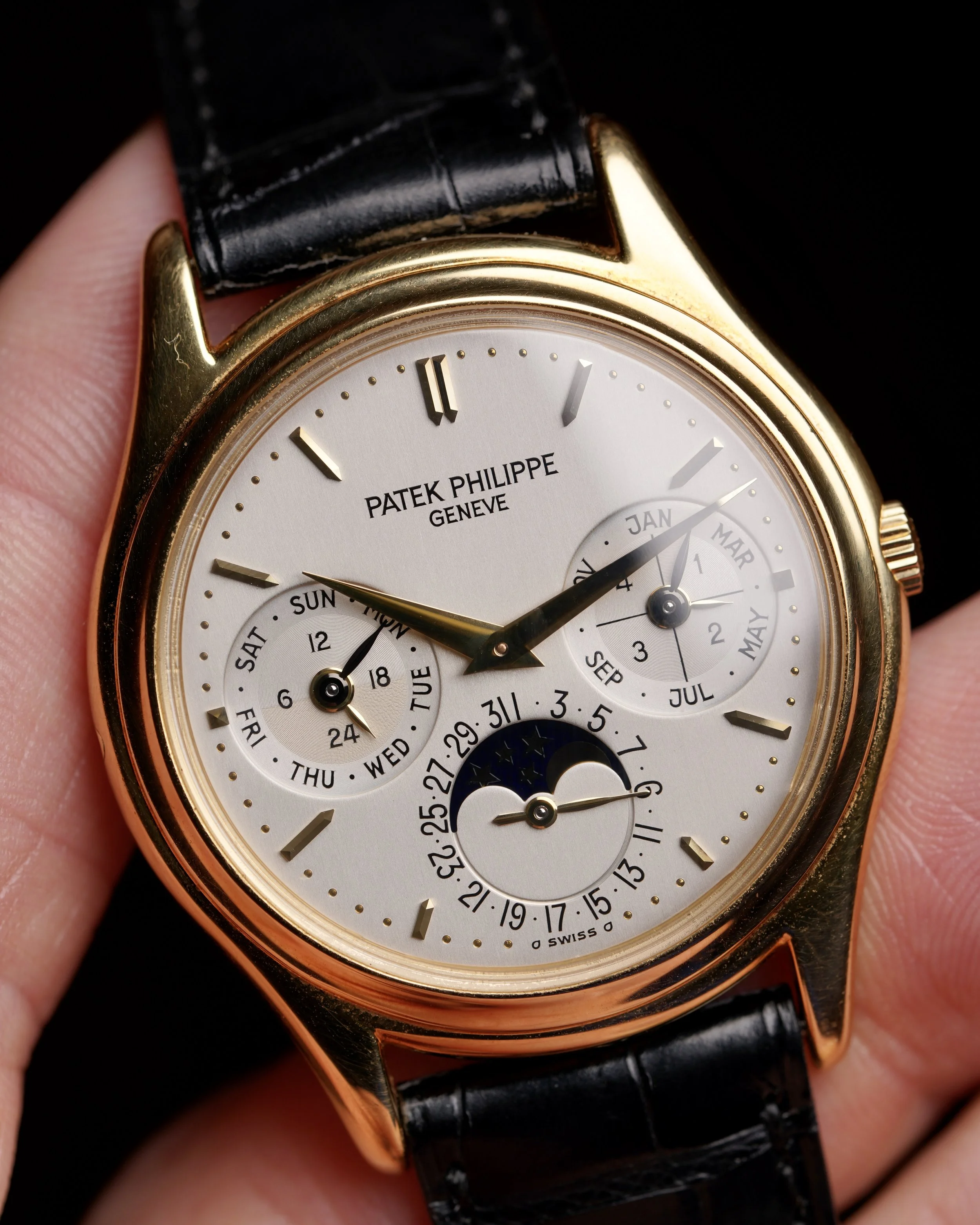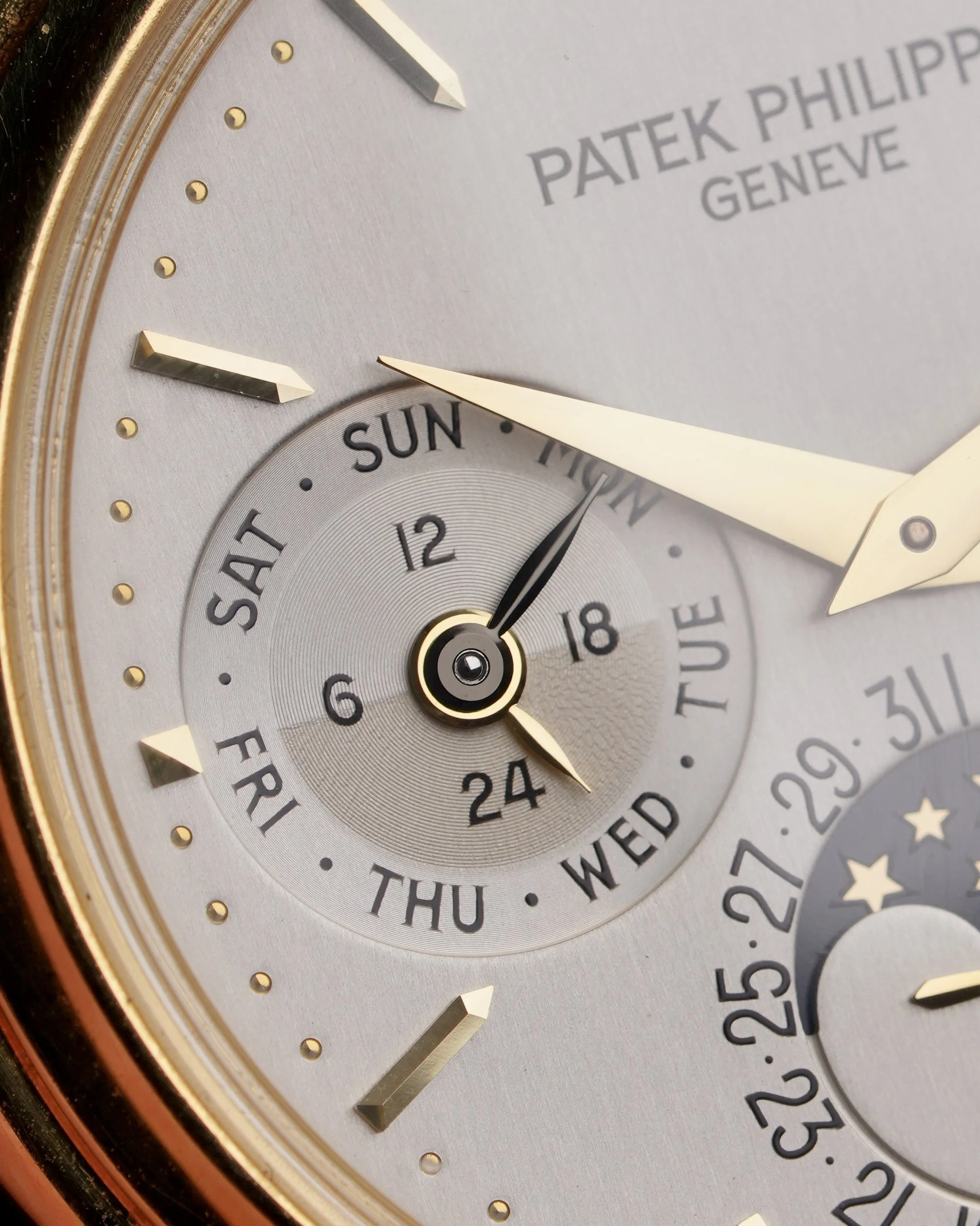 The Patek Philippe reference 3940 perpetual calendar is one of the most important and elegant complicated timepieces one can find from any manufacturer. This particular example is in yellow gold featuring a later 2nd series dial. Purportedly these dials began in circa 1989 or around movement number 771.500. This movement is 553 away from the cited number (maybe a few months). As we know, the Patek movements were not cased sequentially. We believe the dial was born in the watch. It comes from a Patek dealer in Fl via the original owner. The calendar/dial is in English. It is in fantastic condition. The bottom half of the 24-hour register has a beautiful slightly-beige hue from 6:00 PM to 6:00 AM. This watch features the iconic self-winding microrotor calibre 240Q.
